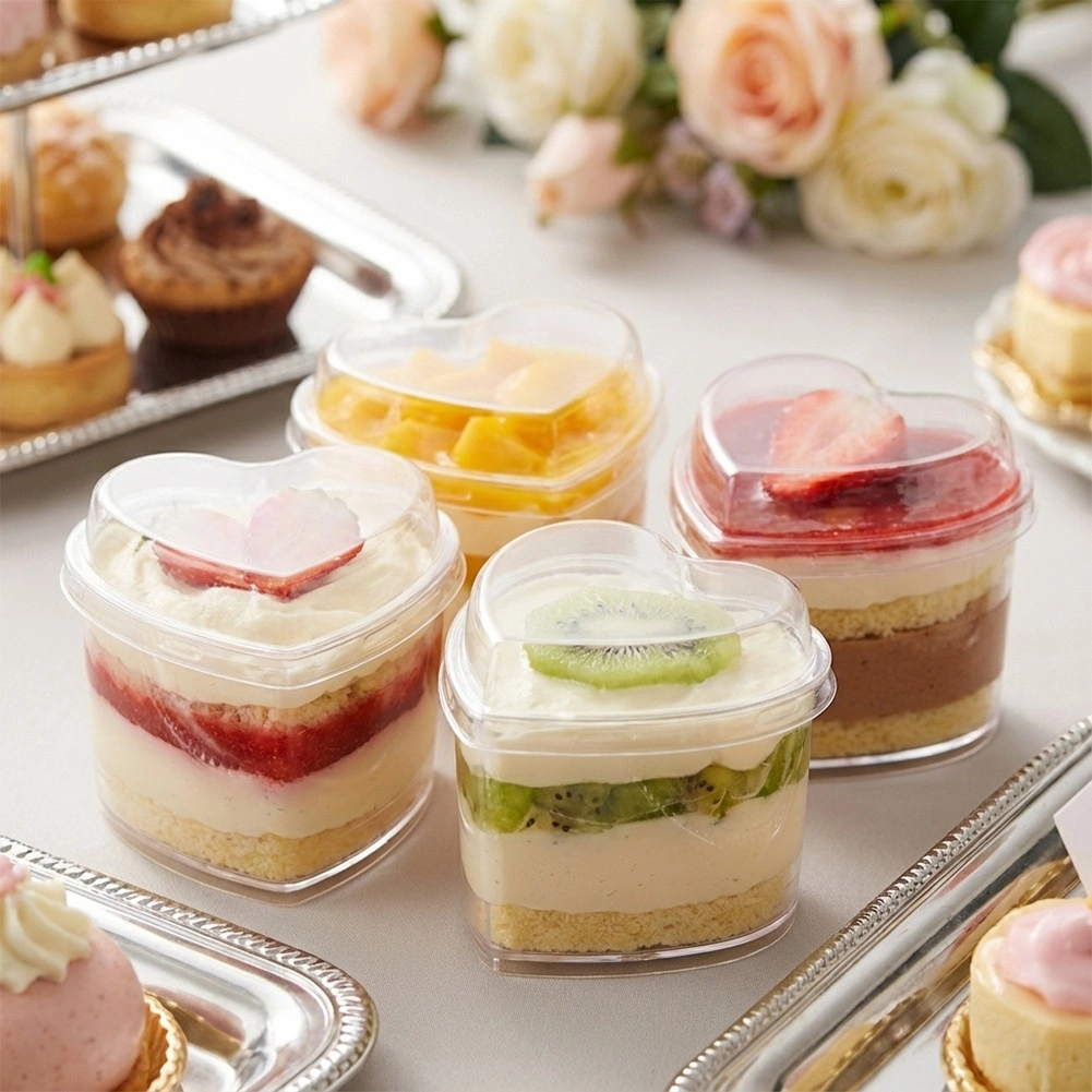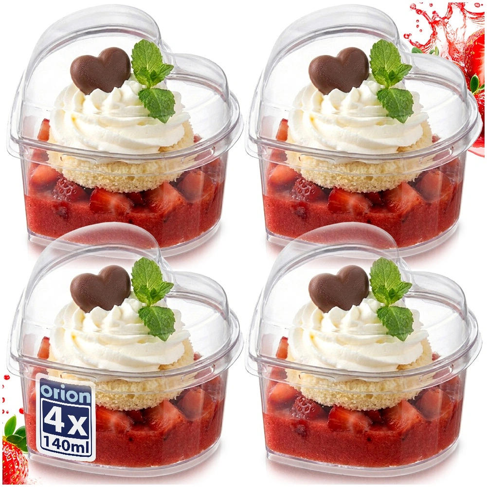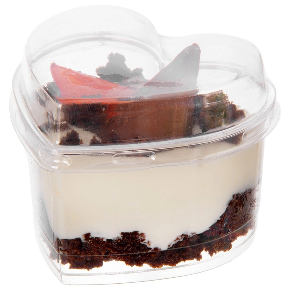 Elegantne prozorne posodice v obliki srca s pokrovčki s prostornino 130 ml so idealne za deserte in slane prigrizke. Zahvaljujoč čvrstemu materialu (odpornost do 60 °C) in praktičnemu zapiranju so odlične za poroke, zabave, catering in otroška praznovanja. Higiensko serviranje in lepa predstavitev plasti poskrbita za učinek na vsaki mizi.