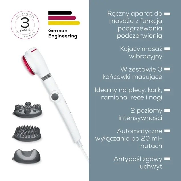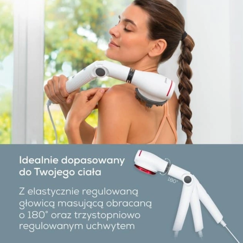 Zahvaljujoč veliki masažni in grelni površini ter vrtljivi glavi v razponu 180° zlahka dosežete tudi težje dostopna mesta. Trije kakovostni masažni nastavki omogočajo prilagoditev masaže vašim potrebam – od ploščinske do točkovne.