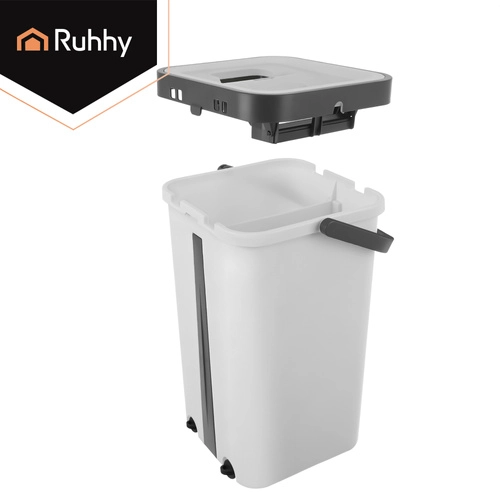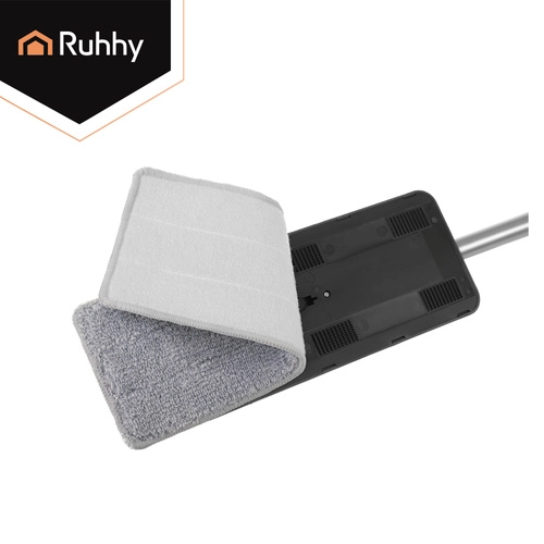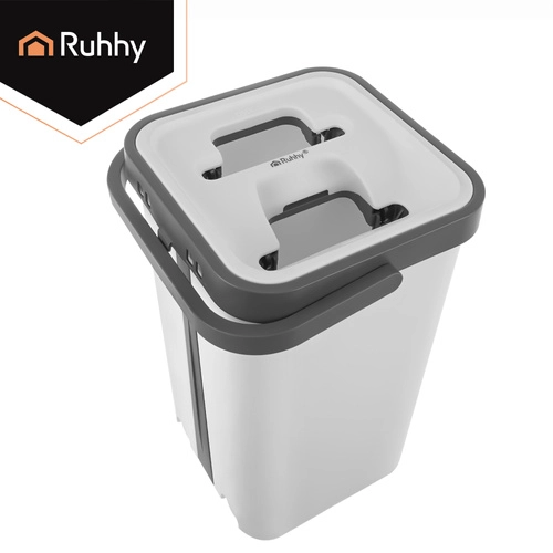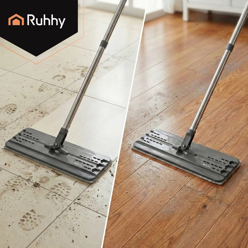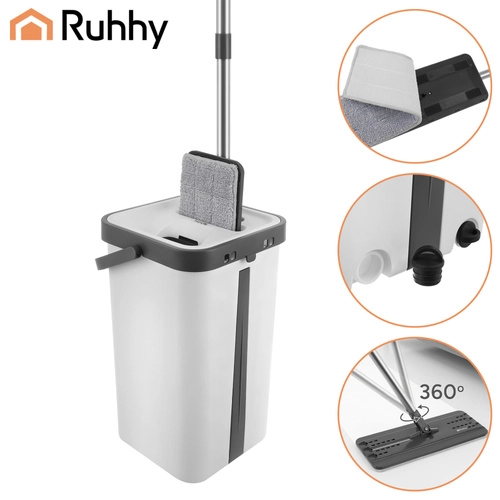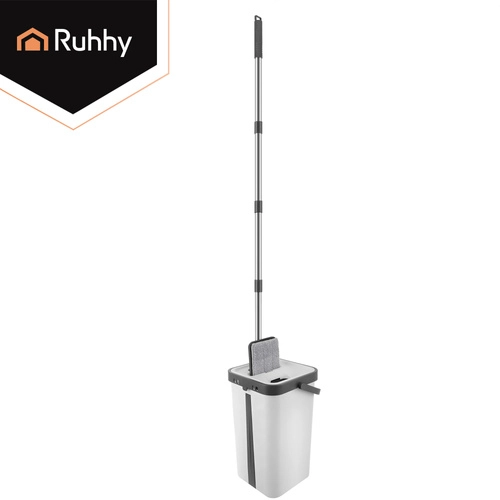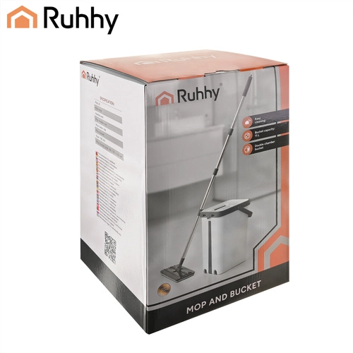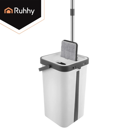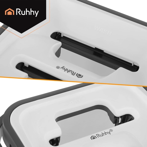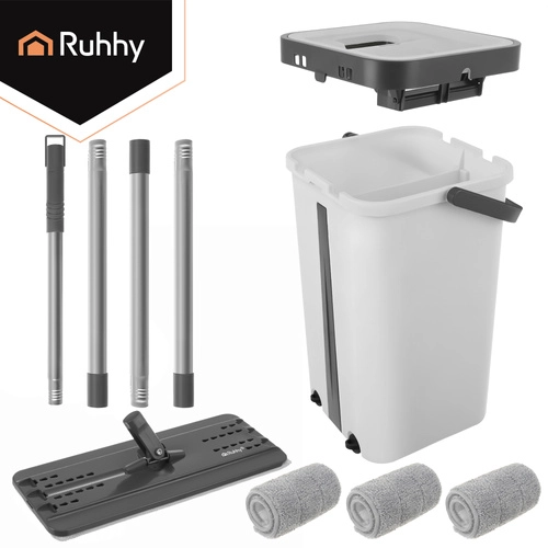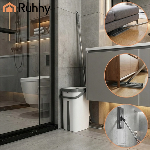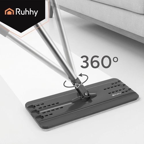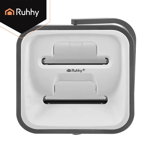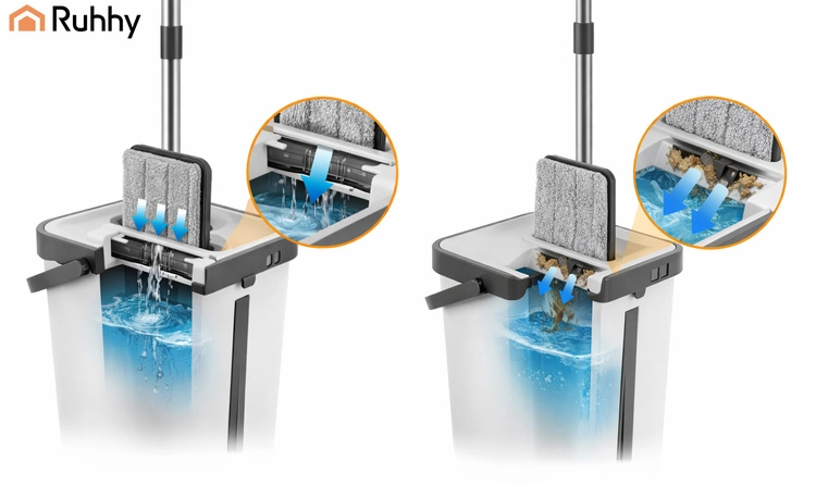 Set RUHHY združuje veliko dvo-komorno vedro za ločeno izpiranje in ožemanje, zato ne vračate nečistoč nazaj na tla. Brezstični sistem uravnava vlažnost mopa brez kapljanja in je nežen do občutljivih talnih oblog.