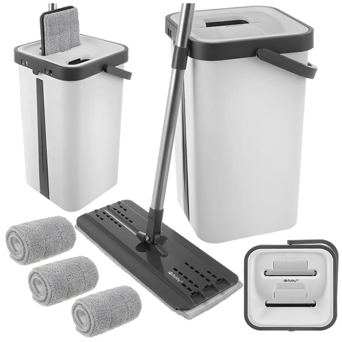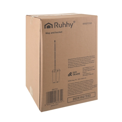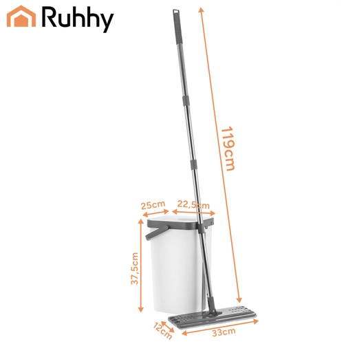 Praktični ploski mop RUHHY z dvo-komornim vedrom 11 l vam zagotovi higiensko pomivanje vedno s čisto vodo. Zahvaljujoč brezstičnemu ožemanju bodo roke suhe, tla pa brez lis. Vrtilna glava 360° doseže pod pohištvo in v kote, 3 hitro sušeče prevleke pa omogočajo neprekinjeno čiščenje.