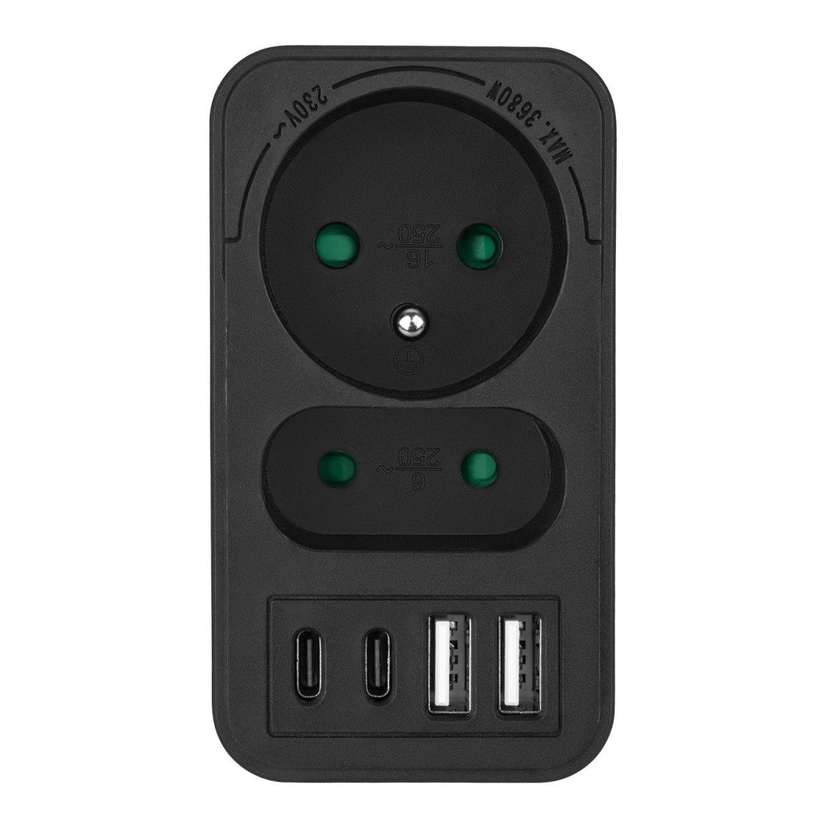 Pametna rešitev za dom in pisarno: kompakten stenski adapter združuje klasično napajanje prek 230 V s štirimi zmogljivimi USB izhodi. Na voljo je 1 ozemljena schuko vtičnica za naprave z večjo porabo in 1 ploska euro vtičnica za manjšo elektroniko. Sočasno polnjenje več naprav je tako preprosto in pregledno.