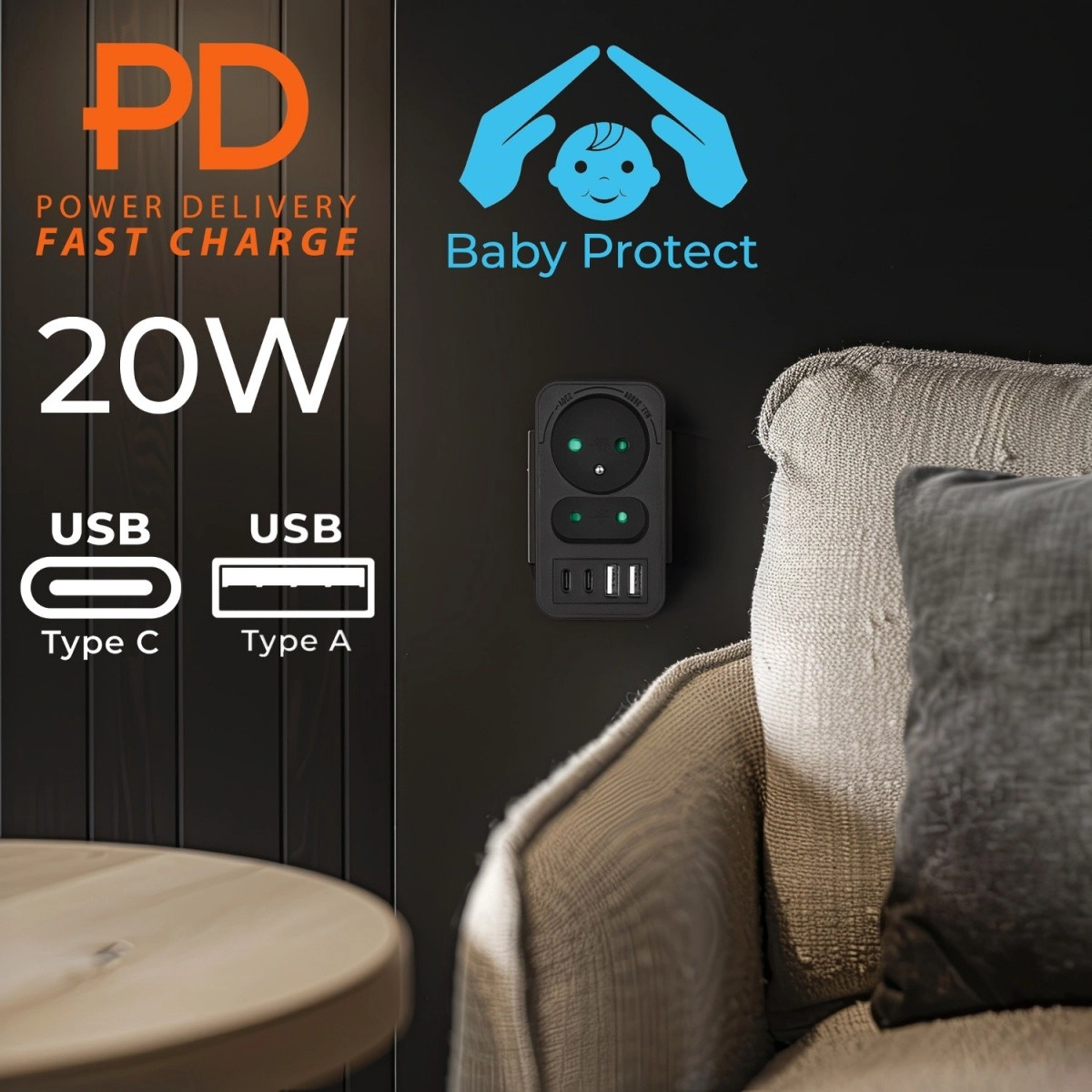USB del ponuja 2× USB‑A (do 3 A / 18 W) za dodatno opremo in 2× USB‑C s PD (do 20 W) za hitro in stabilno polnjenje sodobnih pametnih telefonov in tablic. Zahvaljujoč vgrajeni zaščiti je polnjenje varno in učinkovito, idealno za dnevno sobo, delovno sobo in spalnico.