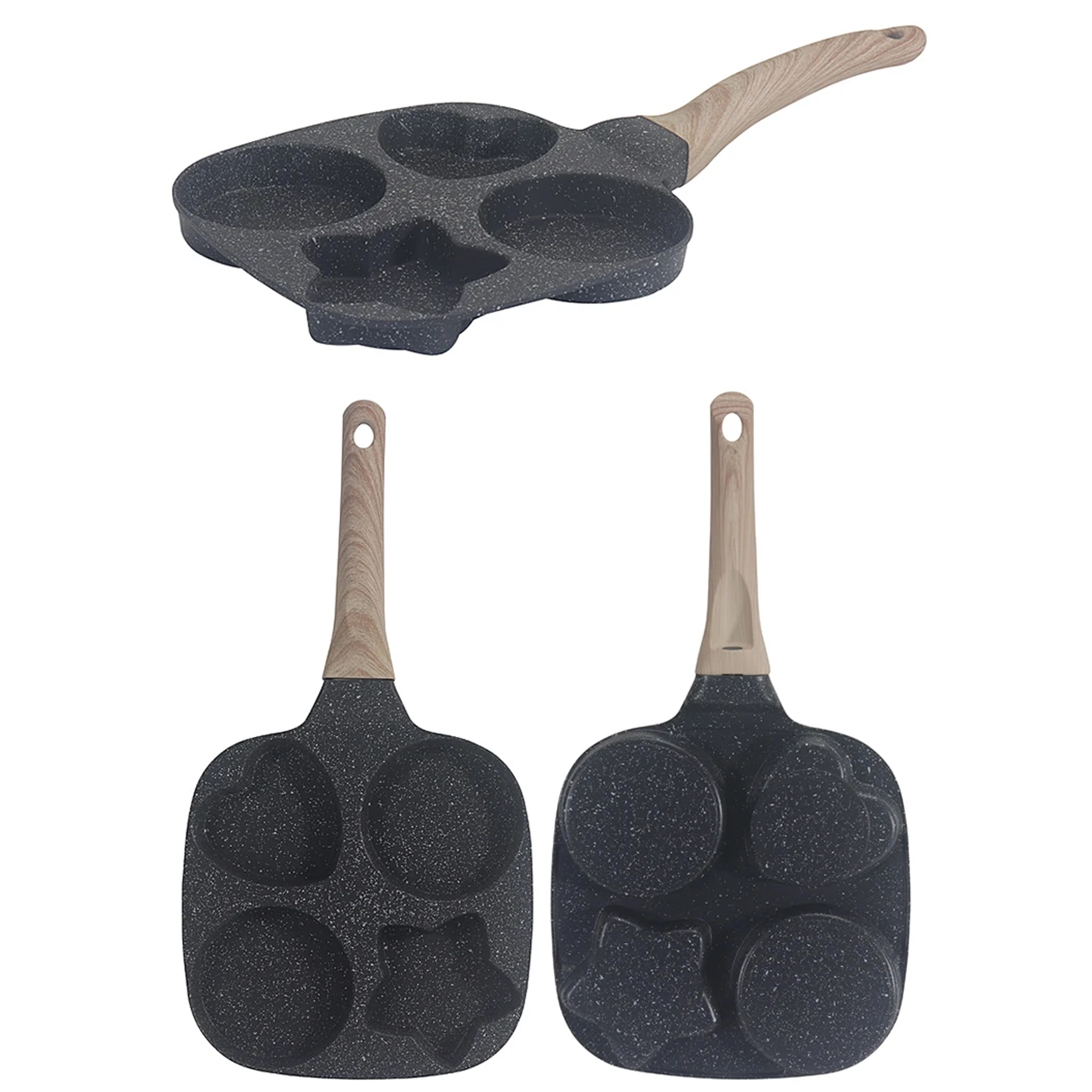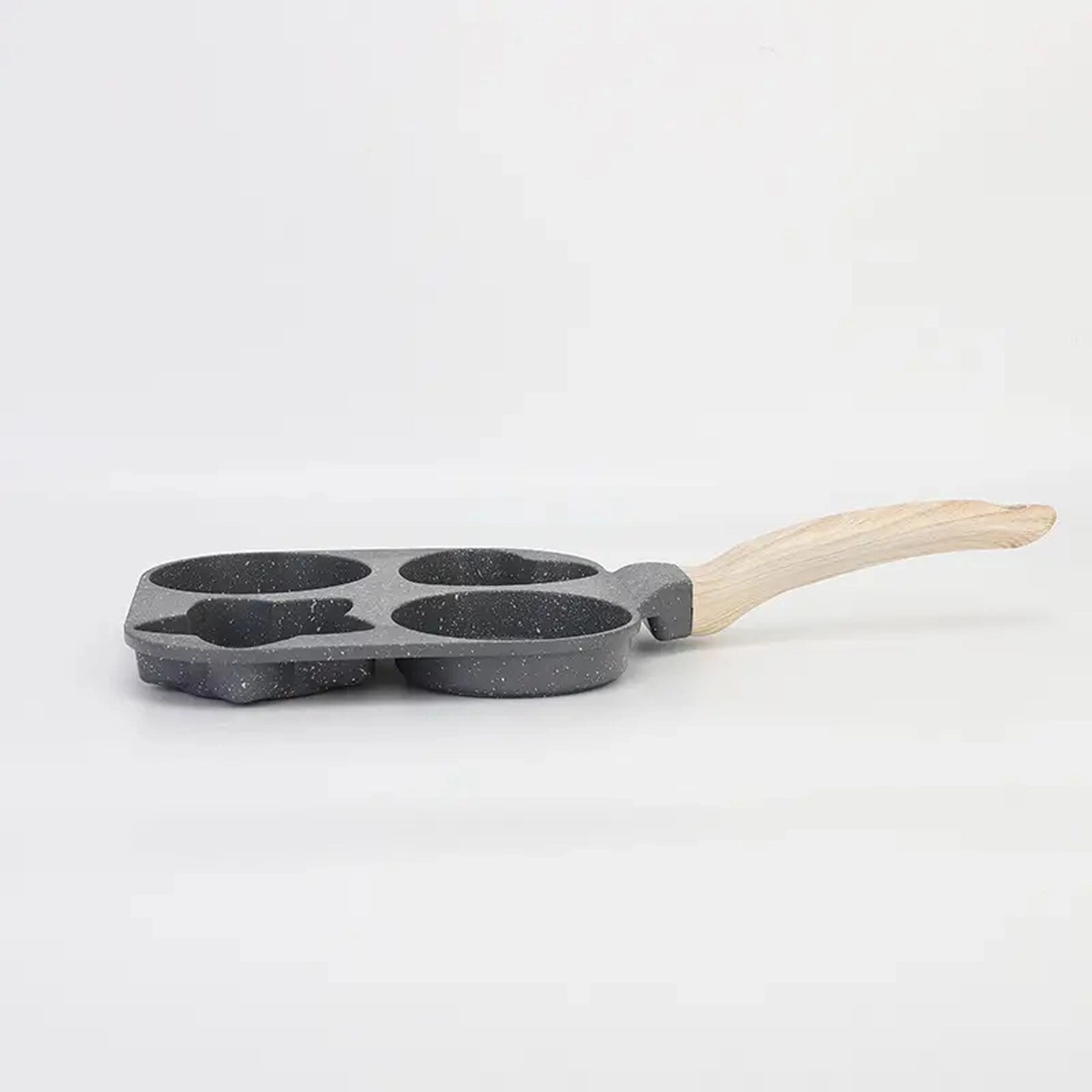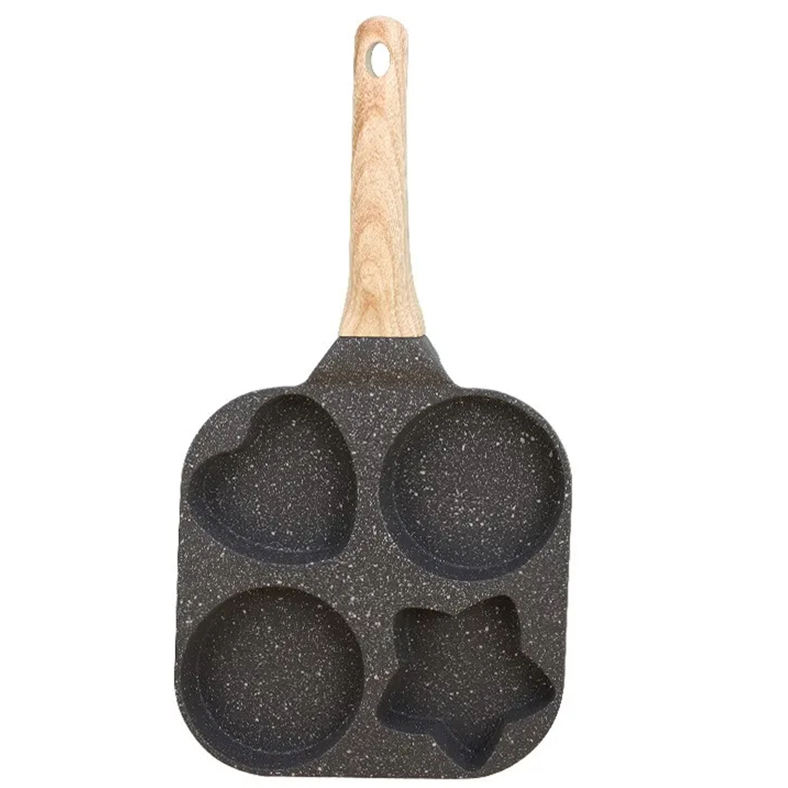 Ta praktična ponev s štirimi poglobljenimi oblikami omogoča pripravo več porcij hkrati – idealno za jajčka, palačinke, krompirjeve polpete ali majhne pleskavice. Oblikovane sekcije (2× okrogla, 1× srce, 1× zvezda) ustvarjajo zabavne in enakomerno pečene porcije, ki bodo razveselile otroke in odrasle.