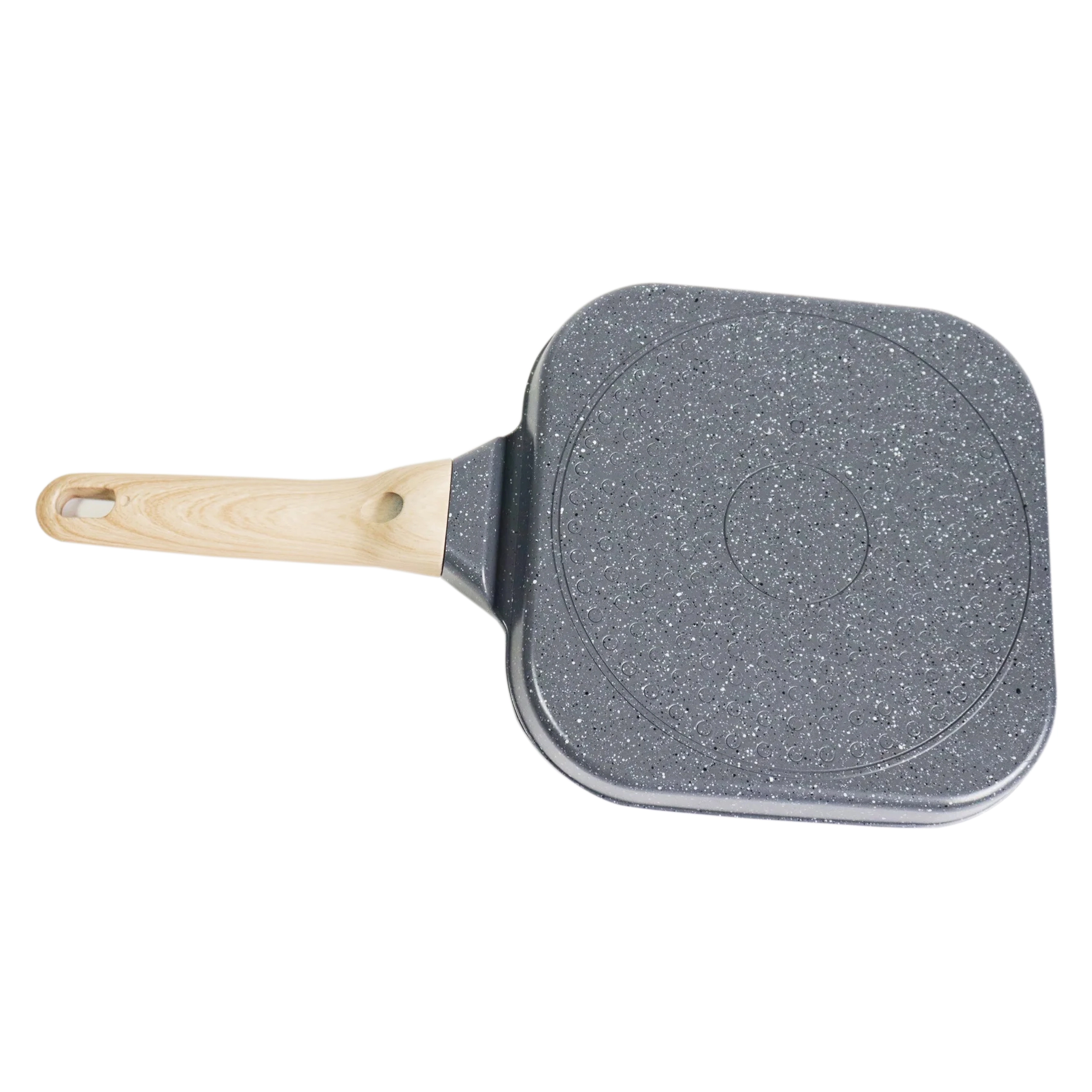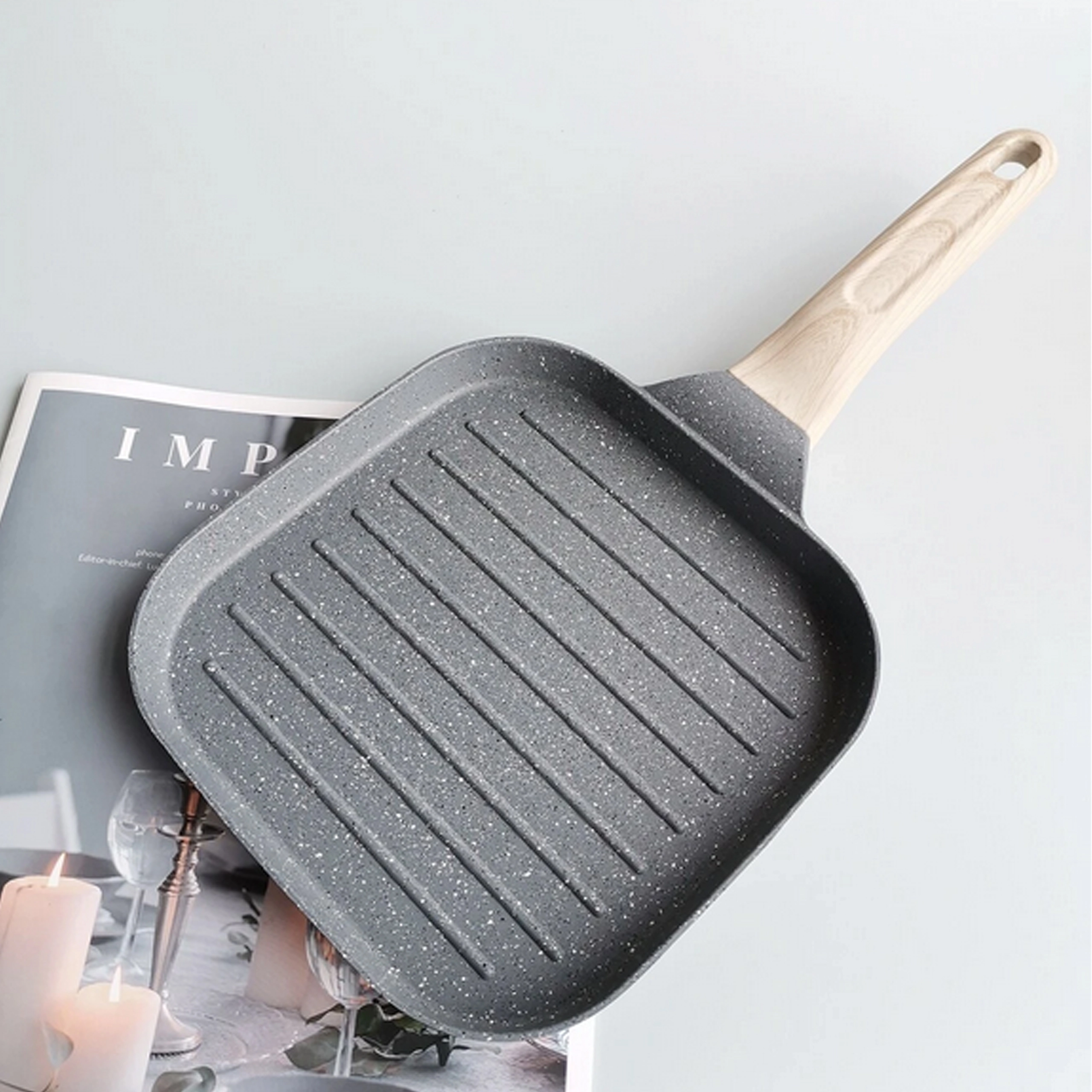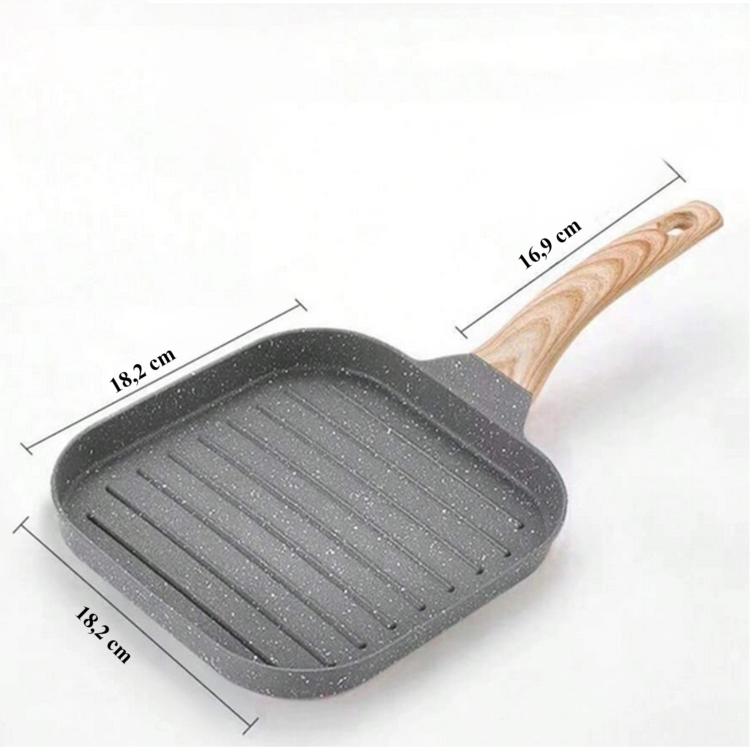 Kvadratna žar ponev z nelepljivo površino in lesenim videzom ročaja
