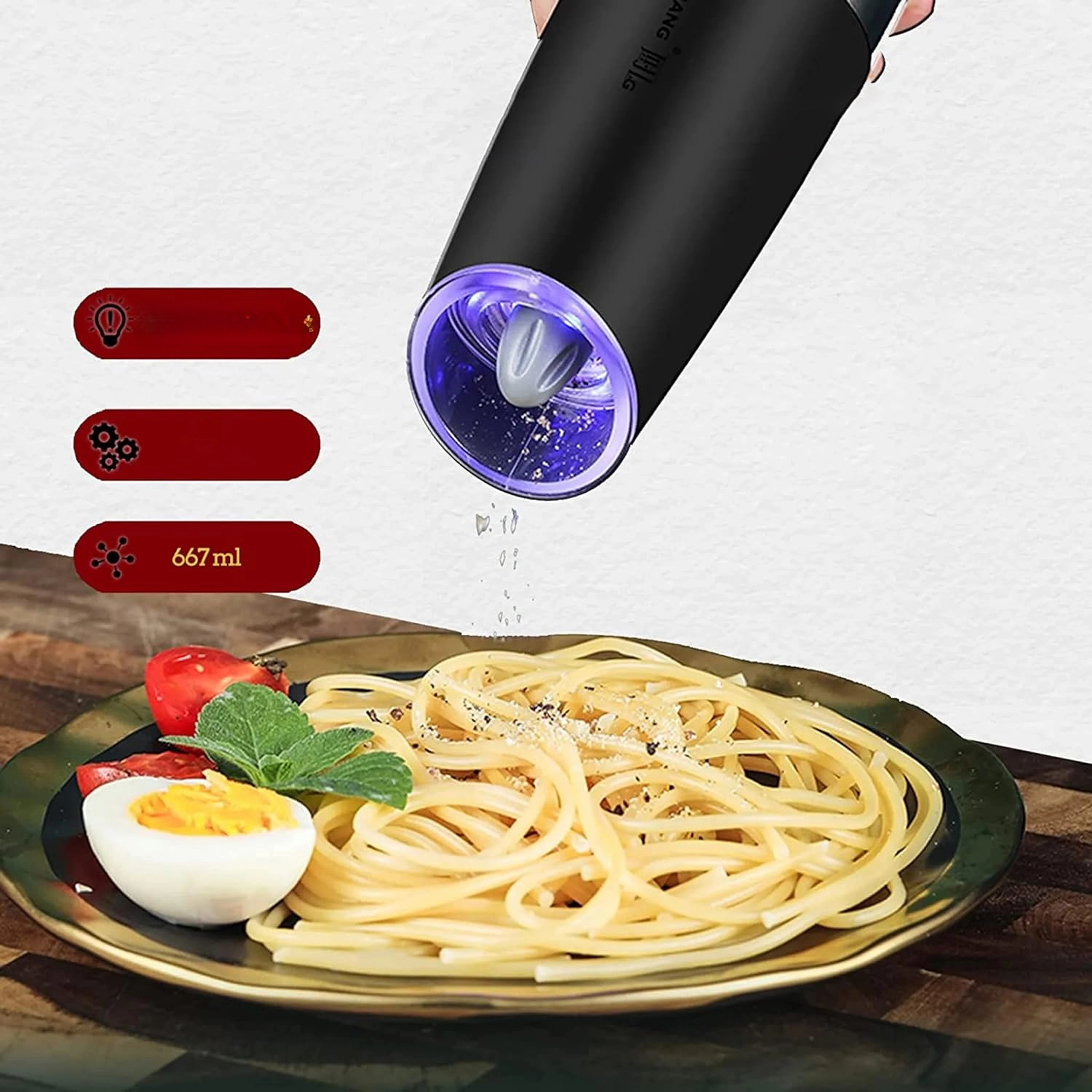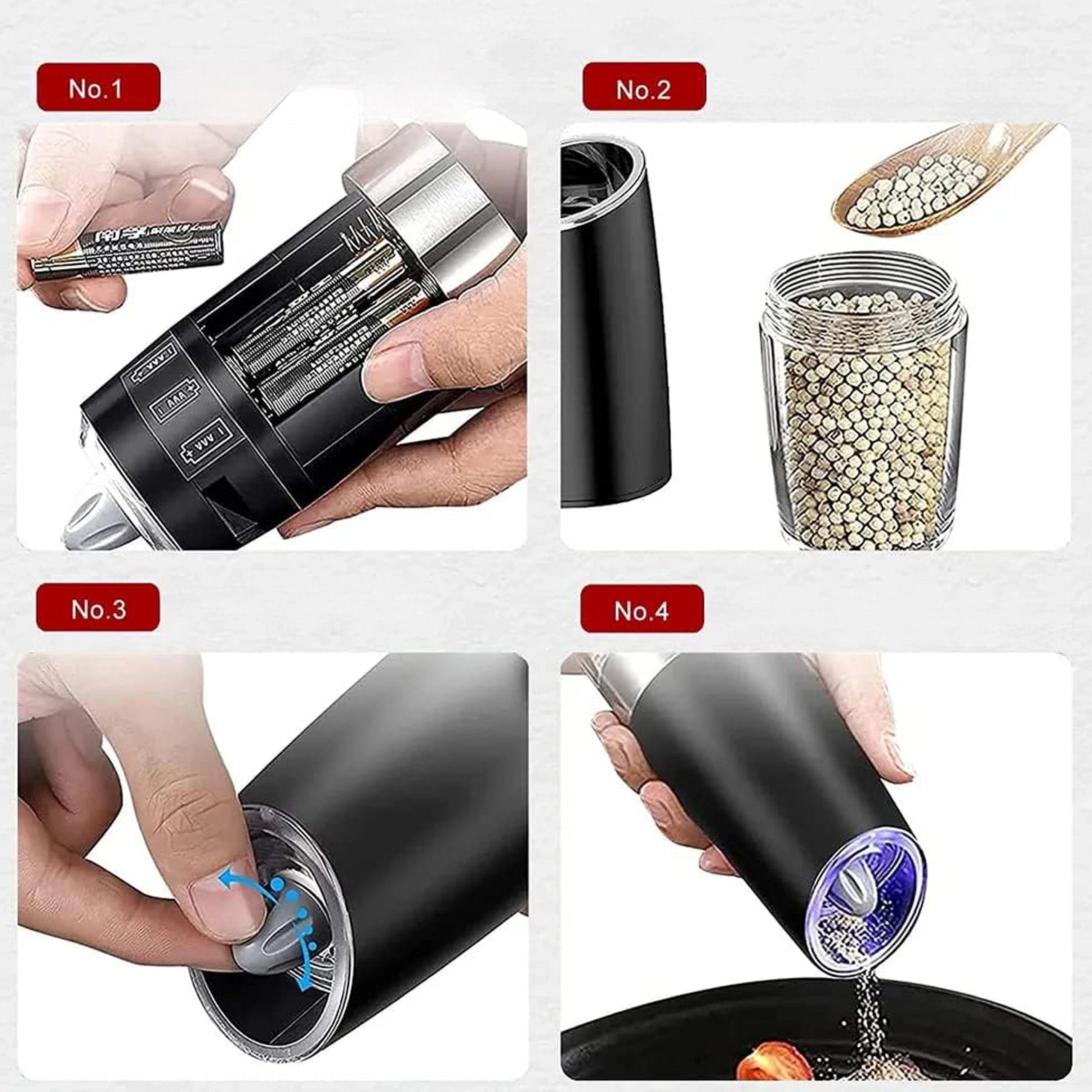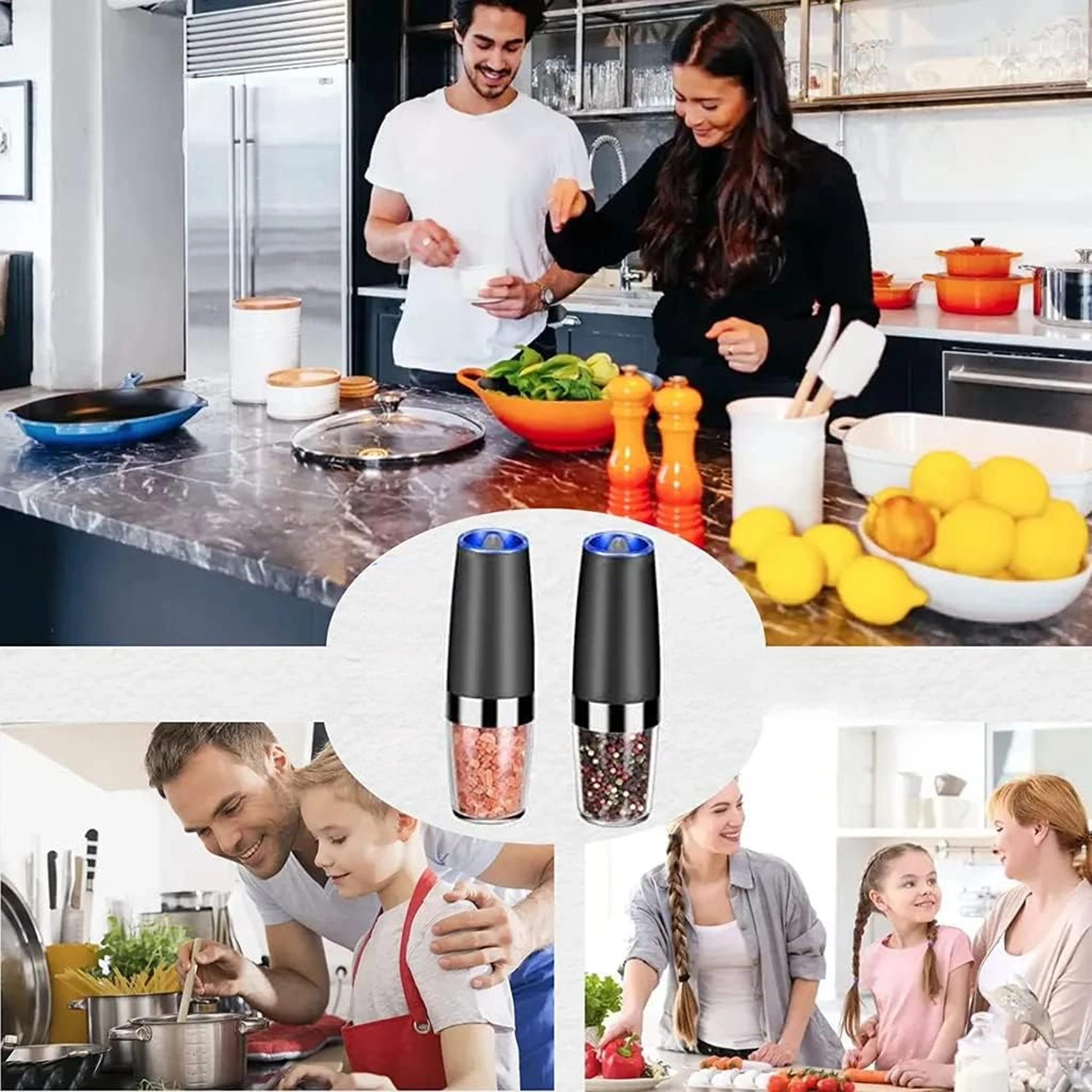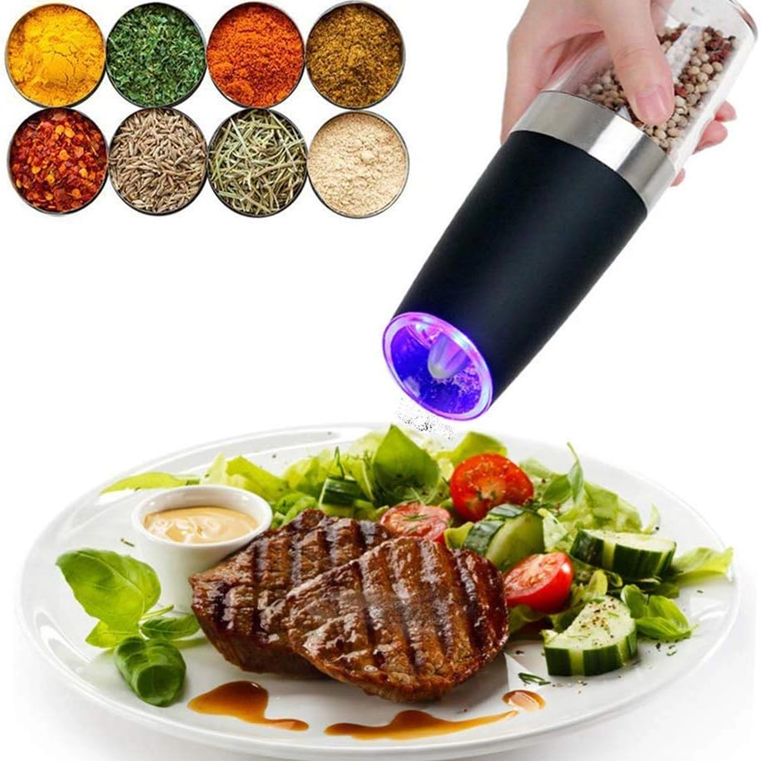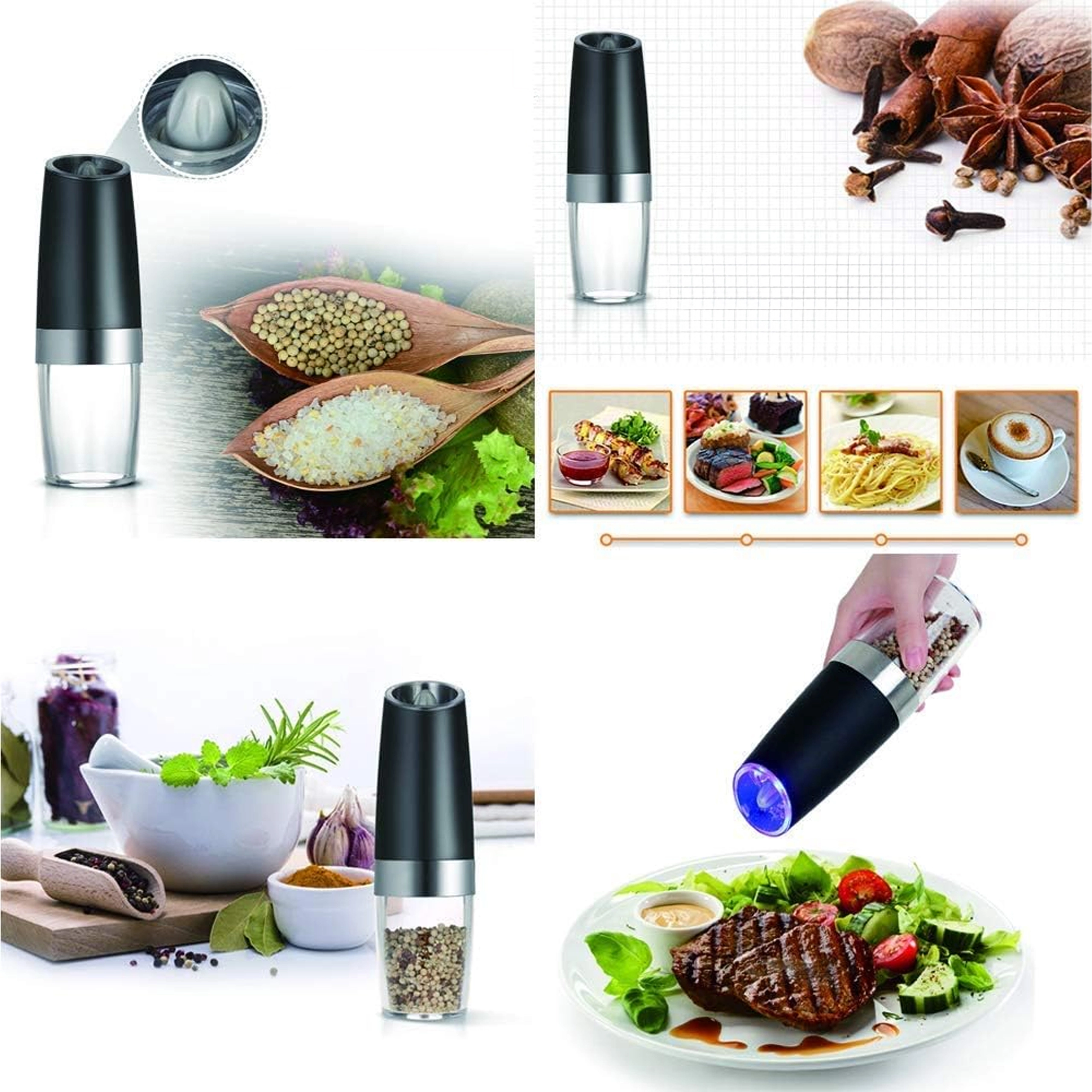 Odkrijte udobje vsakodnevnega začinjanja s kompletom dveh električnih gravitacijskih mlinčkov. Dovolj je, da ju nagnete, in sveže zmeljeta sol, poper ali druge začimbe – brez pritiskanja gumbov. Prozoren zalogovnik za enostaven nadzor, nastavljiva grobost mletja in vgrajena LED osvetlitev za natančno doziranje naredijo te mlinčke za eleganten in praktičen dodatek vsaki kuhinji. Samodejno mletje, upravljanje z eno roko, LED svetloba in moderen dizajn za vašo kuhinjsko površino.