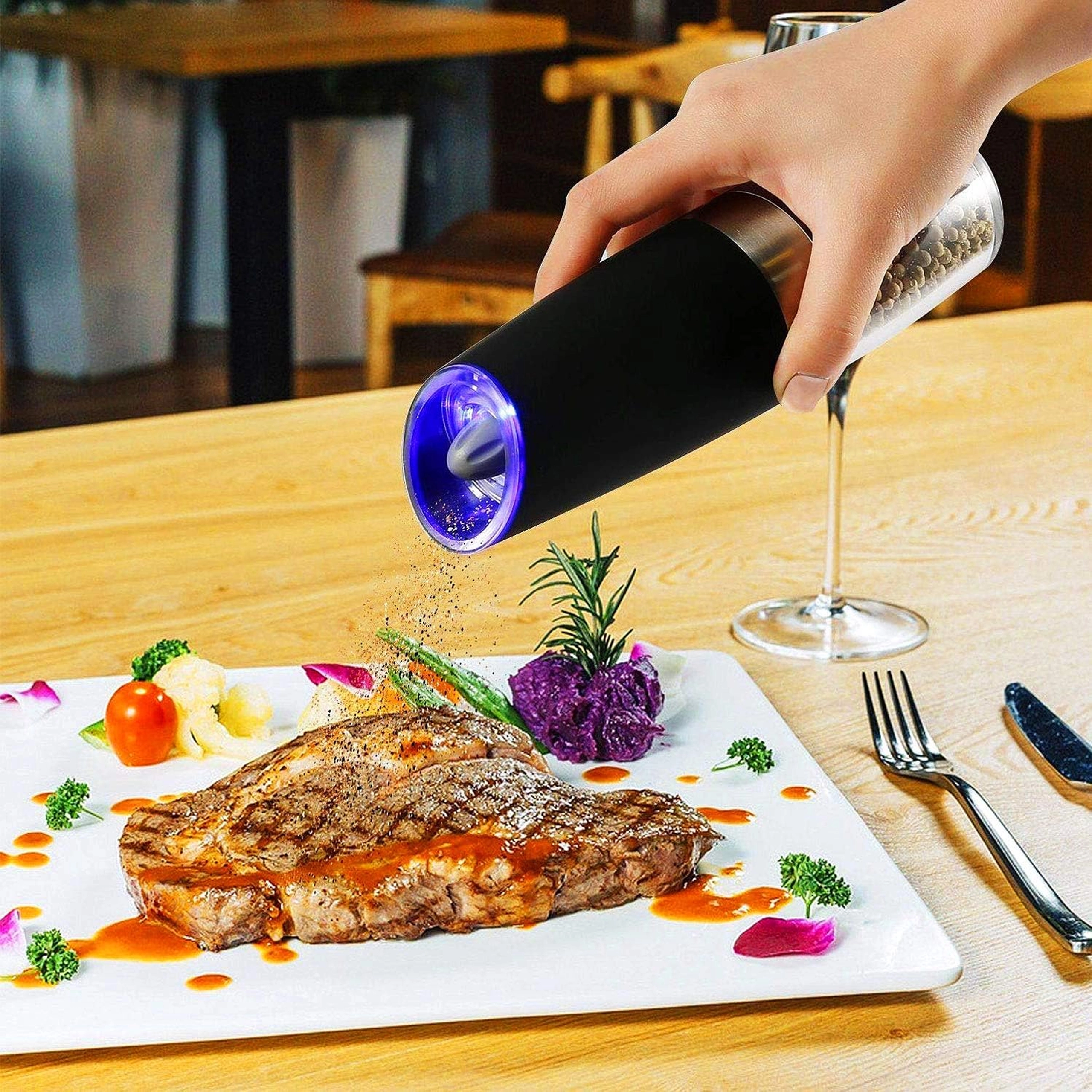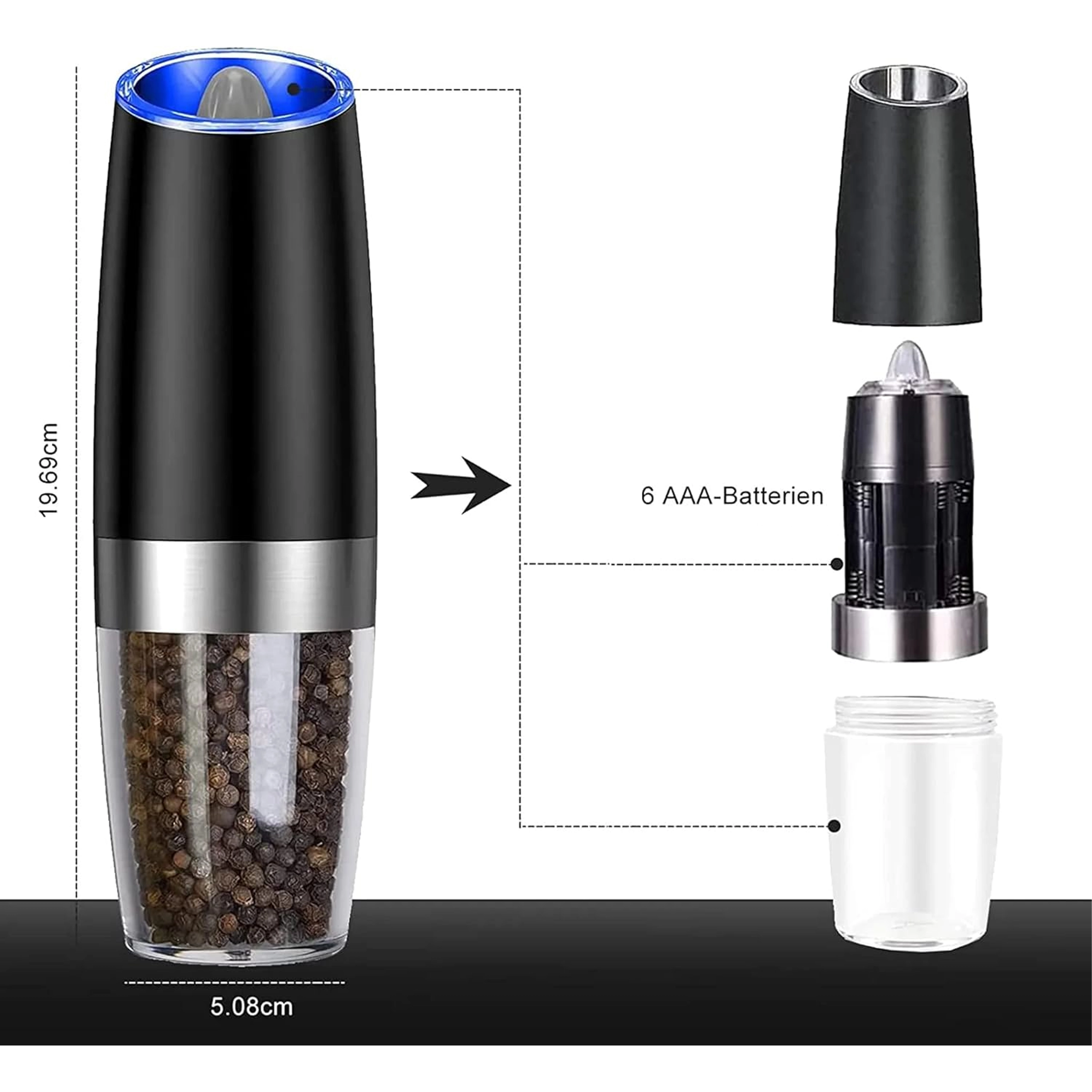 Vgrajena modra LED svetloba med mletjem osvetli porcijo, zato zlahka vidite količino začimb tudi v polmraku.
