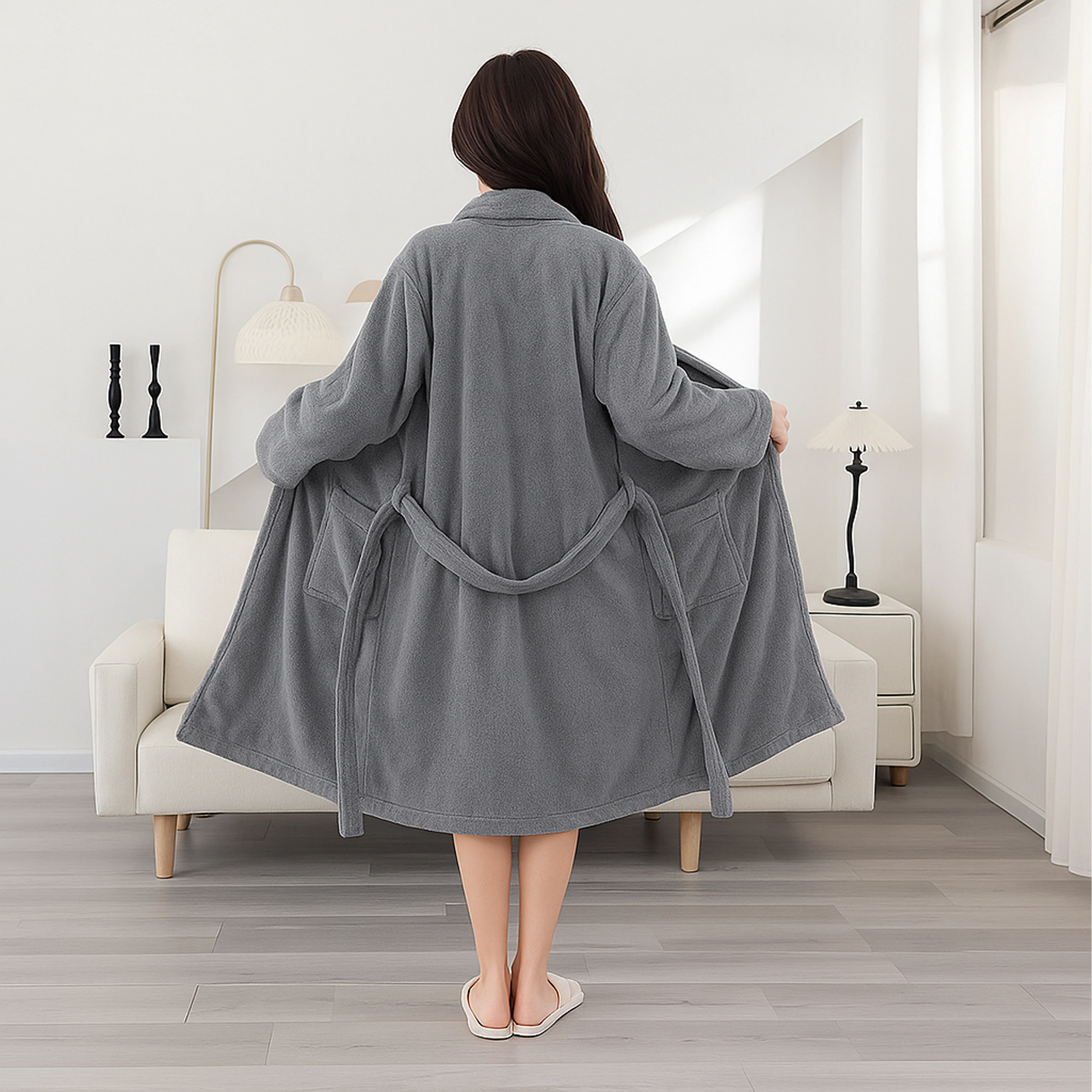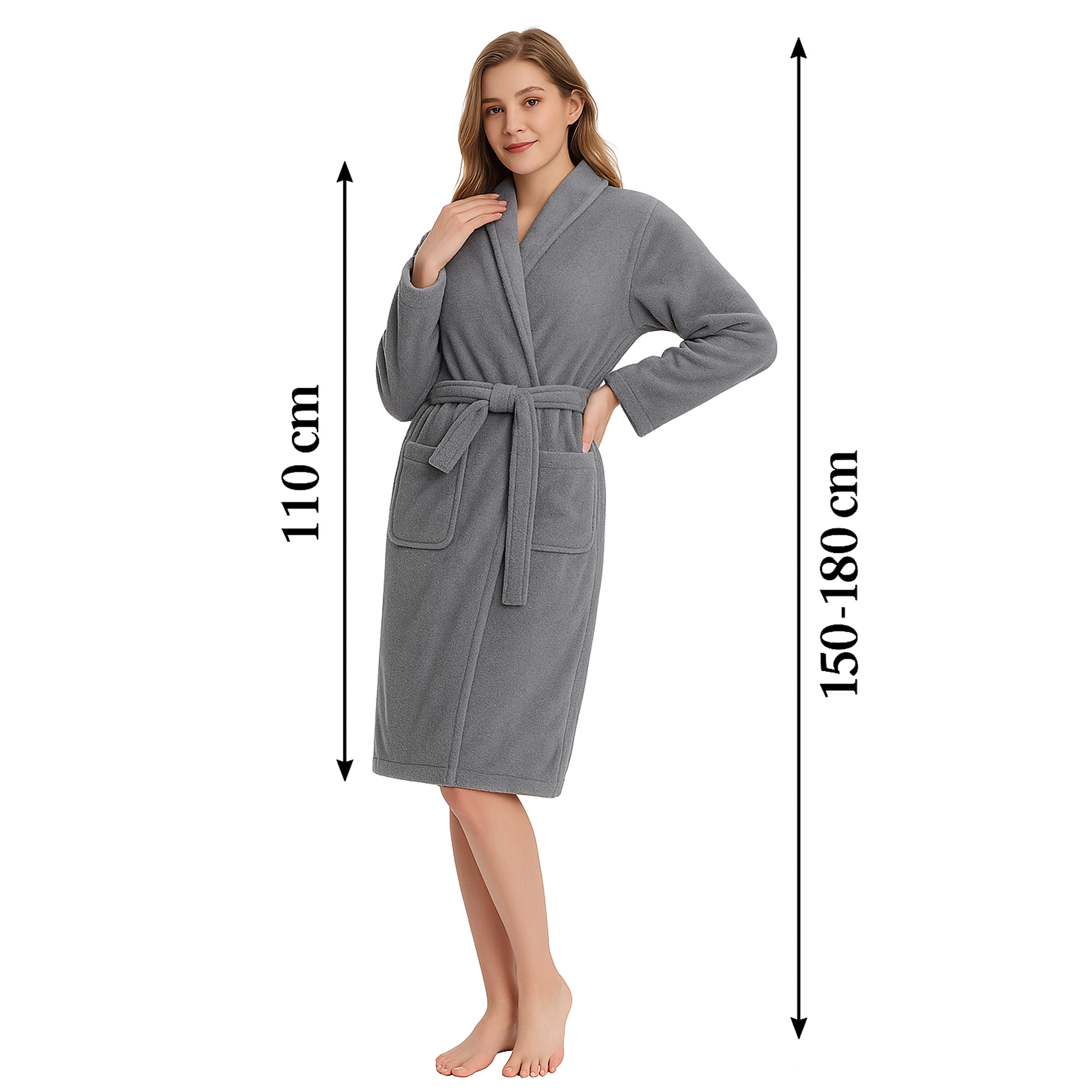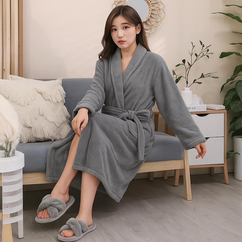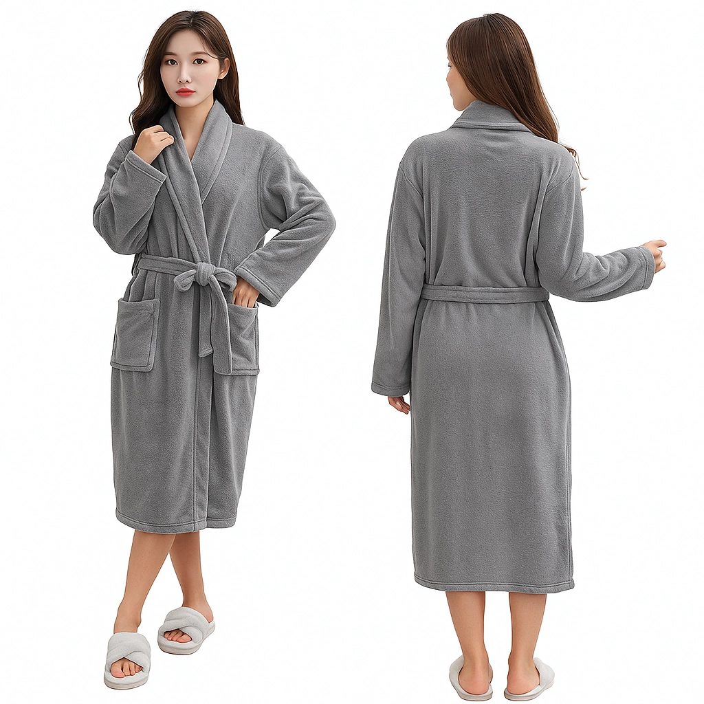 Ta ženski kopalni plašč v elegantni sivi barvi je idealen za trenutke počitka doma in po prhanju. Mehka plišasta mikrovlakna vas prijetno ogrejejo, medtem ko šal ovratnik in pas v pasu poudarita udoben kroj ter omogočata enostavno prilagoditev postavi.