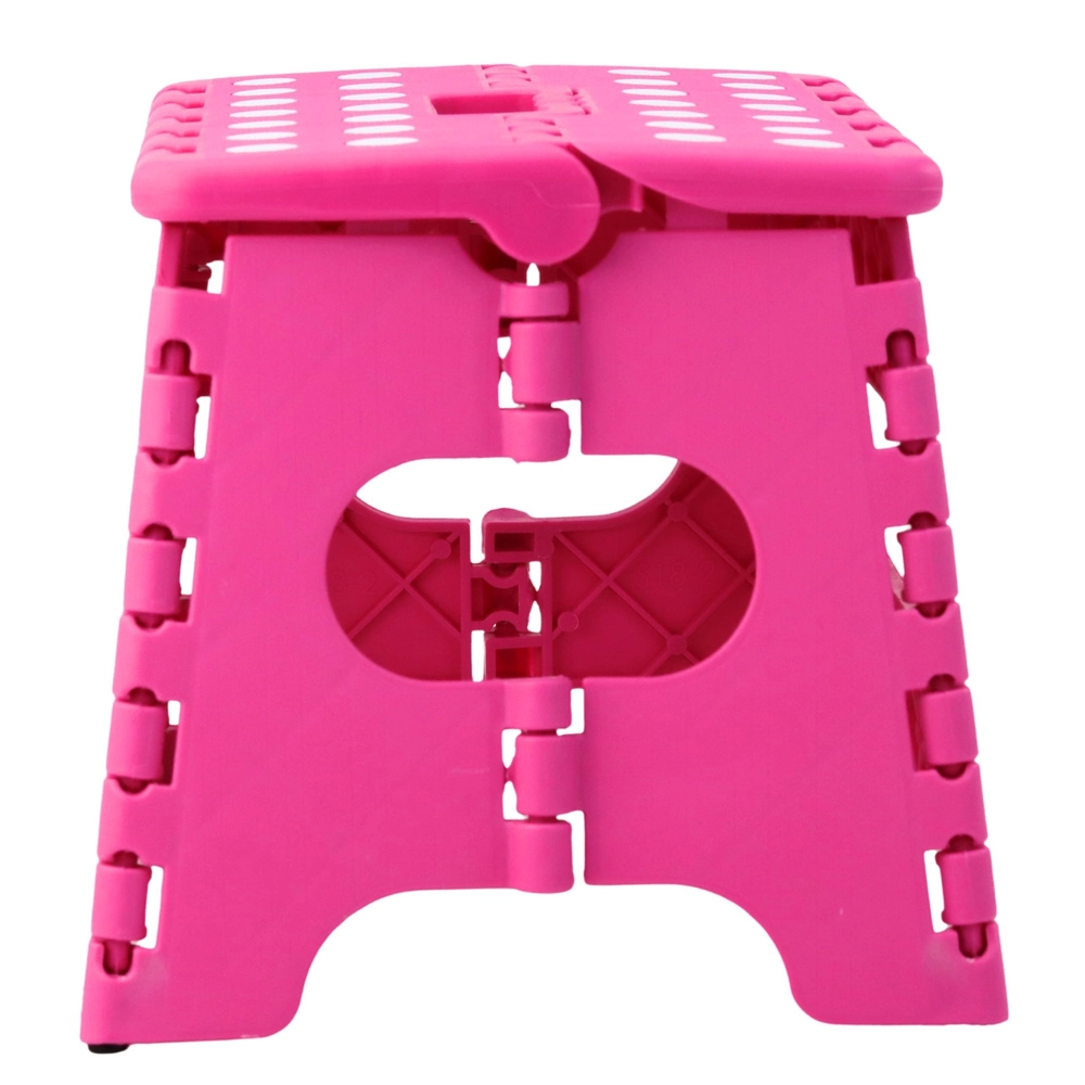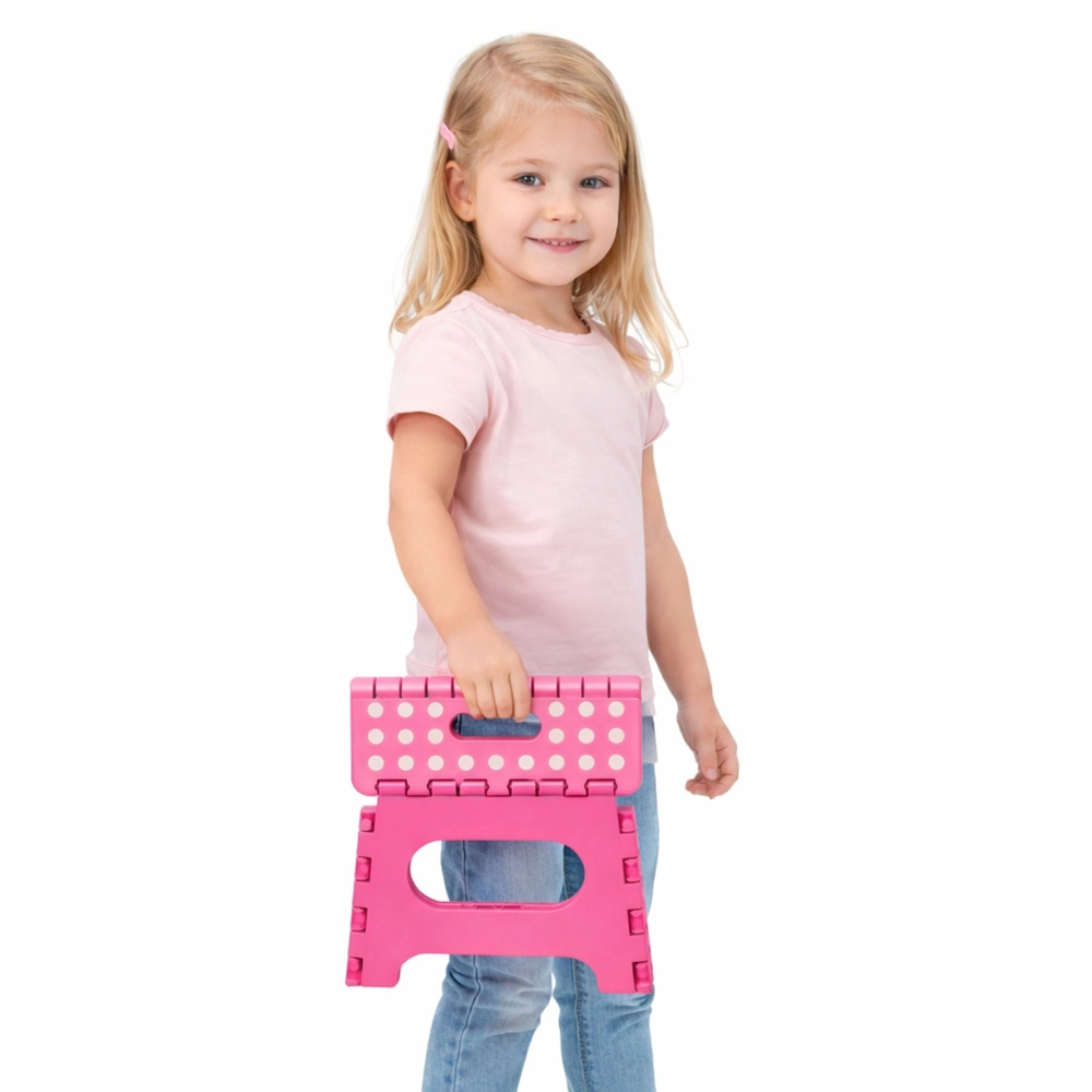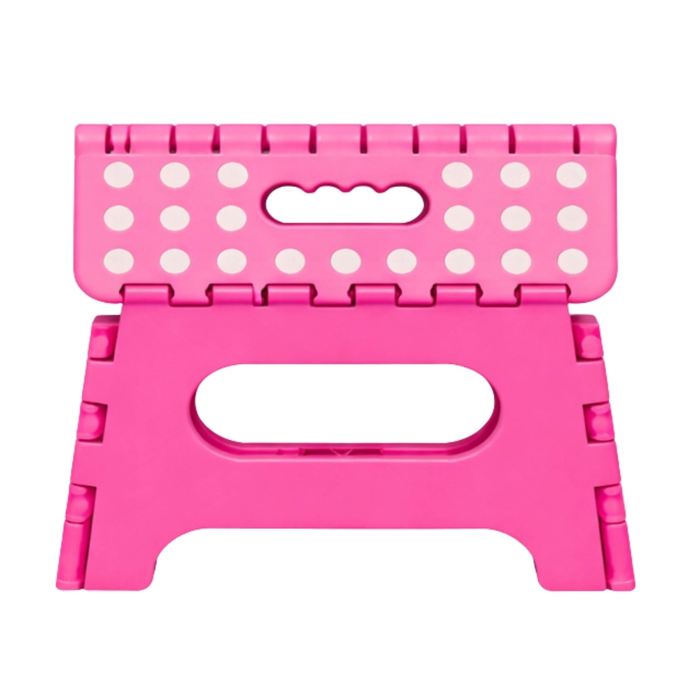 Roza zložljiva stopnička je izdelana iz trpežne plastike, ki zagotavlja trdnost in dolgo življenjsko dobo. Protizdrsna zgornja površina s pikami povečuje varnost pri uporabi, tudi v vlažnem okolju. Integriran ročaj omogoča hitro prenašanje in preprosto zlaganje v ploščato obliko za varčno shranjevanje.