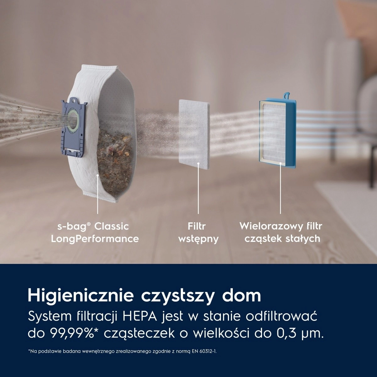 Uživajte v temeljitem čiščenju brez kompromisov. Nastavek Dust Magnet Silent je zasnovan za maksimalno učinkovitost na trdih tleh in preprogah ter dosega zajem do 100 % prahu v fugah*. Napredni HEPA filter zadrži drobne delce velikosti 0,3 μm, vključno s prahom, pršicami in alergeni, zato doma dihate čistejši zrak.
