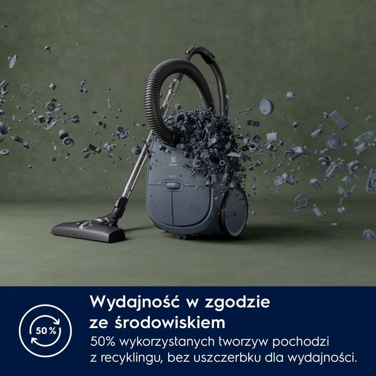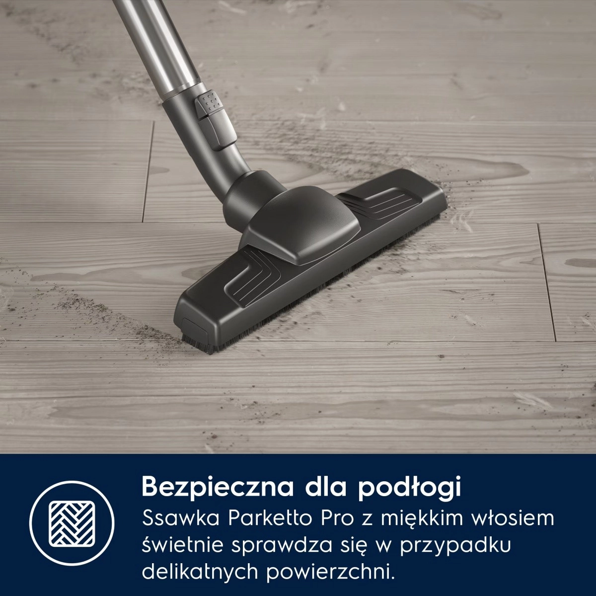 Praktično upravljanje z nogo vam omogoča spreminjanje moči, navijanje kabla ali vklop in izklop brez sklanjanja. Velika, lahko vodljiva kolesa zagotavljajo gladko premikanje po različnih vrstah tal, 12-metrski doseg pa zmanjšuje potrebo po preklapljanju vtičnic. Sesalnik je poleg tega okolju prijazen – do 50 % plastike je reciklirane, embalaža pa spoštuje okolje.