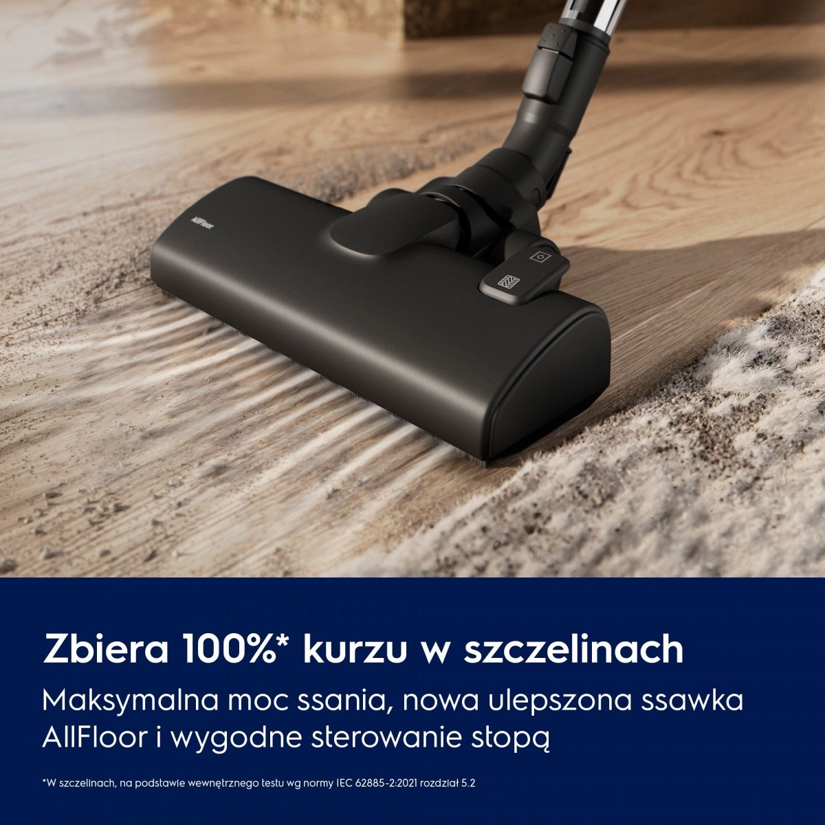 Sesalnik dosega visoko učinkovitost pobiranja prahu v režah, z novim nastavkom AllFloor pa zlahka očisti tako trde talne obloge kot preproge. Preklop ščetke udobno opravite z nogo.
