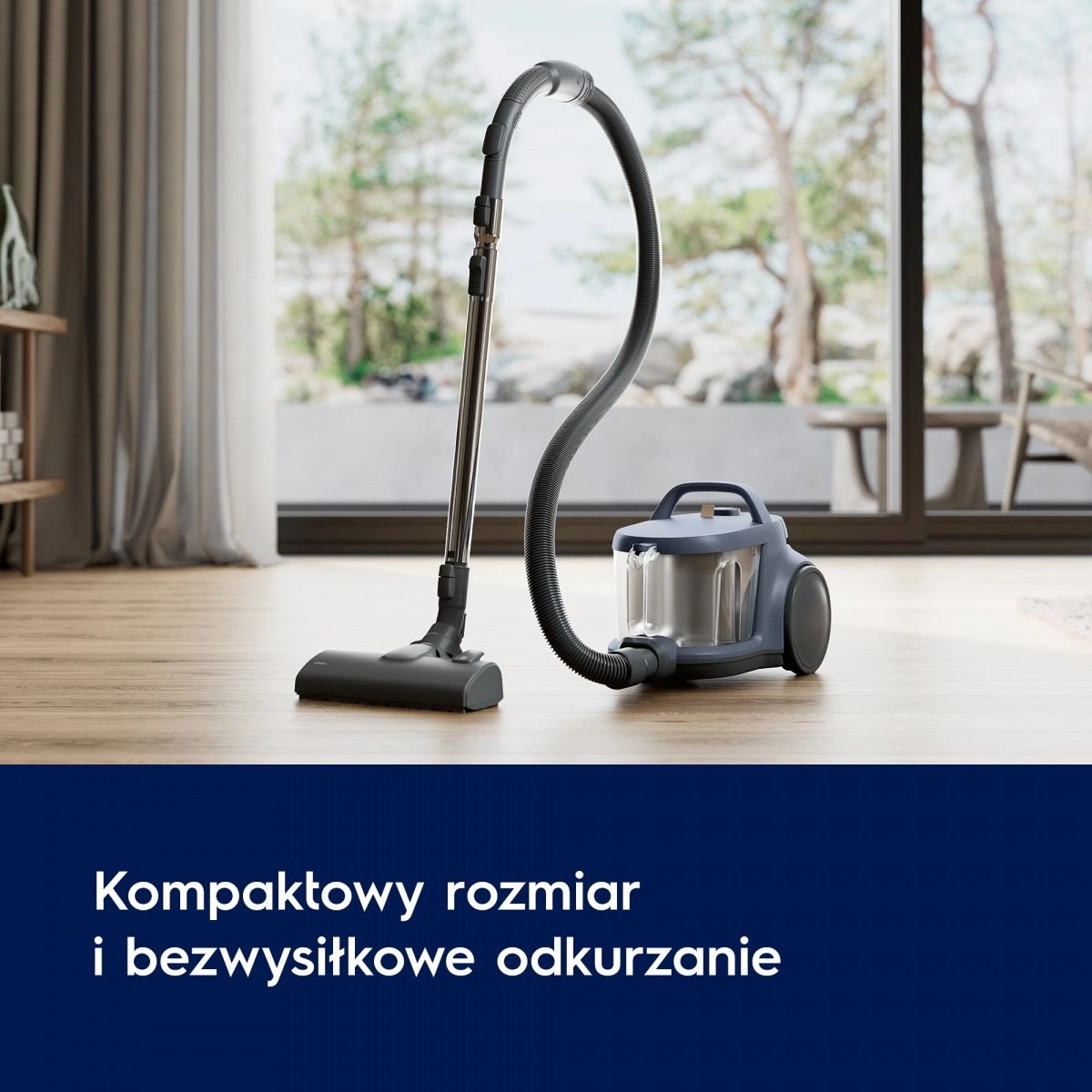 Kompaktno ohišje, velika kolesa in doseg 9 m olajšajo manevriranje in shranjevanje. HEPA filtrirni sistem zajame do 99,95 % delcev velikosti 0,3 μm, zato bo zrak v domu čistejši.