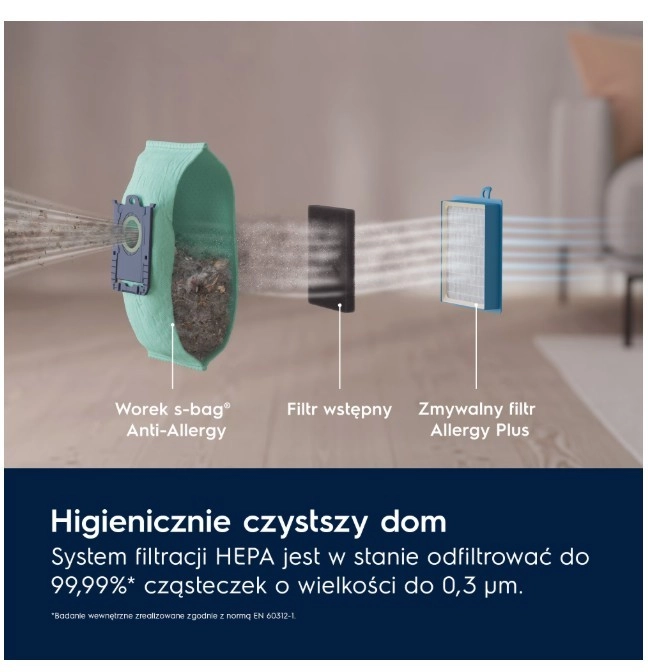 Uživajte v res tihem sesanju z glasnostjo le 57 dB(A) in pametno tehnologijo SmartMode, ki samodejno prilagodi sesalno moč glede na tip tal. Nova krtača OneGo Power Clean odlično pobira prah z preprog in trdih tal, HEPA filtracija pa zajame do 99,99 % finih delcev in alergenov za čistejši zrak v domu.