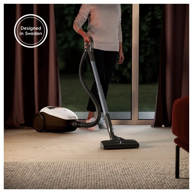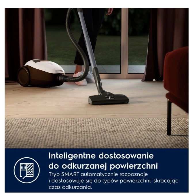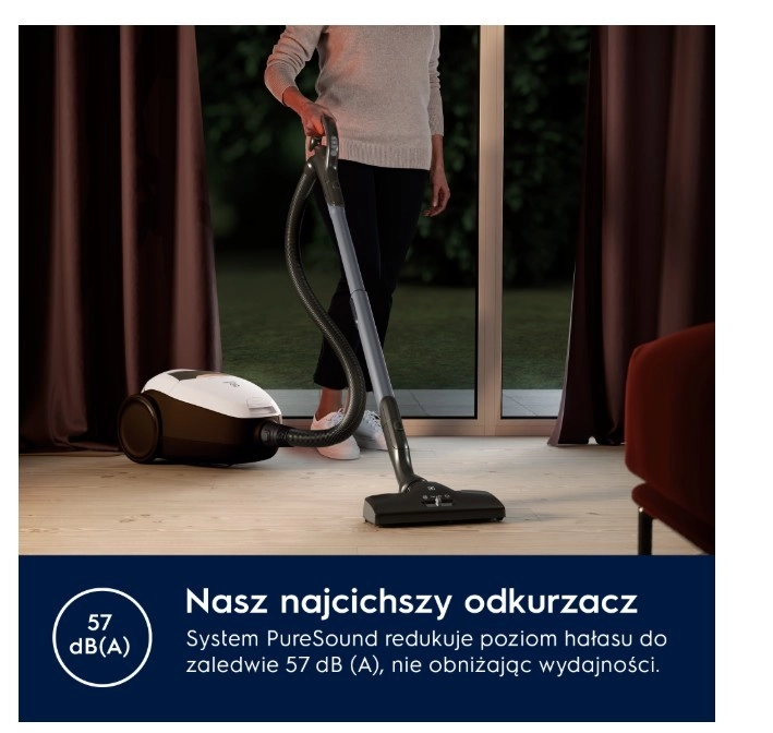 PURE D8.2 SILENCE spada med najtišje klasične vrečaste sesalnike – z inovativnim sistemom PureSound dosega glasnost le 57 dB(A). Zahvaljujoč samodejni regulaciji SmartMode sam prepozna vrsto površine in prilagodi moč, zato lahko brez ročnih nastavitev gladko preidete s trdih tal na preprogo.