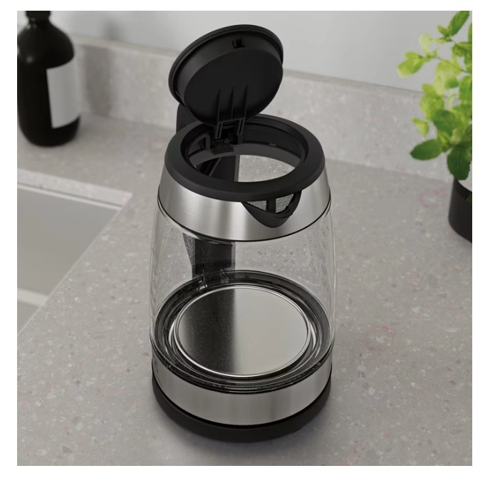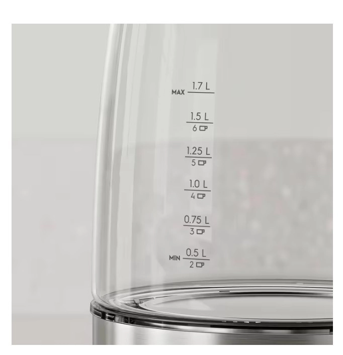 Stekleno ohišje z merilnimi oznakami do 1,7 l vam omogoča, da na prvi pogled spremljate nivo in vrelišče – vedno natančno zavrete toliko, kot potrebujete.