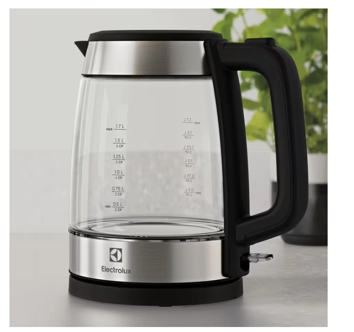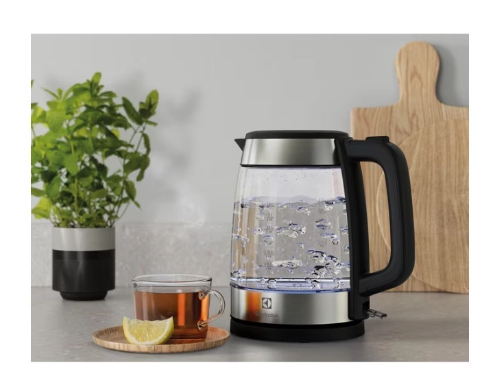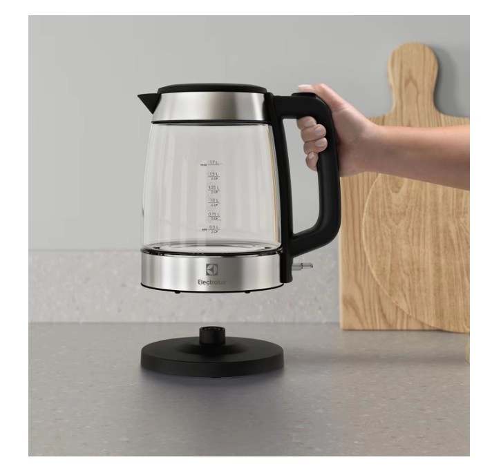Stilski stekleni grelnik vode Electrolux Create 4 združuje eleganten dizajn s praktičnimi funkcijami za vsakodnevno uporabo. Zahvaljujoč prostornini 1,7 l, 360° vrtljivi osnovi in ergonomskemu ročaju vodo zavre hitro in varno. Prozorno borosilikatno steklo omogoča preprosto kontrolo nivoja, nerjaveči poudarki povečajo vzdržljivost, fini filter na izlivu pa poskrbi za čistejše nalivanje pijače.