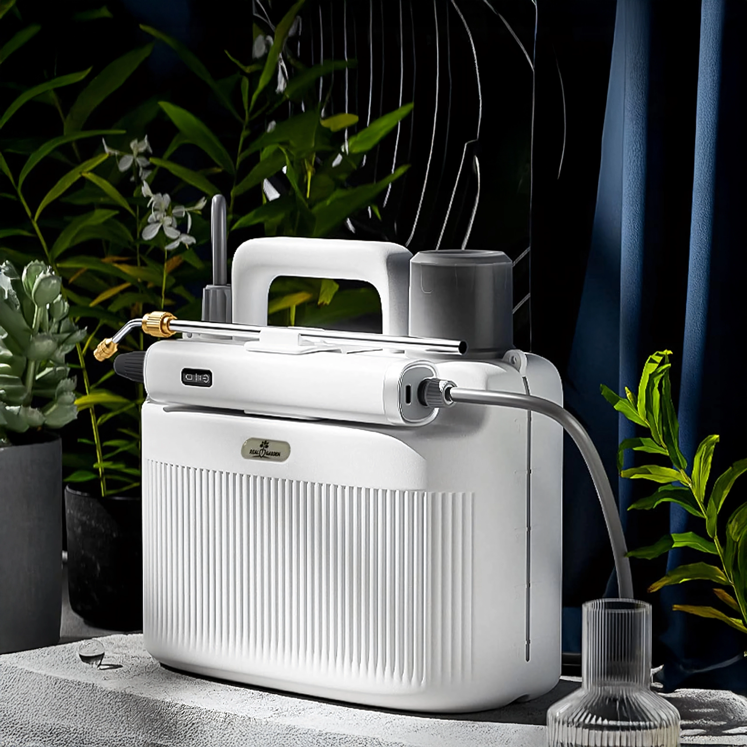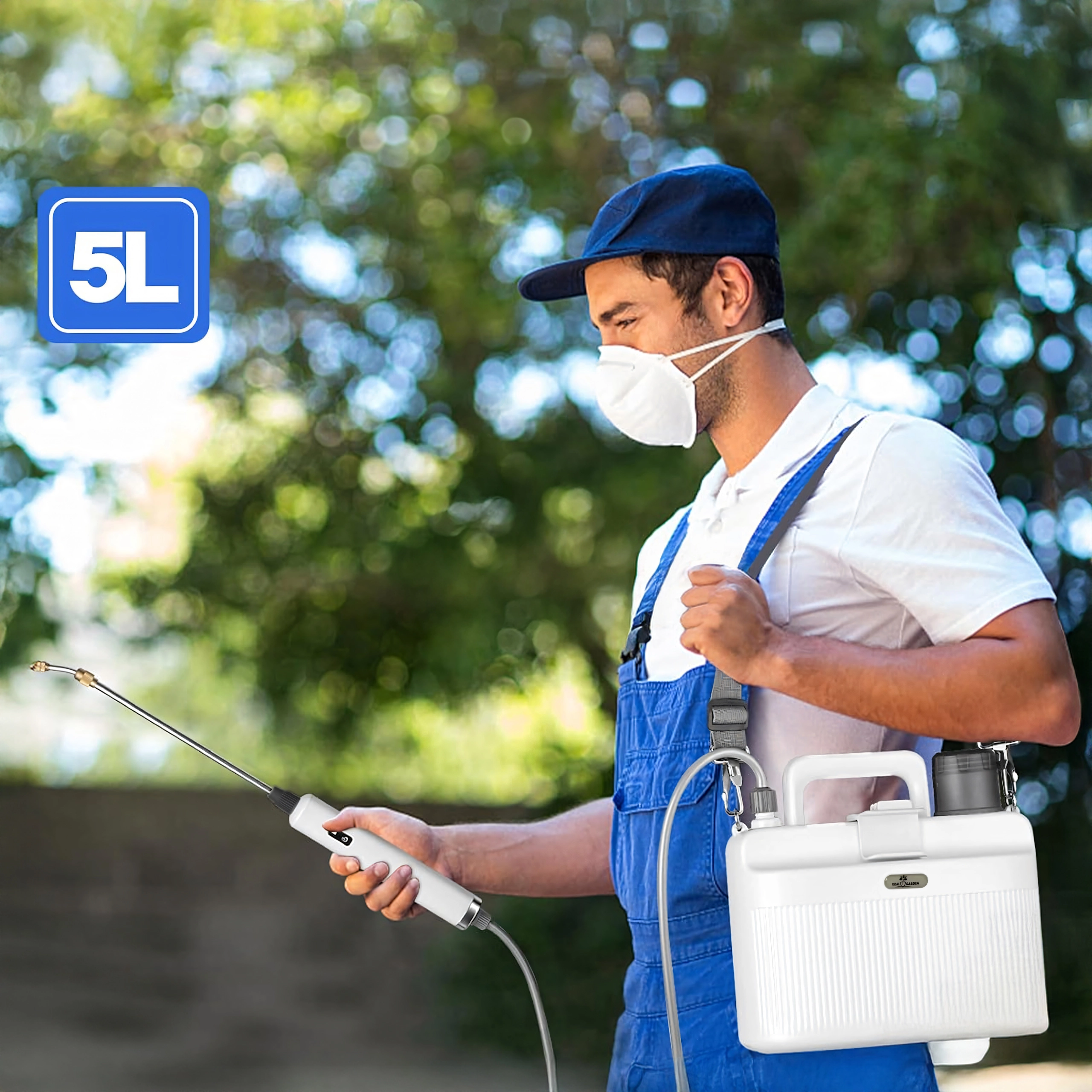 Brez napornega ročnega črpanja. Ta akumulatorski razpršilnik uporablja zmogljiv akumulator 2200 mAh za stabilen tlak in dolgo avtonomijo z enim polnjenjem. Prostorna 5‑l posoda je dovolj velika za redno vzdrževanje gredic, sobnih rastlin in manjših površin, medtem ko ergonomski ročaj in nastavljiva šoba zagotavljata natančen nanos vode ali raztopin.