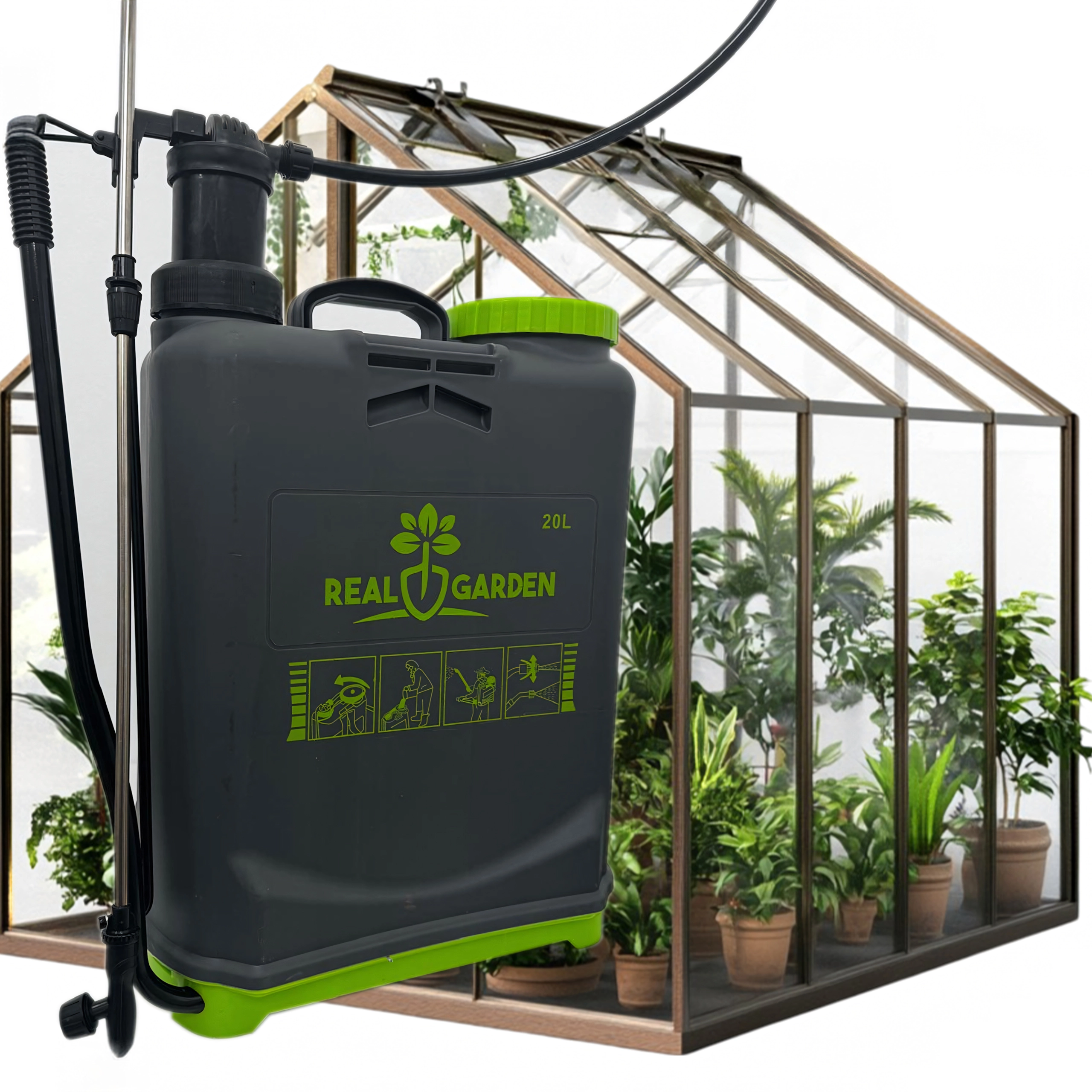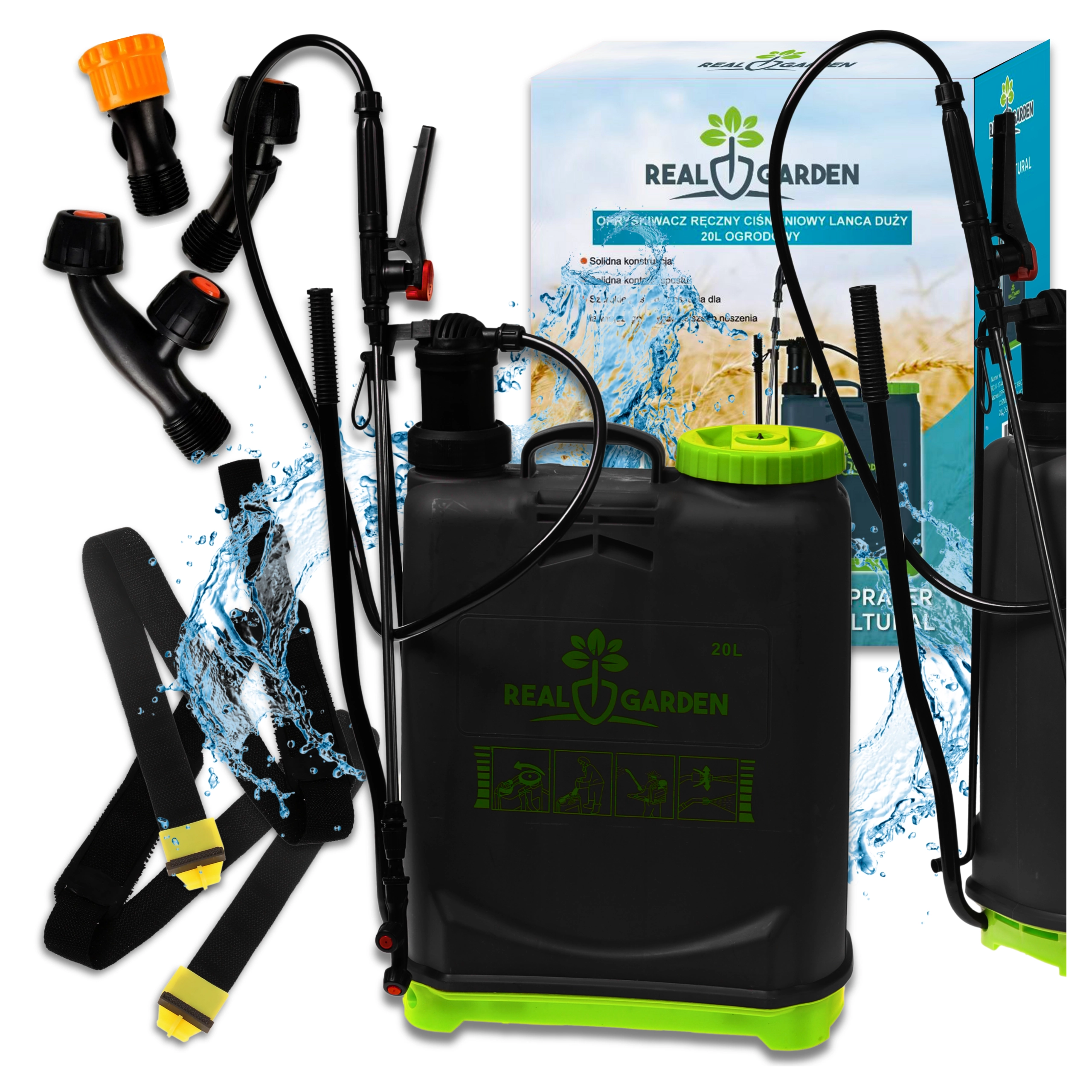 V kompletu je več zamenljivih šob za različne vzorce razprševanja – od fine meglice do neprekinjenega curka. Udobne naramnice porazdelijo obremenitev po hrbtu, stabilno dno pa nudi zanesljivost pri odlaganju. Idealno za rastlinjake, grede, sadovnjake in trate.