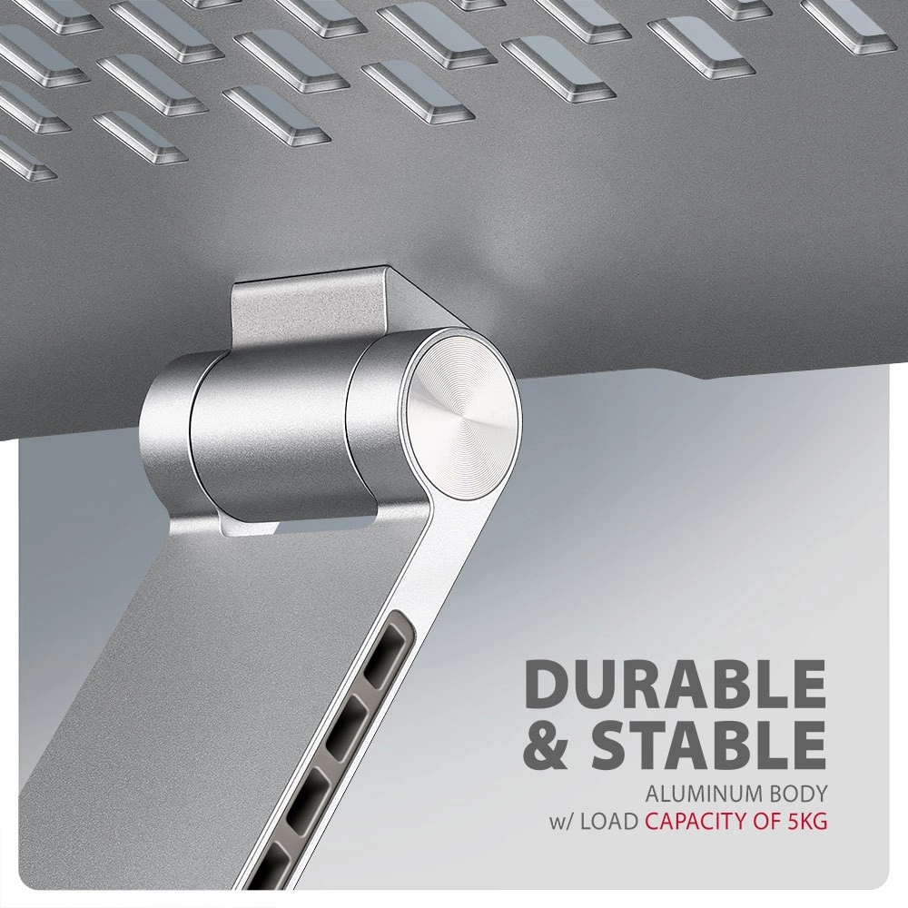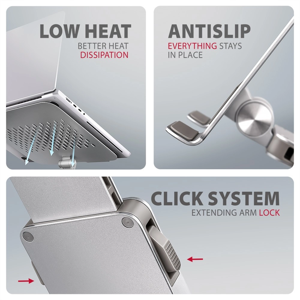 Edinstvena izvlečna roka z zaklepom (do 60 mm, 7 položajev) približa zaslon na optimalno razdaljo oči in ga poravna z zunanjim monitorjem. Aluminijasti ulitki zagotavljajo trdnost in dolgo življenjsko dobo, protidrsna obdelava trdno drži napravo na mestu, prezračevalne odprtine pa podpirajo učinkovito hlajenje za višjo zmogljivost in daljšo življenjsko dobo prenosnika.
