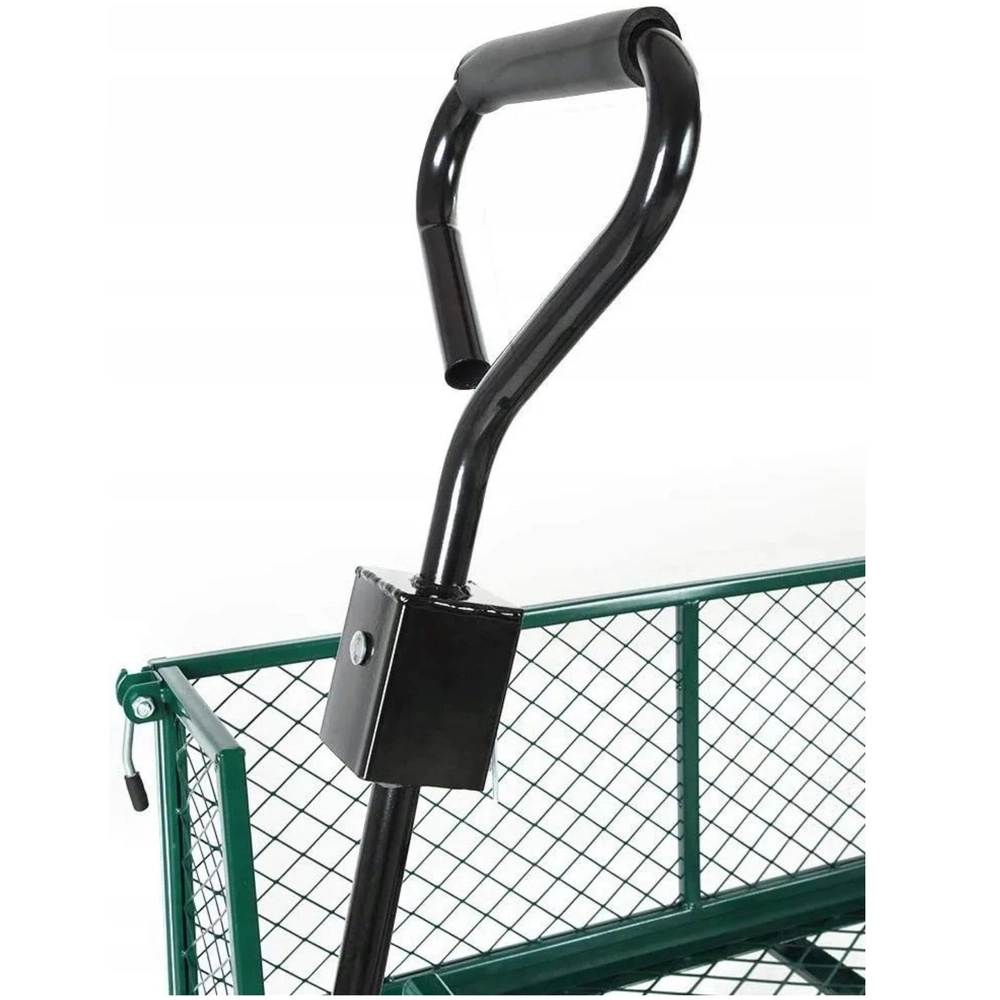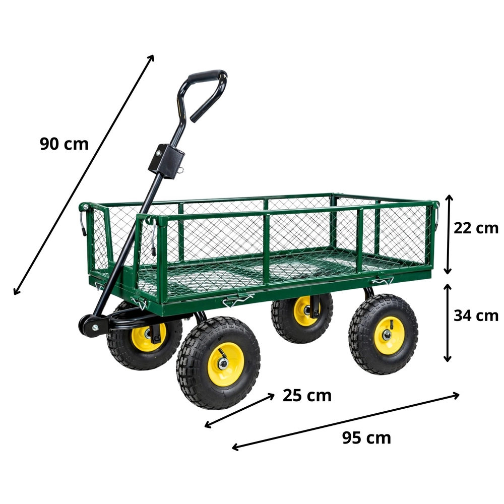Robusten vrtni voziček iz trpežnega jekla za enostaven prevoz materiala na vrtu, gradbišču in v skladišču. Ponuja nosilnost do 200 kg, 4 napihljiva kolesa za gladko vožnjo po terenu, vrtljivo sprednjo premo za natančno manevriranje in preklopne stranice za hitro nakladanje in razkladanje.