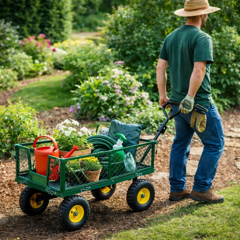 Iščete vsestranskega pomočnika za delo na vrtu, gradbišču ali v delavnici? Ta jekleni vrtni voziček z nosilnostjo 200 kg zlahka prevaža prst, les, kamenje in orodje. Stabilna štirikolesna konstrukcija z napihljivimi kolesi blaži neravnine trave, peska in tlakovcev, vrtljiva sprednja prema pa zagotavlja natančno vodenje tudi pri polni obremenitvi.