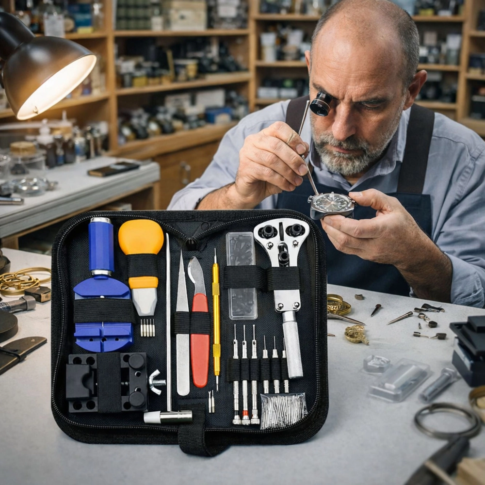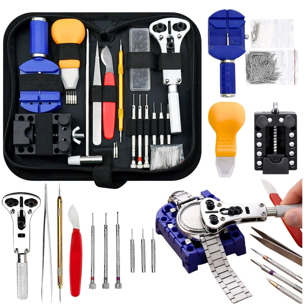 Celovit komplet za popravilo in vzdrževanje ur ponuja vse, kar potrebujete za domača in napredna urarska dela. Vključuje orodja za odpiranje zadnjih pokrovov, krajšanje in nastavitev paščkov, menjavo vzmetnih zatičev ter varno vpetje ure. Kakovostna orodja iz nerjavnega jekla in aluminija so shranjena v praktičnem etuiju na zadrgo za enostavno organizacijo in prenašanje.