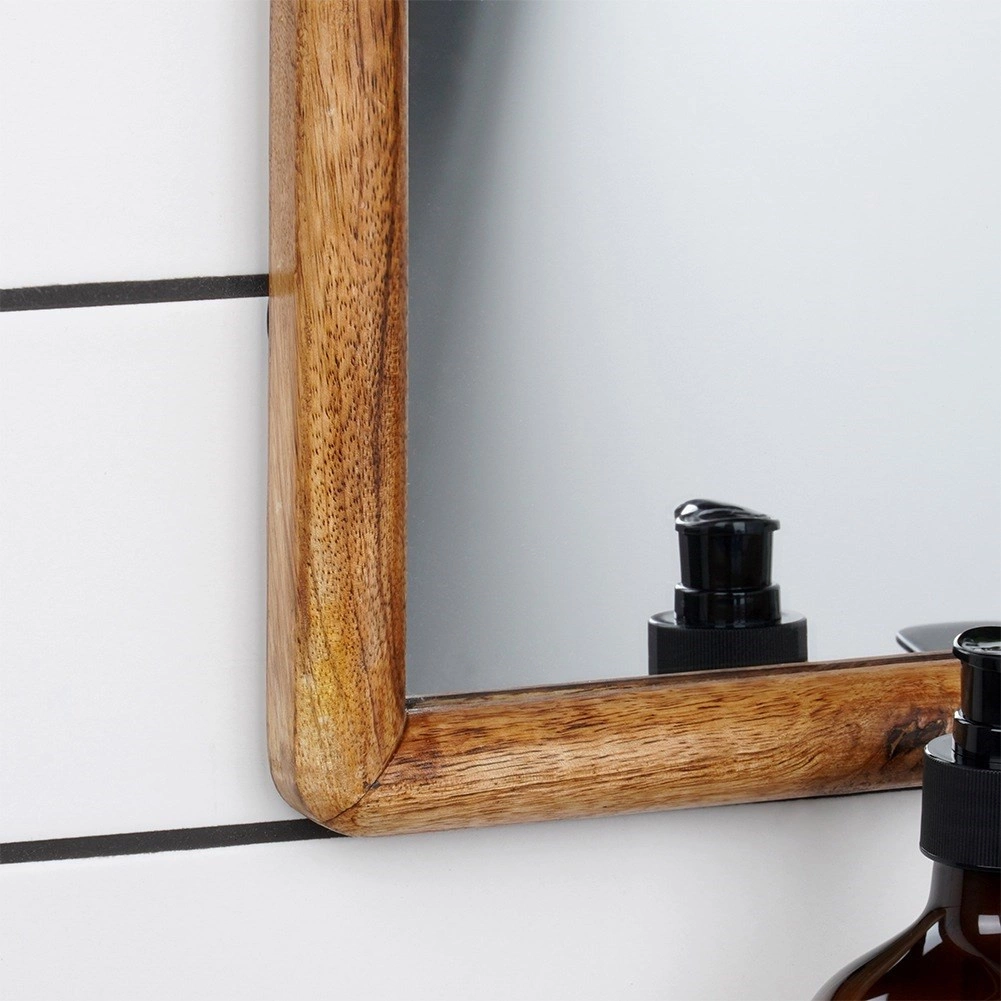 To dizajnersko ogledalo v naravnem lesnem odtenku odlično dopolni moderne in klasične interierje. Okvir iz kakovostnega mangovega lesa poudari naravno strukturo in v prostor vnese toplino ter brezčasno eleganco. Natančen odsev omogoča udobno vsakodnevno uporabo.