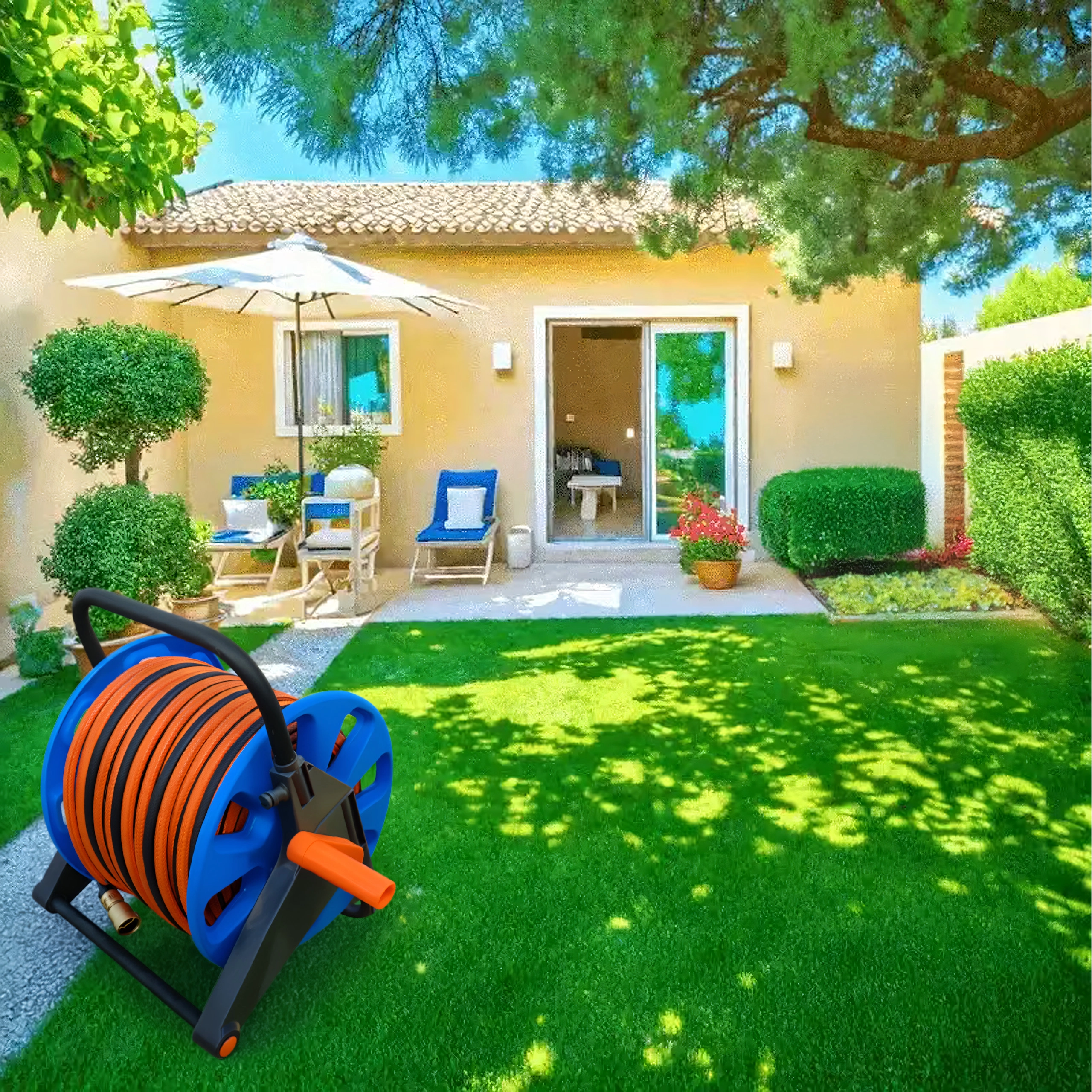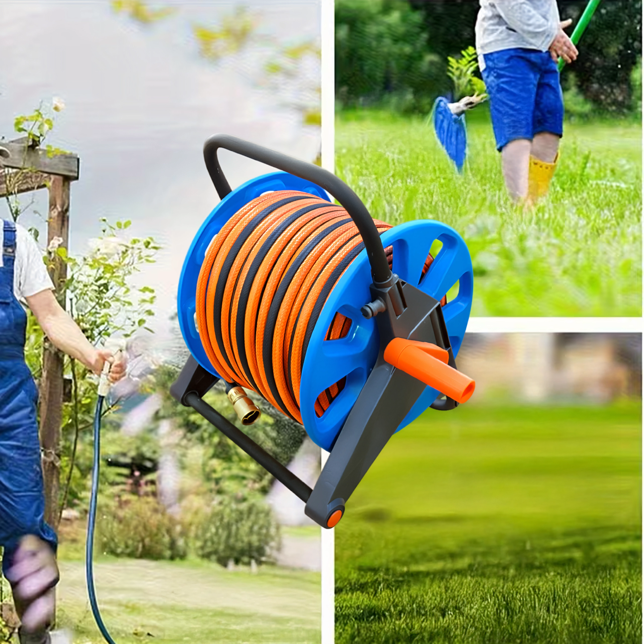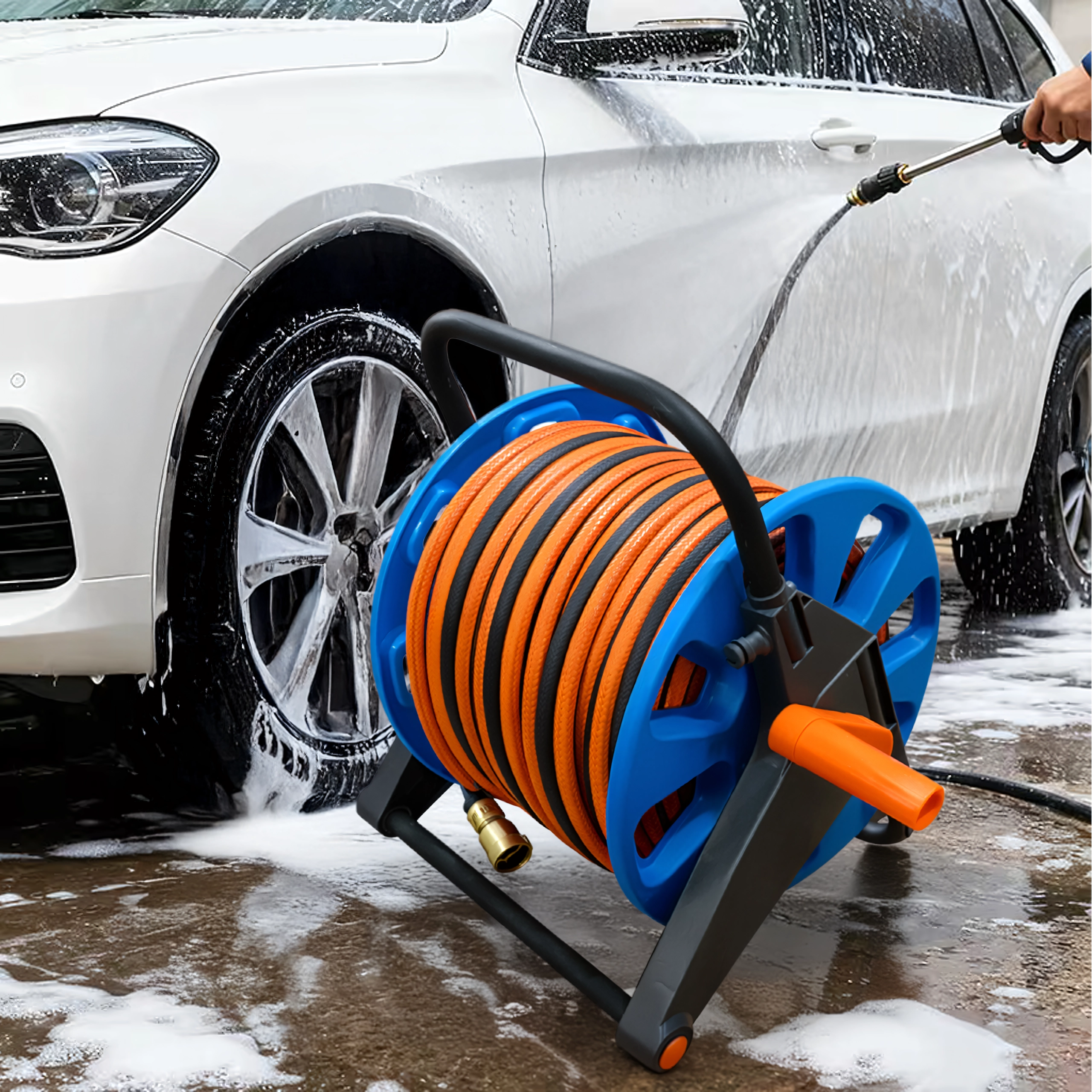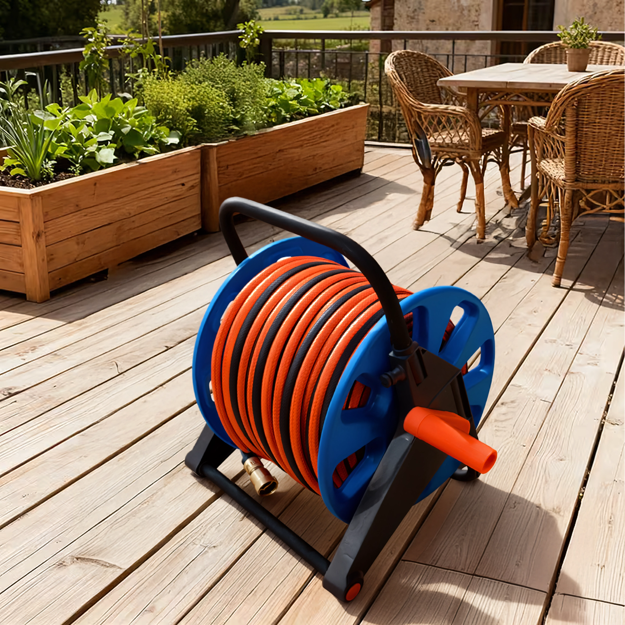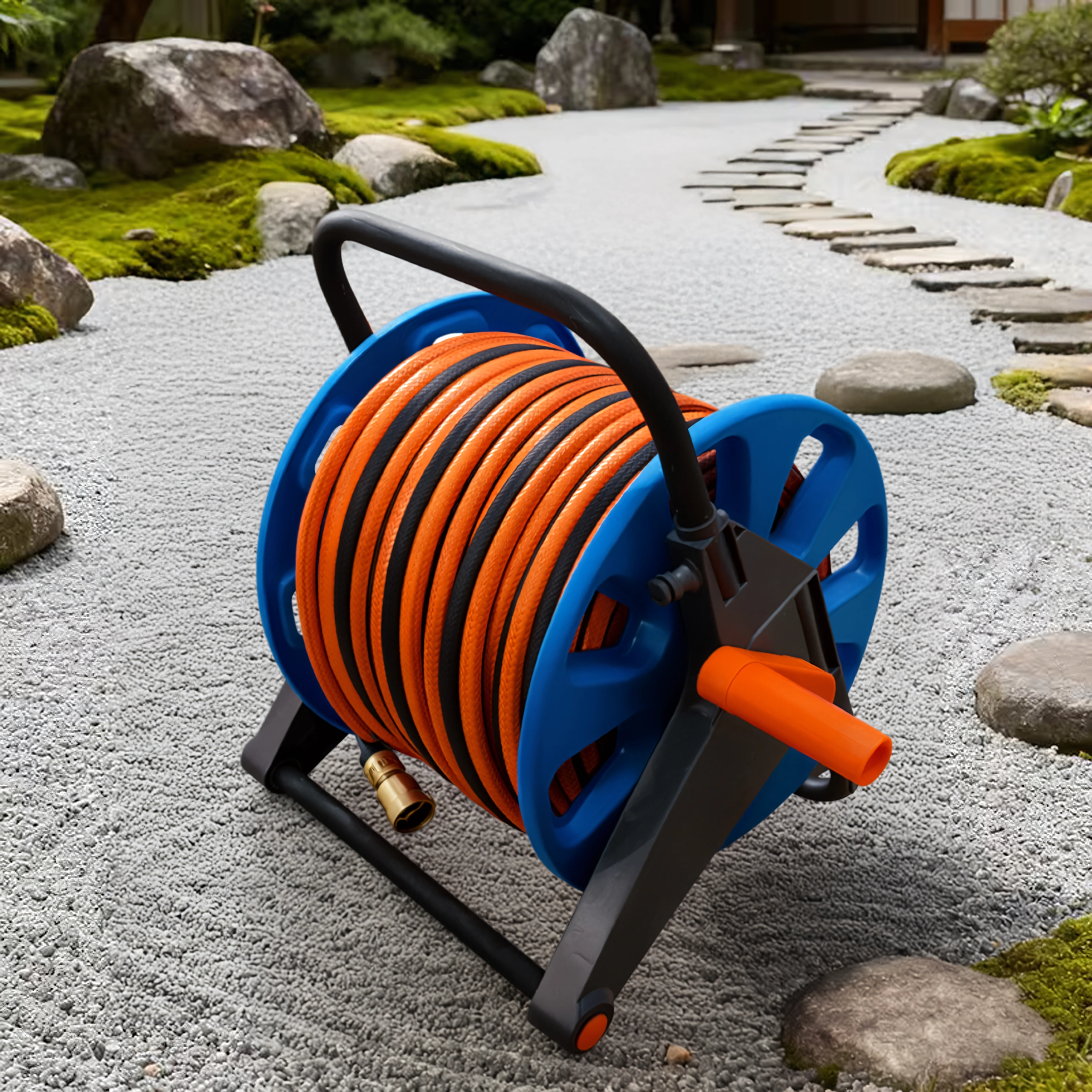 Kapaciteta do 50–60 metrov standardne vrtne cevi pokrije tudi večje površine. Kompaktne mere in nizka teža olajšajo prenašanje in shranjevanje v garaži ali vrtni lopi. Praktična izbira za vsakodnevno uporabo na vrtu, terasi in v delavnici.
