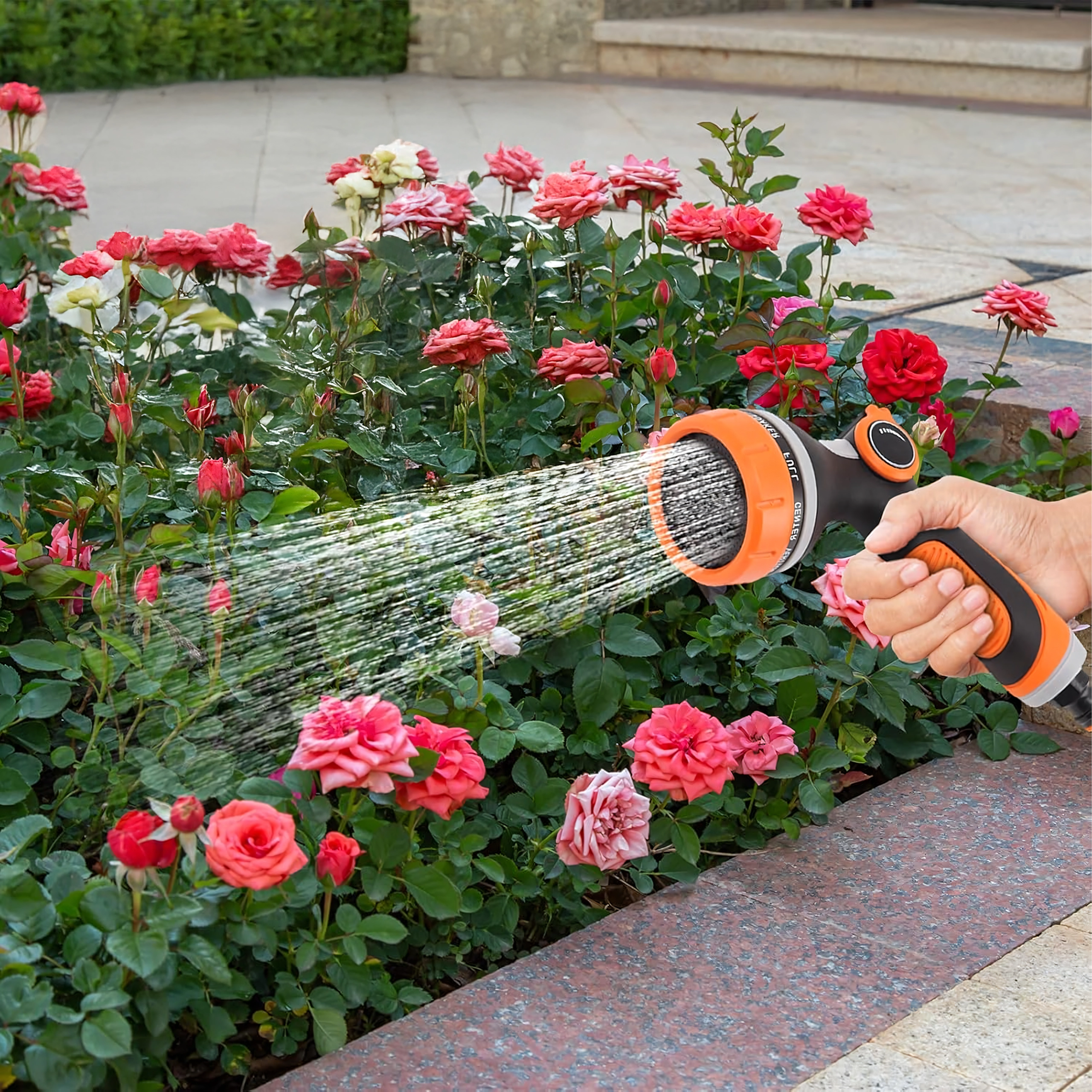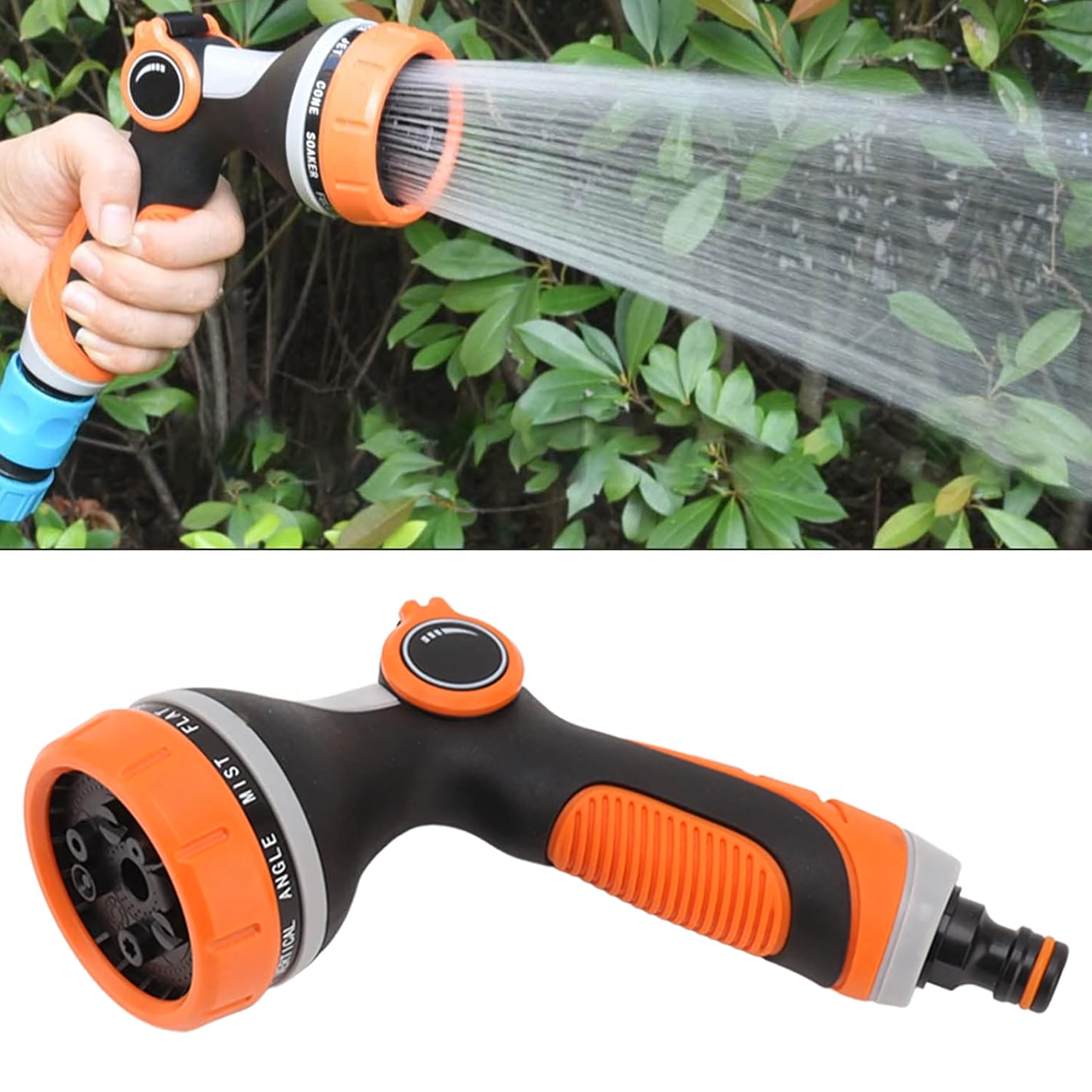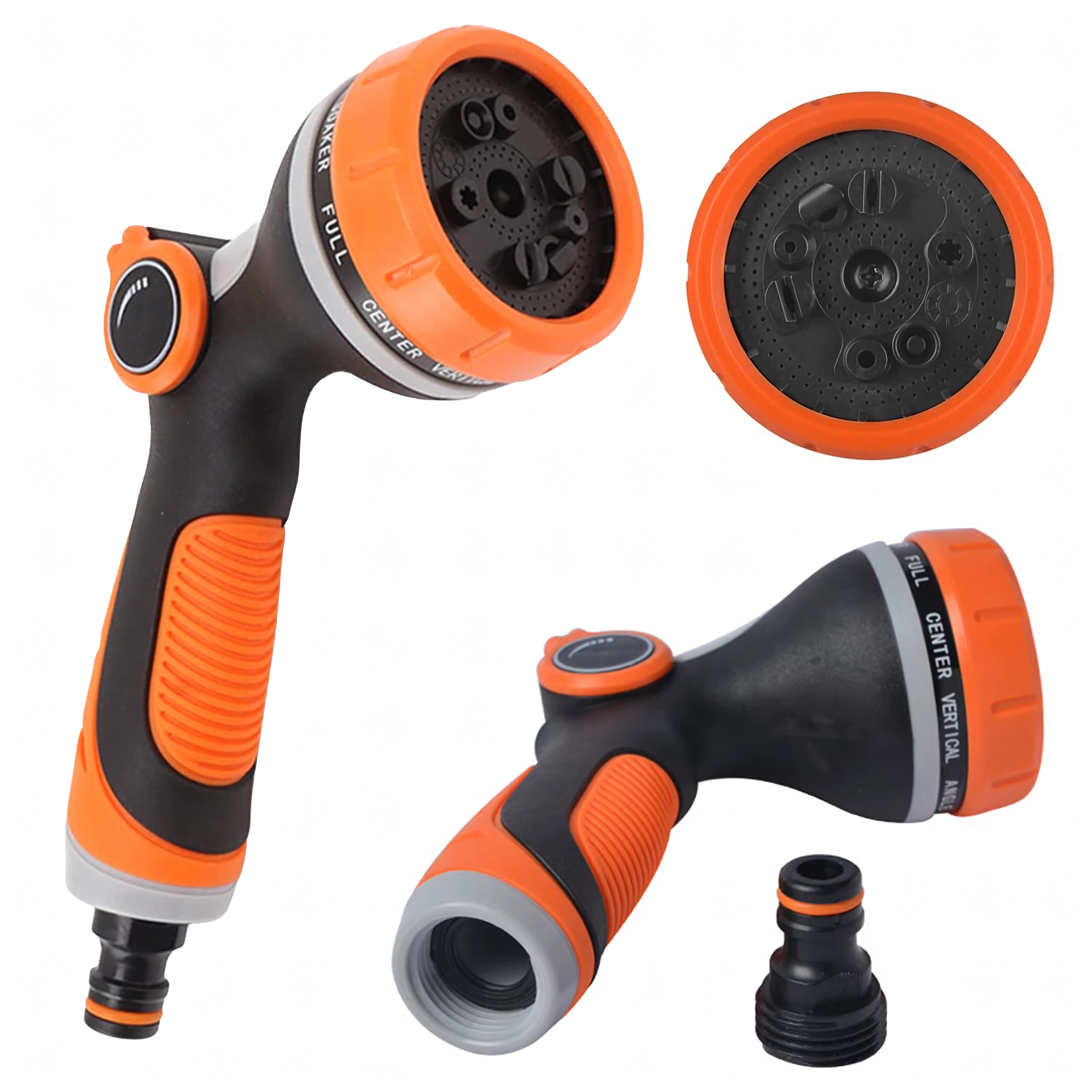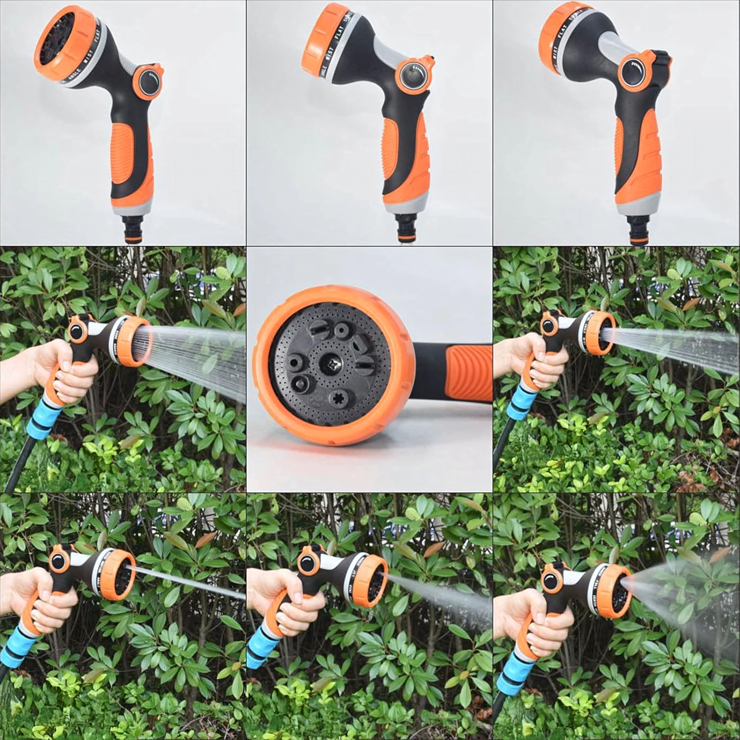 Izbirate lahko med več načini pršenja (npr. mist/meglica, full/poln, center/sredinski, vertical/vertikalni, cone/stožec, jet/curk), zato lahko nežno zalivate rože, hitro splaknete teraso ali umijete kolo in avto. Glava je združljiva s standardno hitro spojko, zato jo zlahka priključite na večino cevi.
