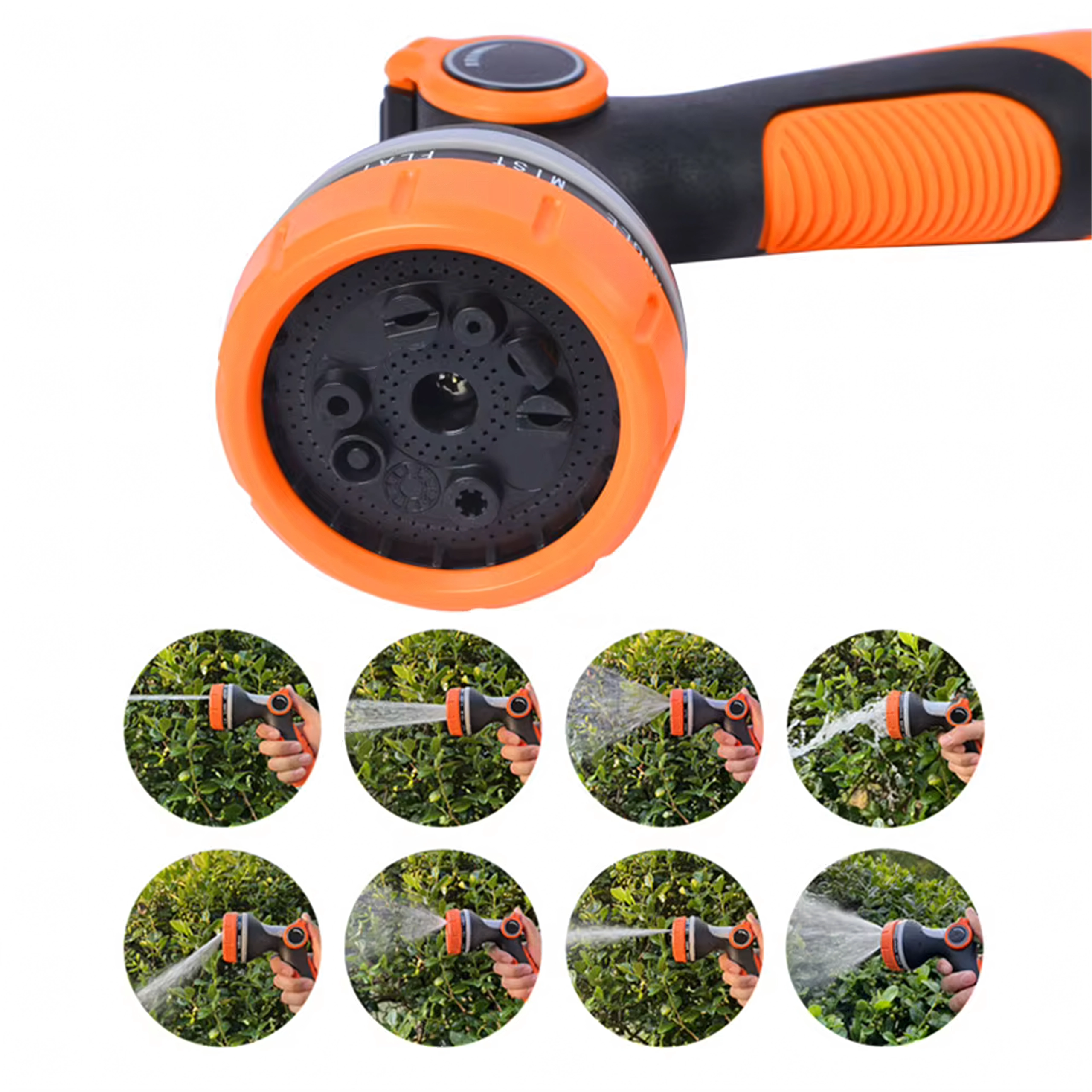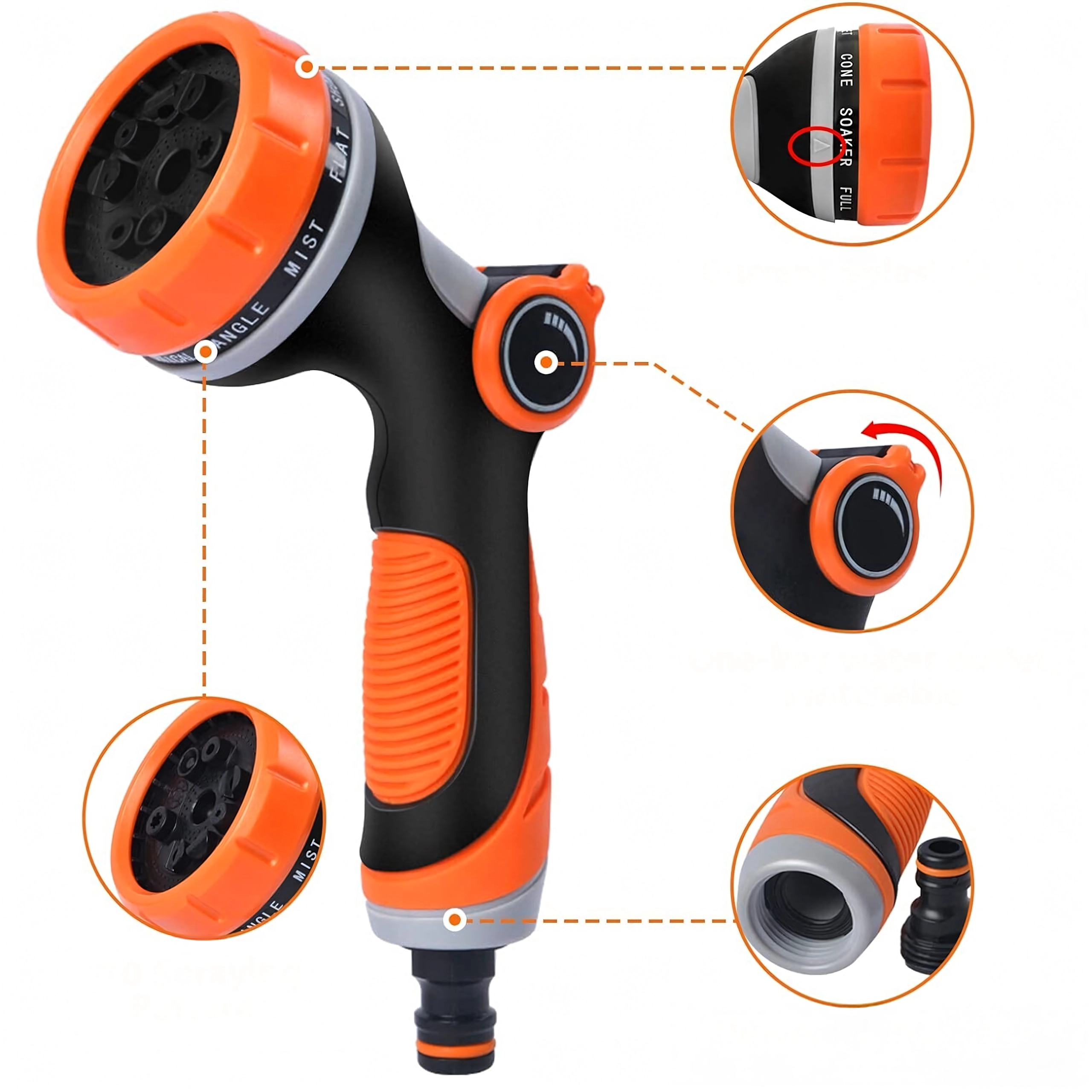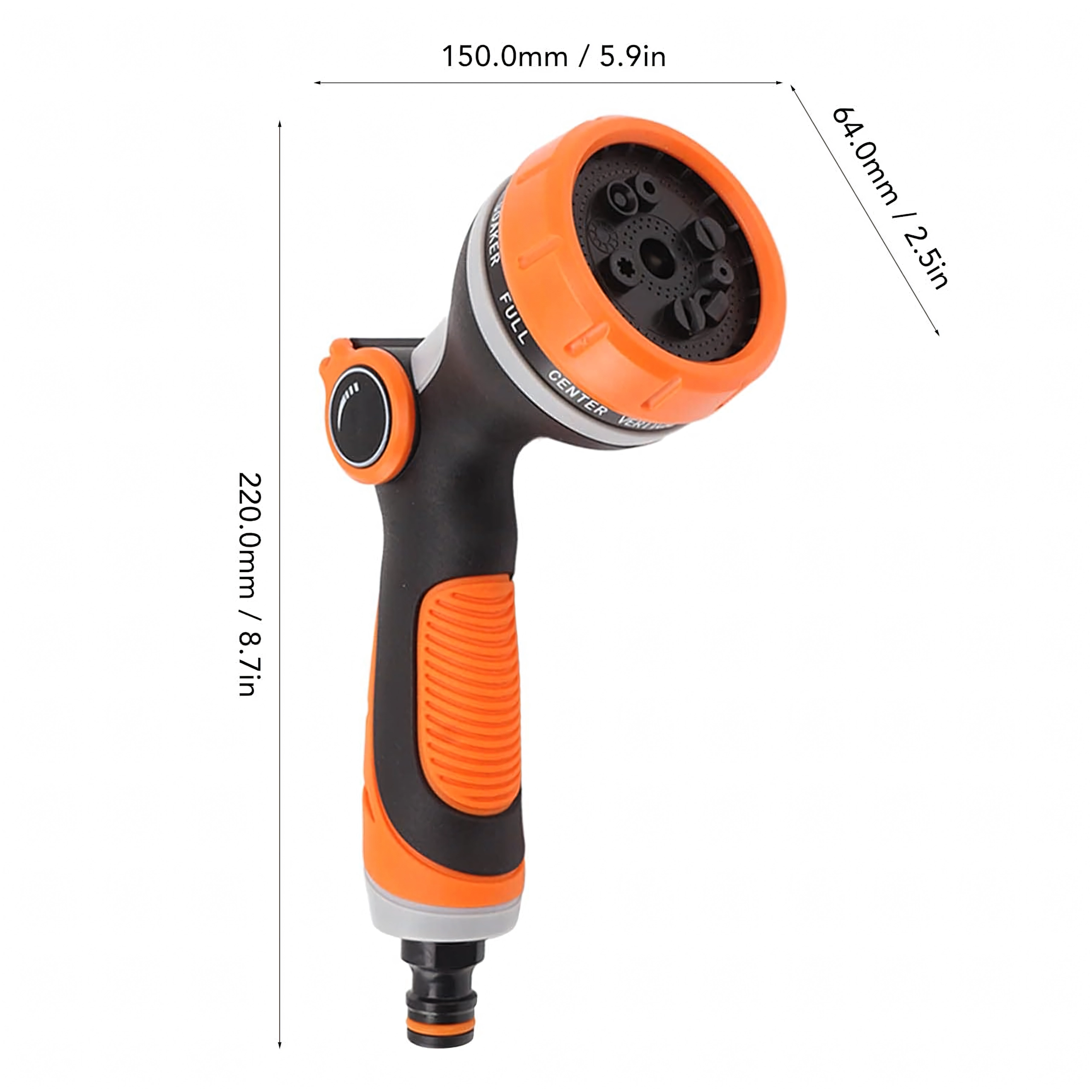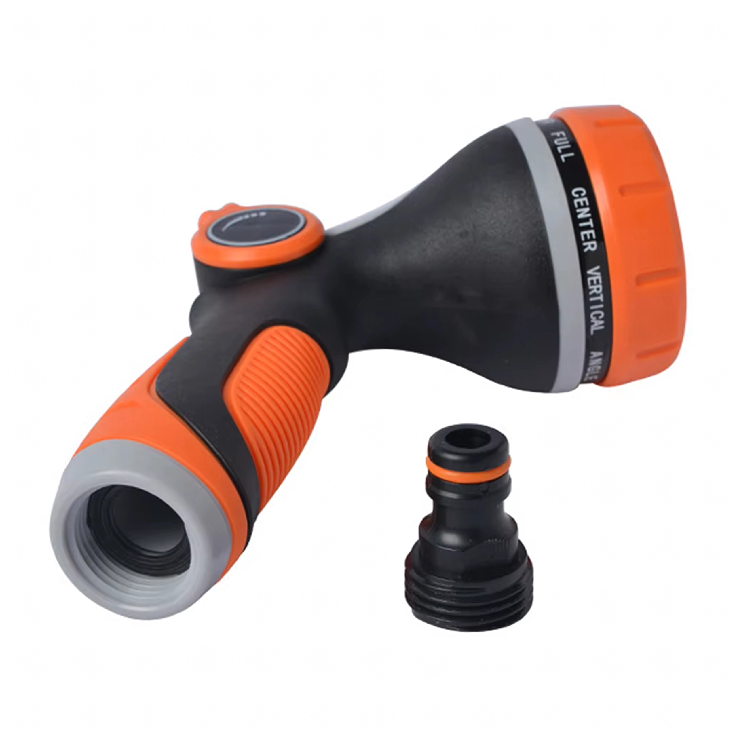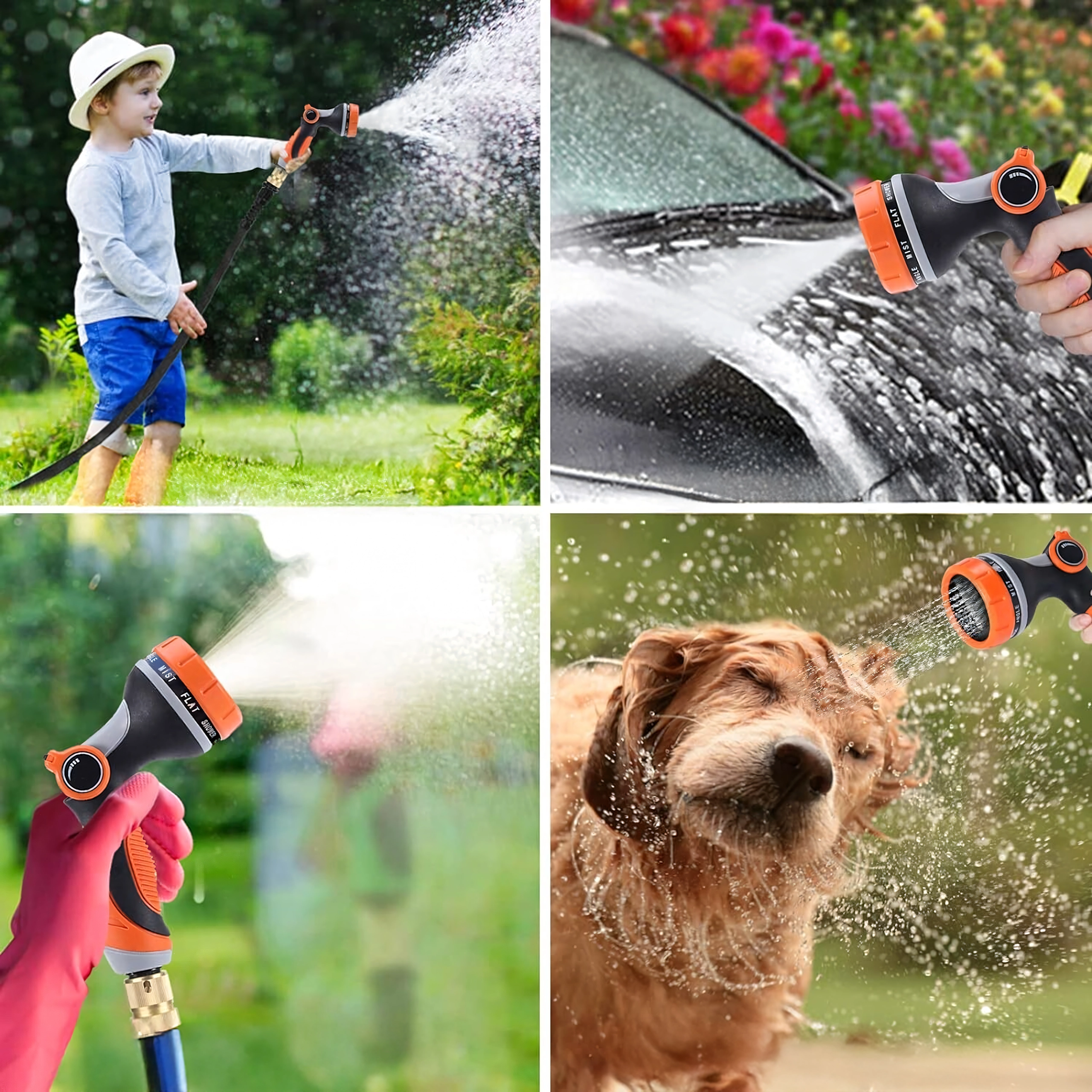 Izbirate lahko med več načini pršenja (npr. mist/meglica, full/poln, center/sredinski, vertical/vertikalni, cone/stožec, jet/curk), zato lahko nežno zalivate rože, hitro splaknete teraso ali umijete kolo in avto. Glava je združljiva s standardno hitro spojko, zato jo zlahka priključite na večino cevi.