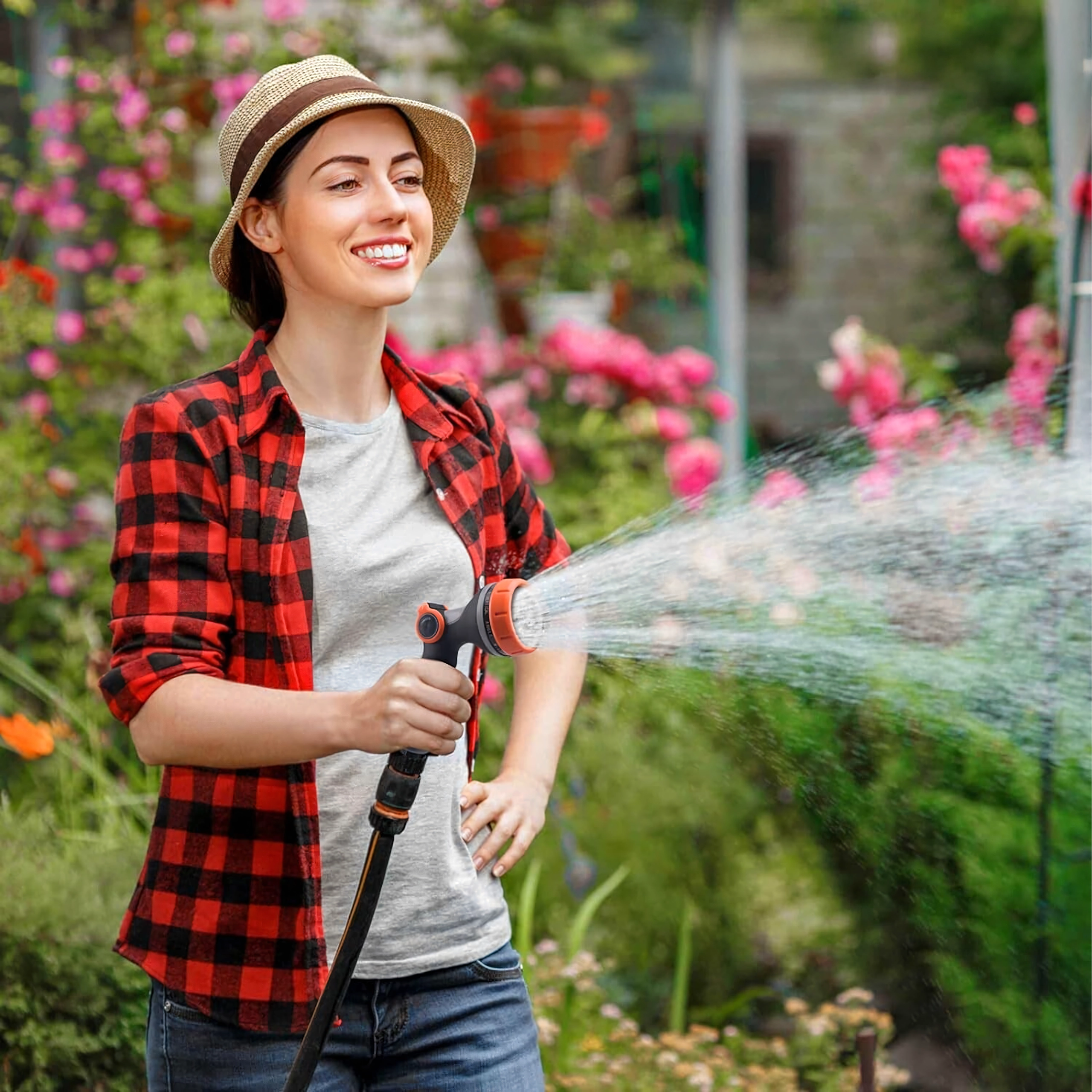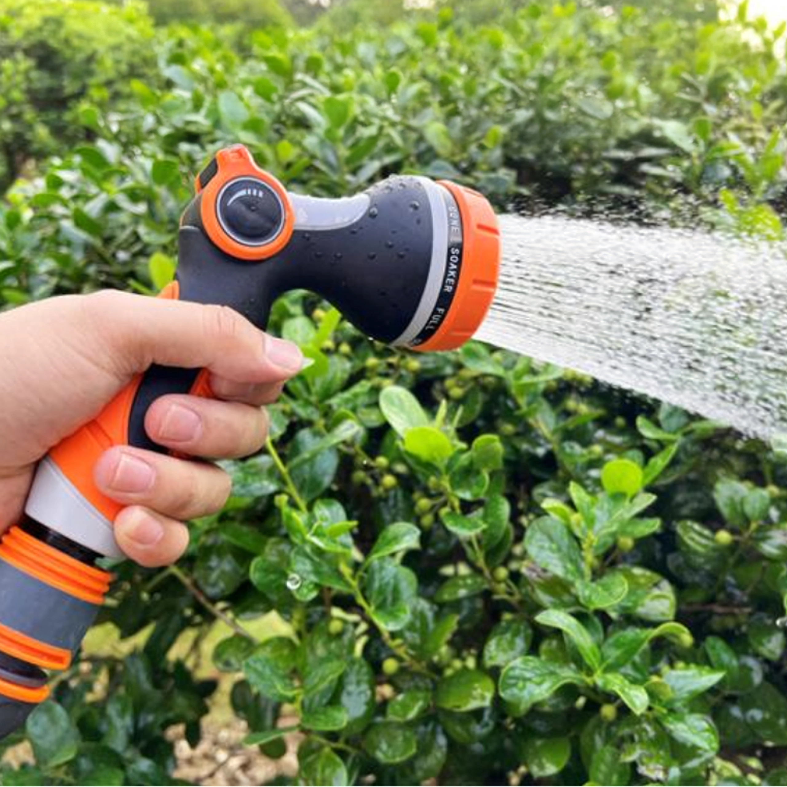 Ta večnamenska vrtna prha z vrtljivim izborom načinov omogoča natančno nastavitev vodnega curka za vsa opravila okoli doma. Zahvaljujoč ergonomskemu nedrsečemu ročaju udobno leži v roki tudi pri daljšem delu, palčni regulator pretoka pa omogoča gladko nastavitev brez stiskanja sprožilca.