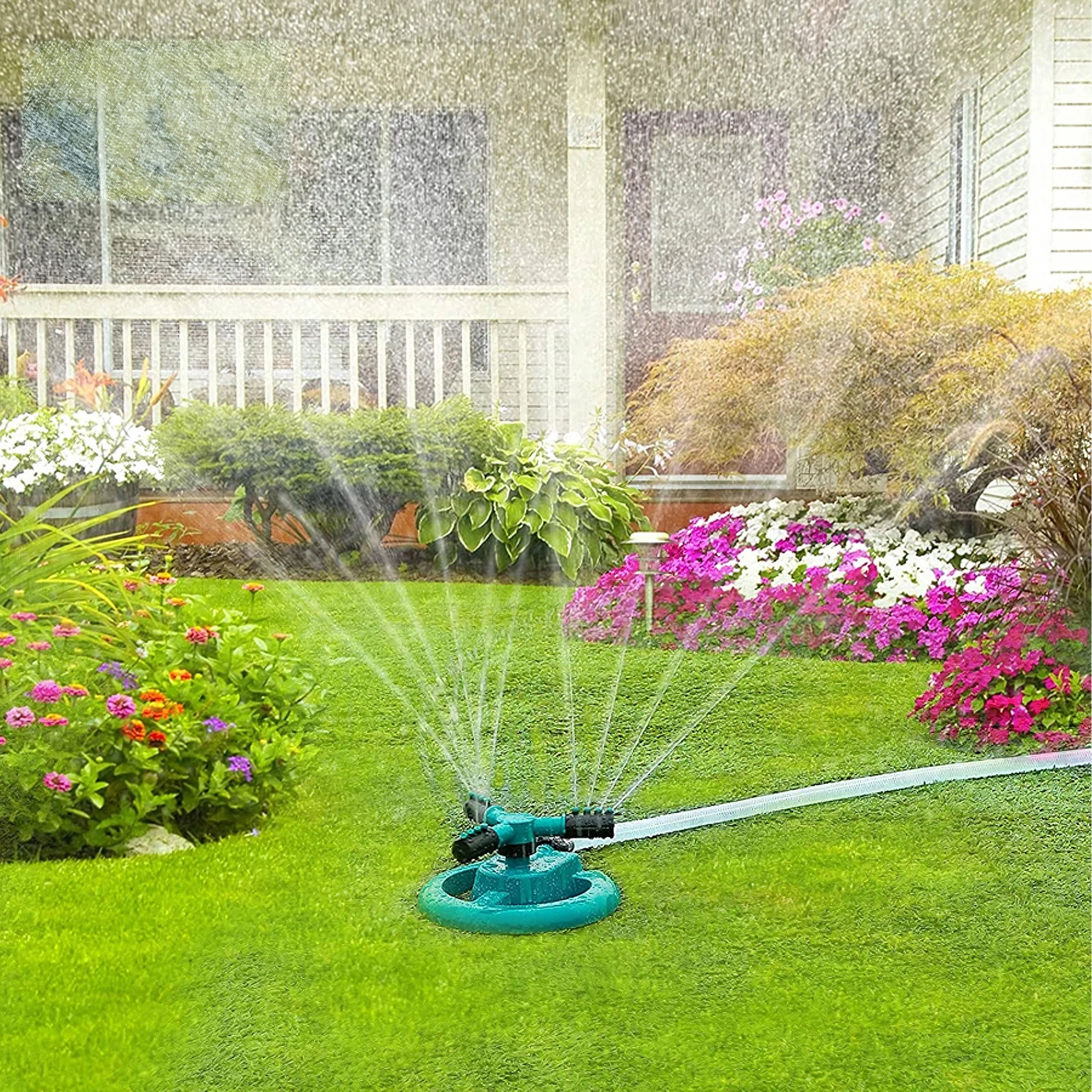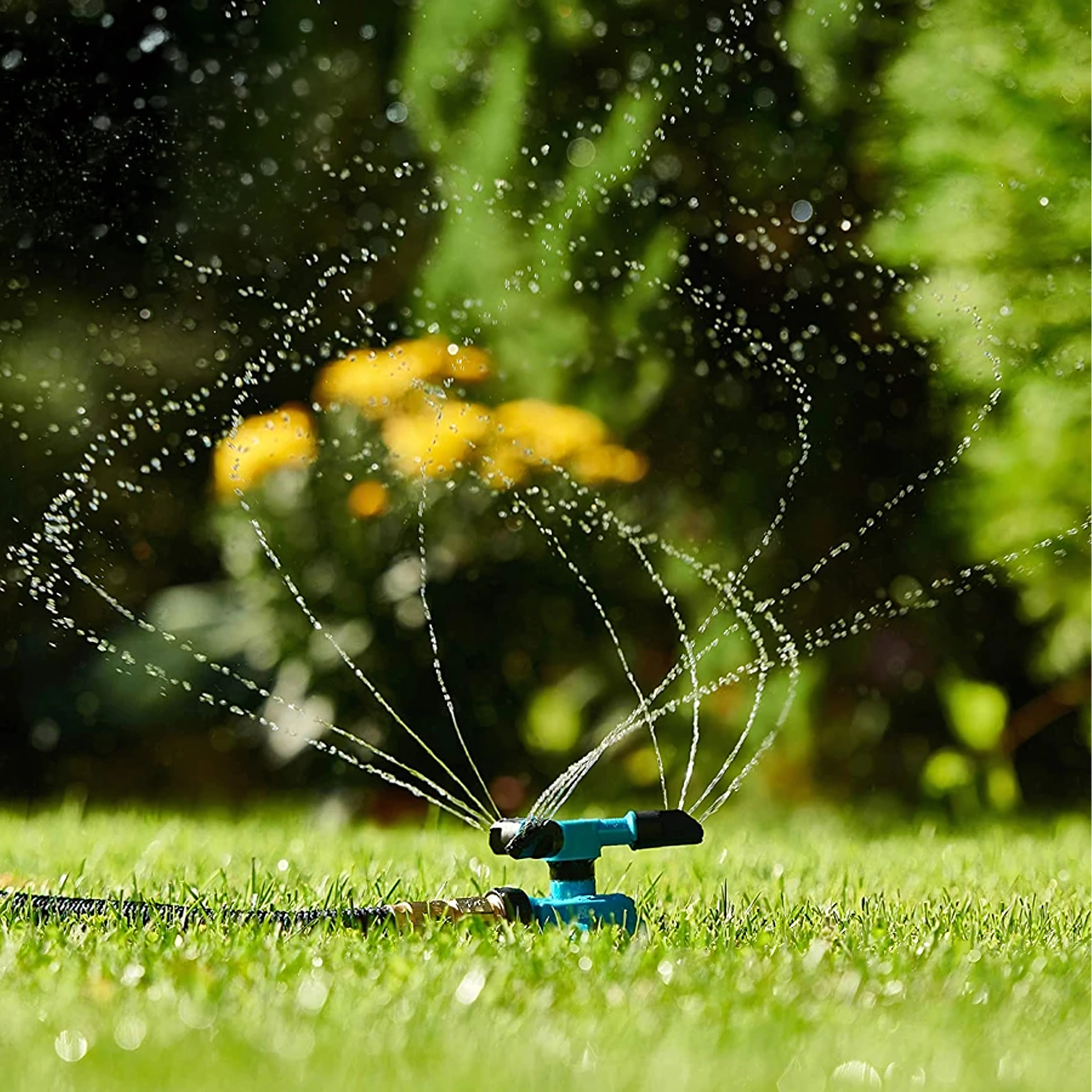 Z 360° vrtenjem in nastavljivimi šobami zlahka prilagodite domet in vzorec škropljenja glede na velikost površine. Hiter priklop na standardno vrtno cev omogoča udobno uporabo in brezhiben začetek zalivanja.