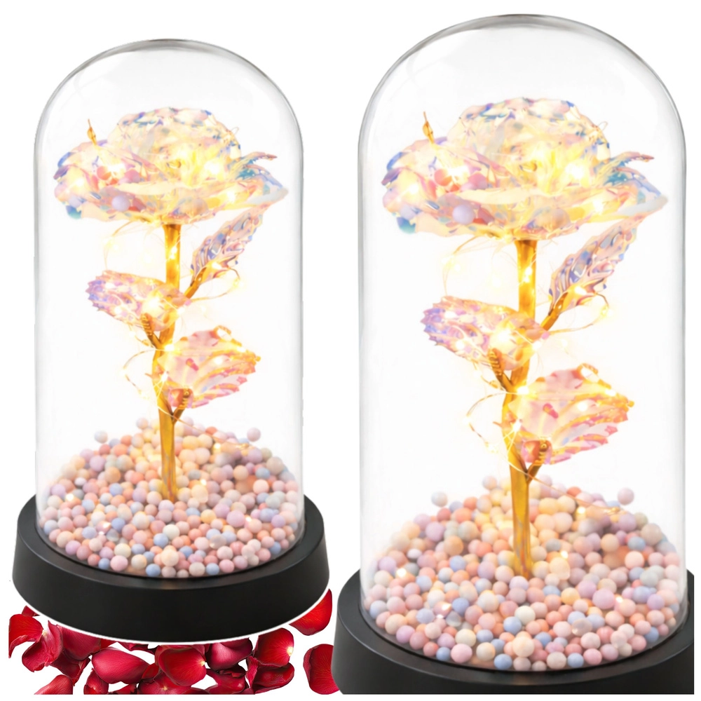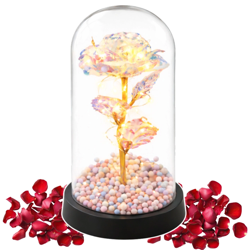 Elegantna dekoracija, ki polepša vsak interier: kristalna večna vrtnica pod prozorno kupolo z zlatim steblom, toplimi LED lučkami in barvnimi kroglicami v podstavku. Ustvari romantično vzdušje, ne zahteva nobenega vzdrževanja in je idealno darilo za rojstni dan, obletnico ali Valentinovo.