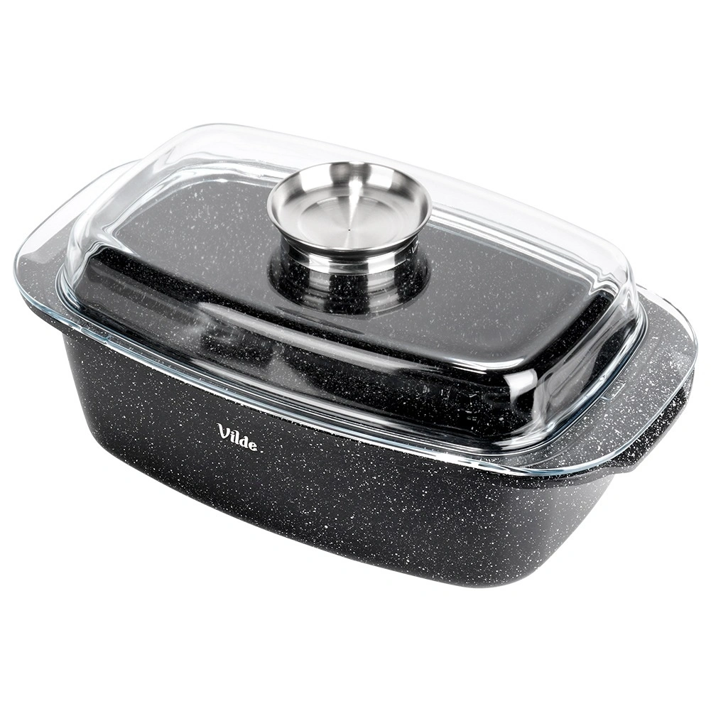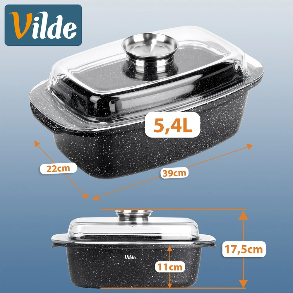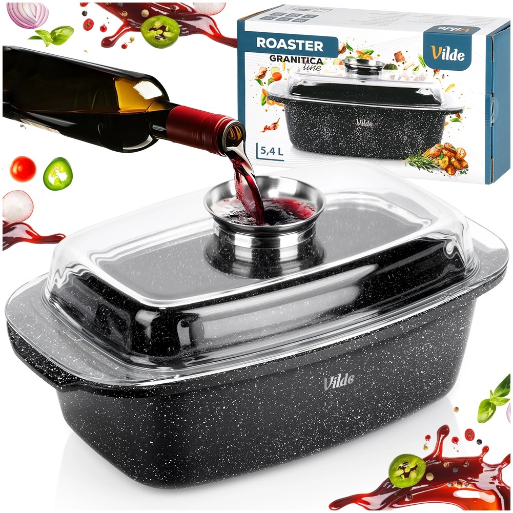 Pravokotni pekač iz aluminijastega litka z odporno granitno neprijemljivo plastjo je vsestranski pomočnik za vsakodnevno kuhanje. Stekleni pokrov s centralnim dozirnikom tekočih dodatkov omogoča dolivanje vode, vina ali marinade brez dvigovanja pokrova – za sočne in aromatične rezultate.