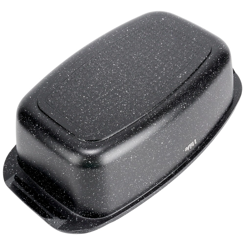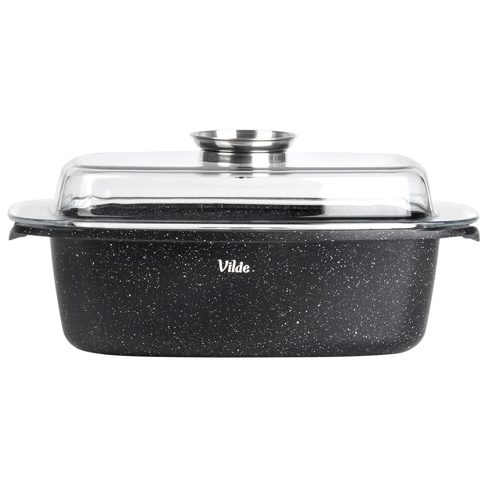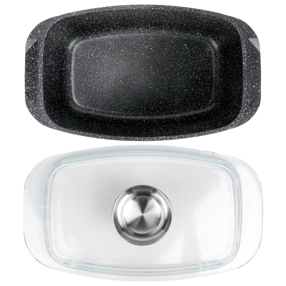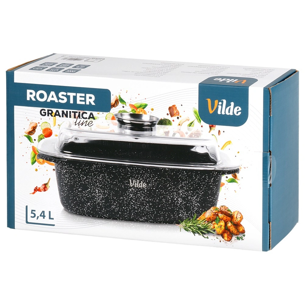 Pravokotni pekač iz aluminijastega litka z odporno granitno neprijemljivo plastjo je vsestranski pomočnik za vsakodnevno kuhanje. Stekleni pokrov s centralnim dozirnikom tekočih dodatkov omogoča dolivanje vode, vina ali marinade brez dvigovanja pokrova – za sočne in aromatične rezultate.