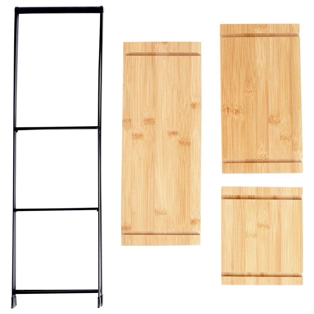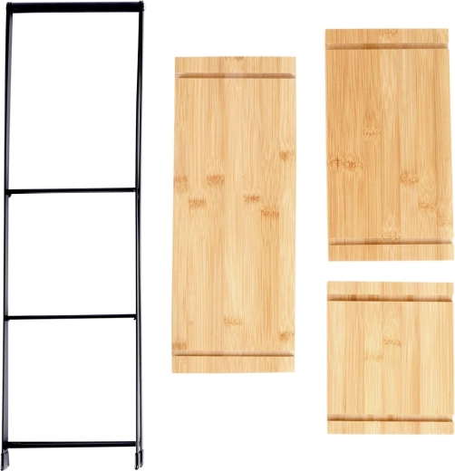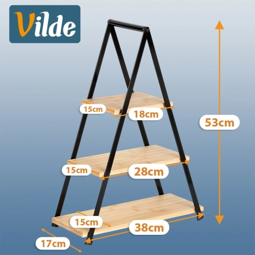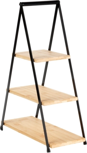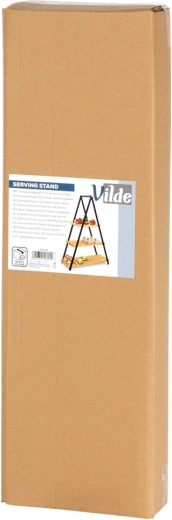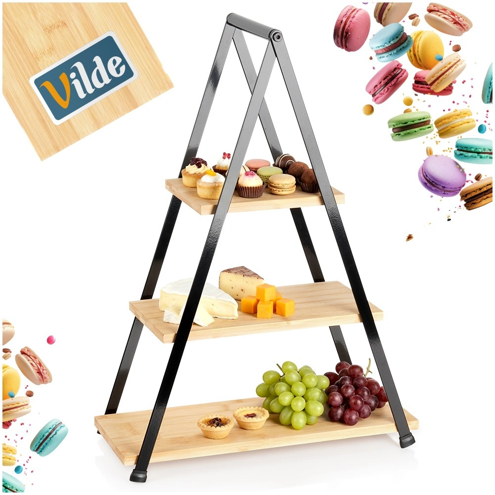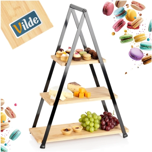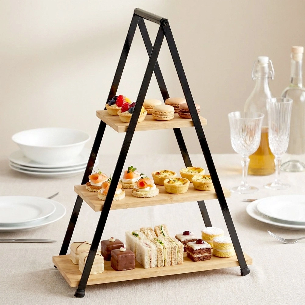 Izdelana je iz bambusovega lesa s kovinskimi nosilci v črni barvi, etažera je vzdržljiva, preprosta za čiščenje in se odlično ujema z modernim in naravnim slogom pogrinjanja. Uporabna doma in v gostinstvu za elegantno predstavitev cupcakeov, piškotov, sirov, sadja ali slanih prigrizkov.