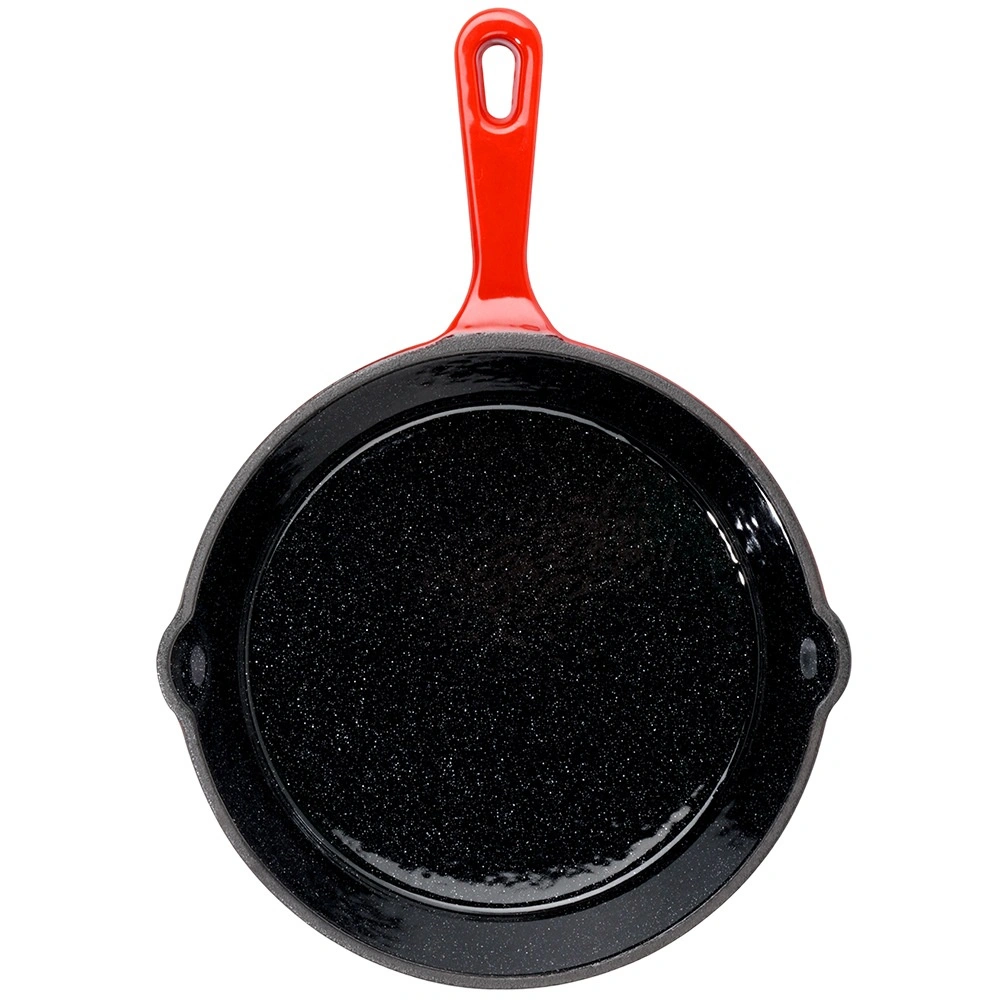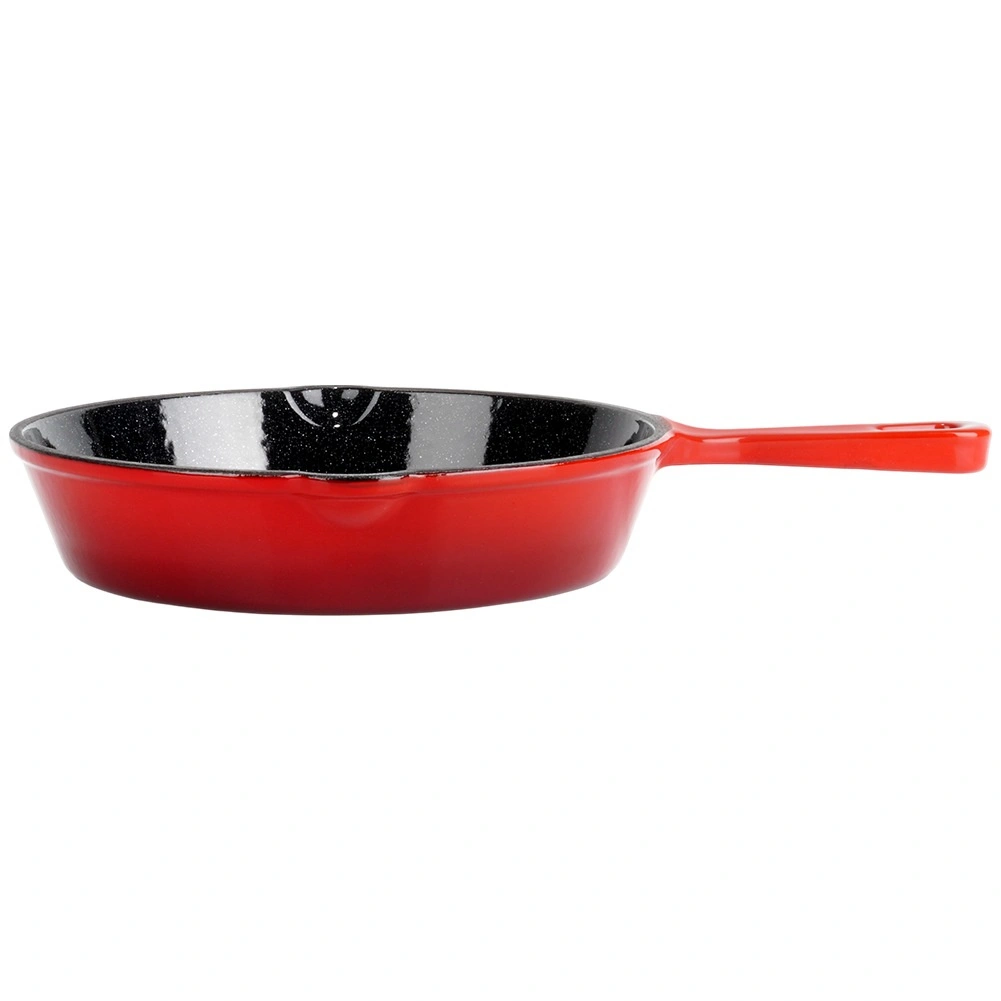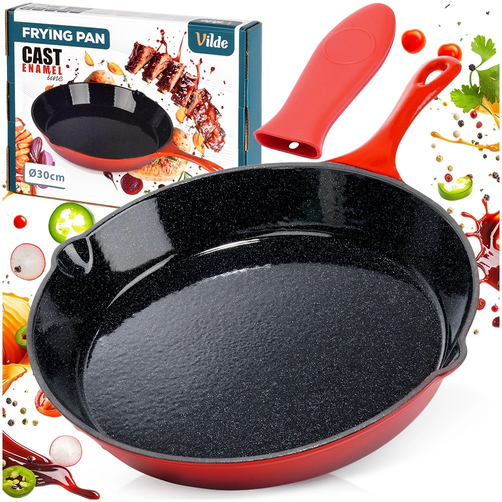 Univerzalna litoželezna ponev premera 20 cm z notranjo črno emajlirano površino in zunanjo rdečo emajlirano oblogo ponuja hitro in enakomerno segrevanje, dolgotrajno zadrževanje toplote ter dve praktični izlivi za preprosto pretakanje. Priložen je silikonski nastavek za ročaj za varno rokovanje. Primerna za plin, elektriko, keramiko in indukcijo ter za pečico.
