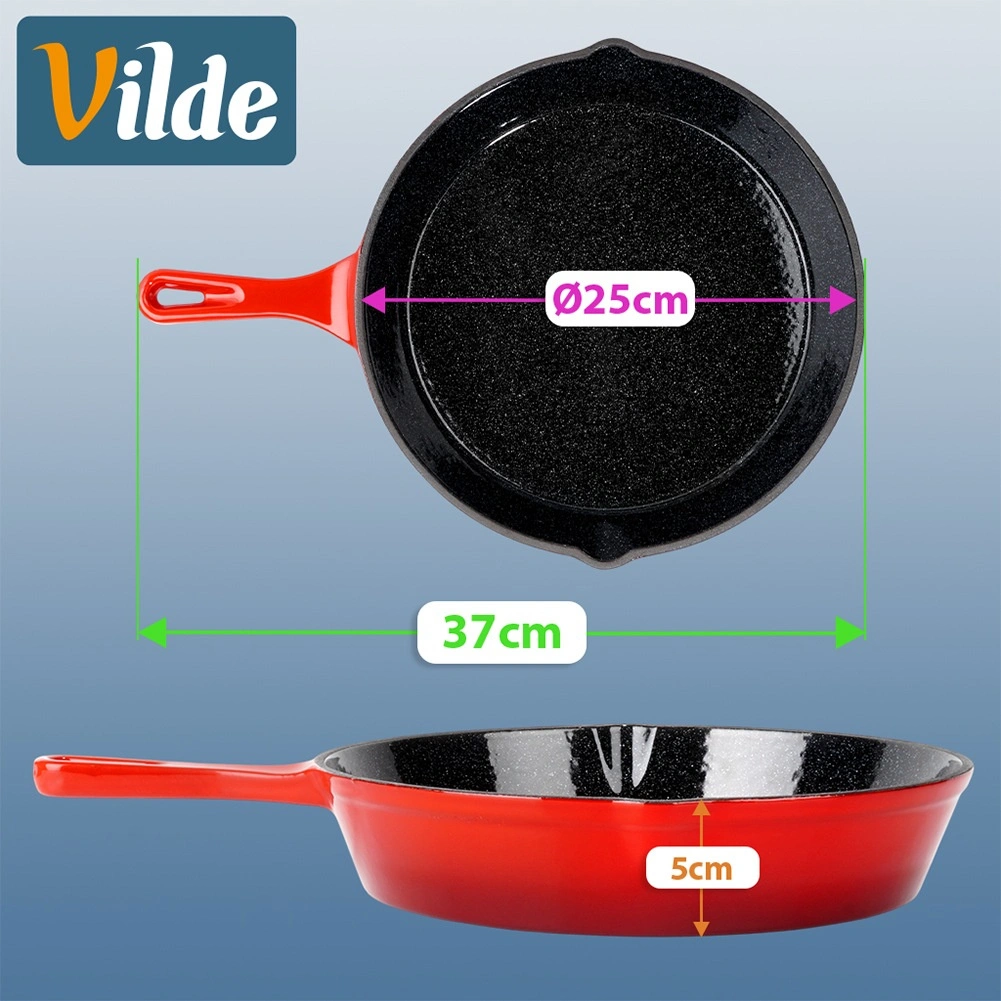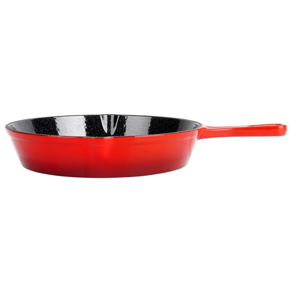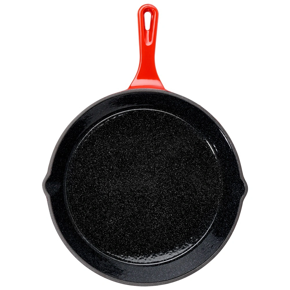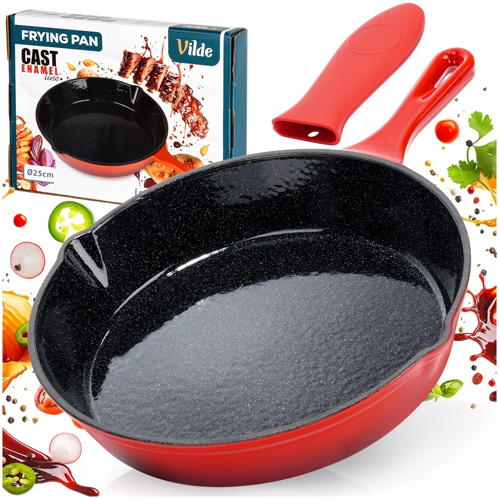 Robustna litoželezna ponev s premerom 25 cm z črno neprijemljivo emajlirano notranjo plastjo in rdečo zunanjostjo. Ponuja enakomerno porazdelitev toplote, dolgotrajno zadrževanje temperature in je primerna za plin, elektriko, keramiko in indukcijo, za pečico in žar. Priložen je silikonski nastavek za ročaj za varno prenašanje ter dva izliva za enostavno serviranje.