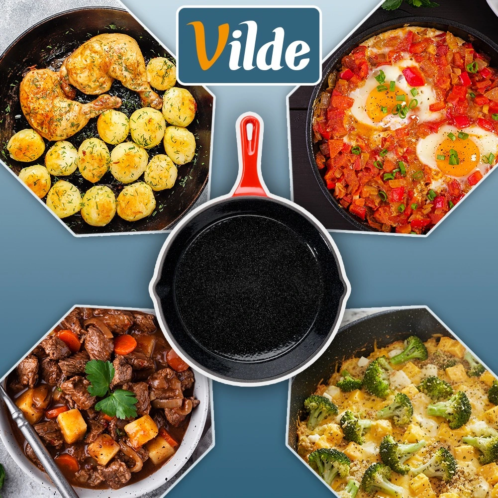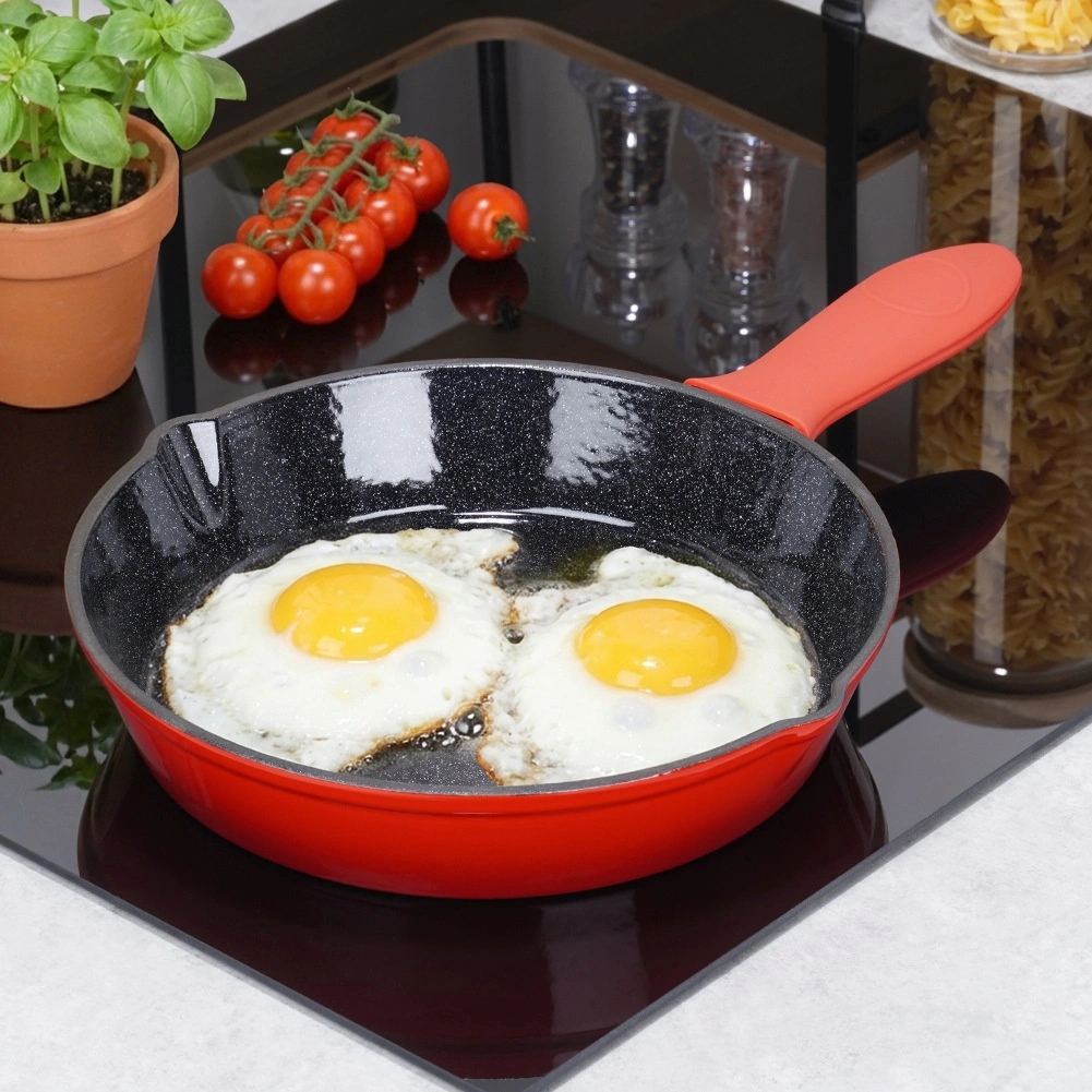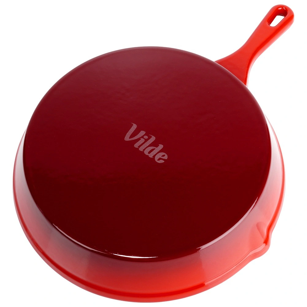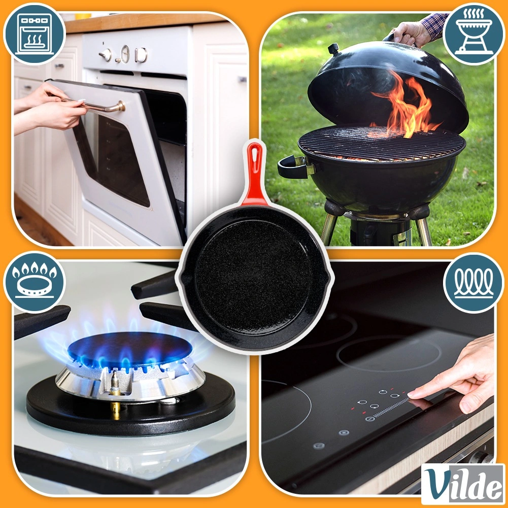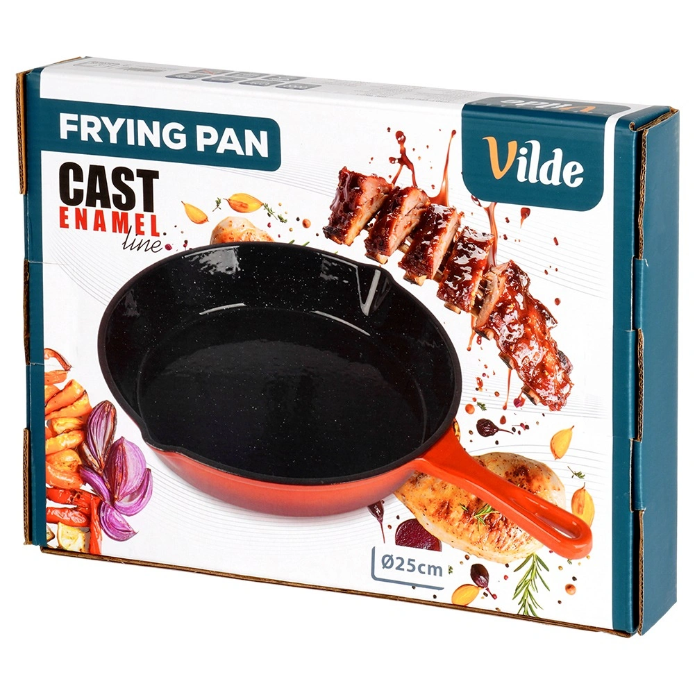 Robustna litoželezna ponev s premerom 25 cm z črno neprijemljivo emajlirano notranjo plastjo in rdečo zunanjostjo. Ponuja enakomerno porazdelitev toplote, dolgotrajno zadrževanje temperature in je primerna za plin, elektriko, keramiko in indukcijo, za pečico in žar. Priložen je silikonski nastavek za ročaj za varno prenašanje ter dva izliva za enostavno serviranje.