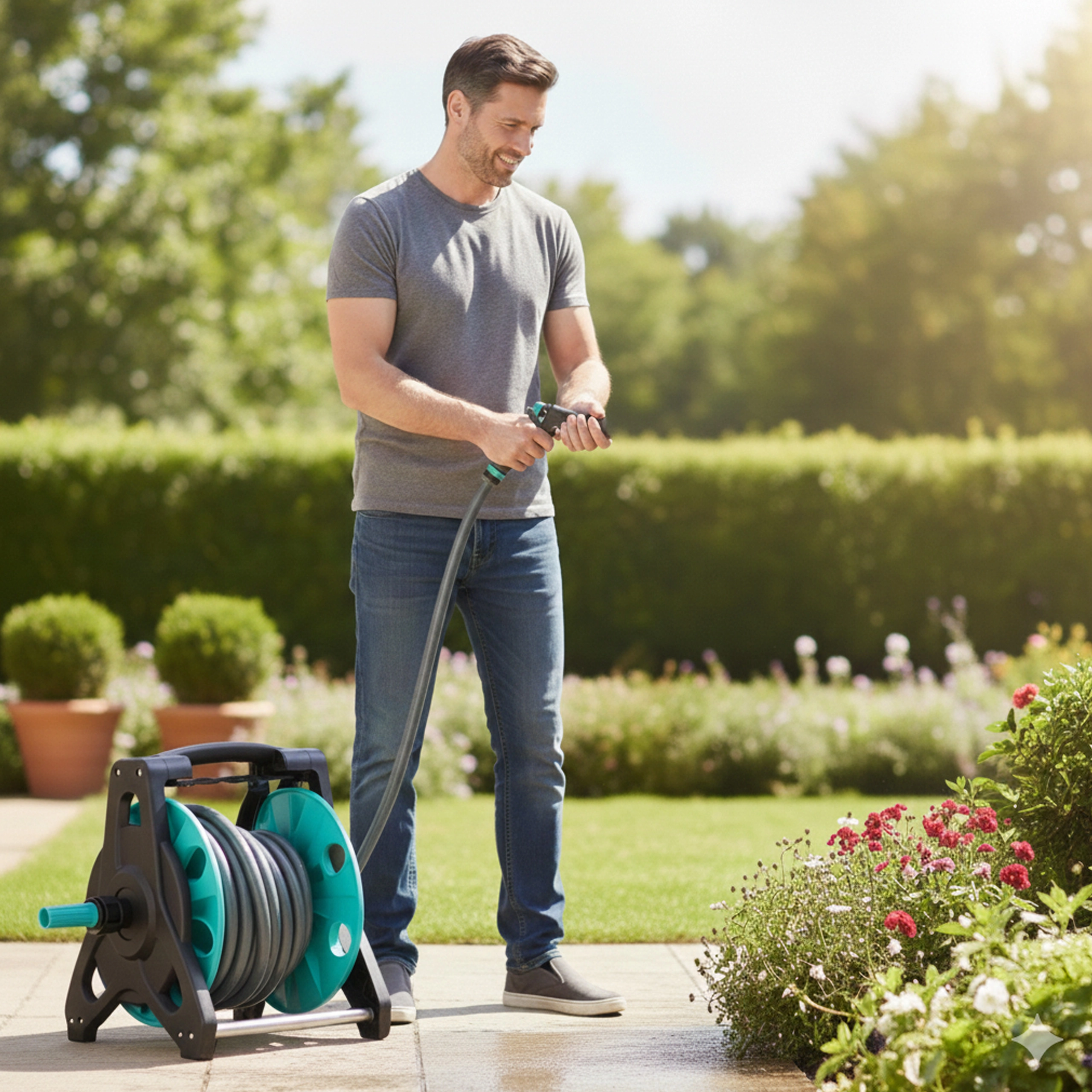 Ta popoln namakalni set združuje 30-metrsko vrtno cev z trdnim stojalom in kolutom za hitro navijanje. Zaradi kompaktnih dimenzij in zložljive ročice prihrani prostor, medtem ko udobno prenašanje olajša delo okoli doma in vrta. Multifunkcijska pištola ponuja natančno nastavitev curka od nežne megle do močnejšega pršenja.