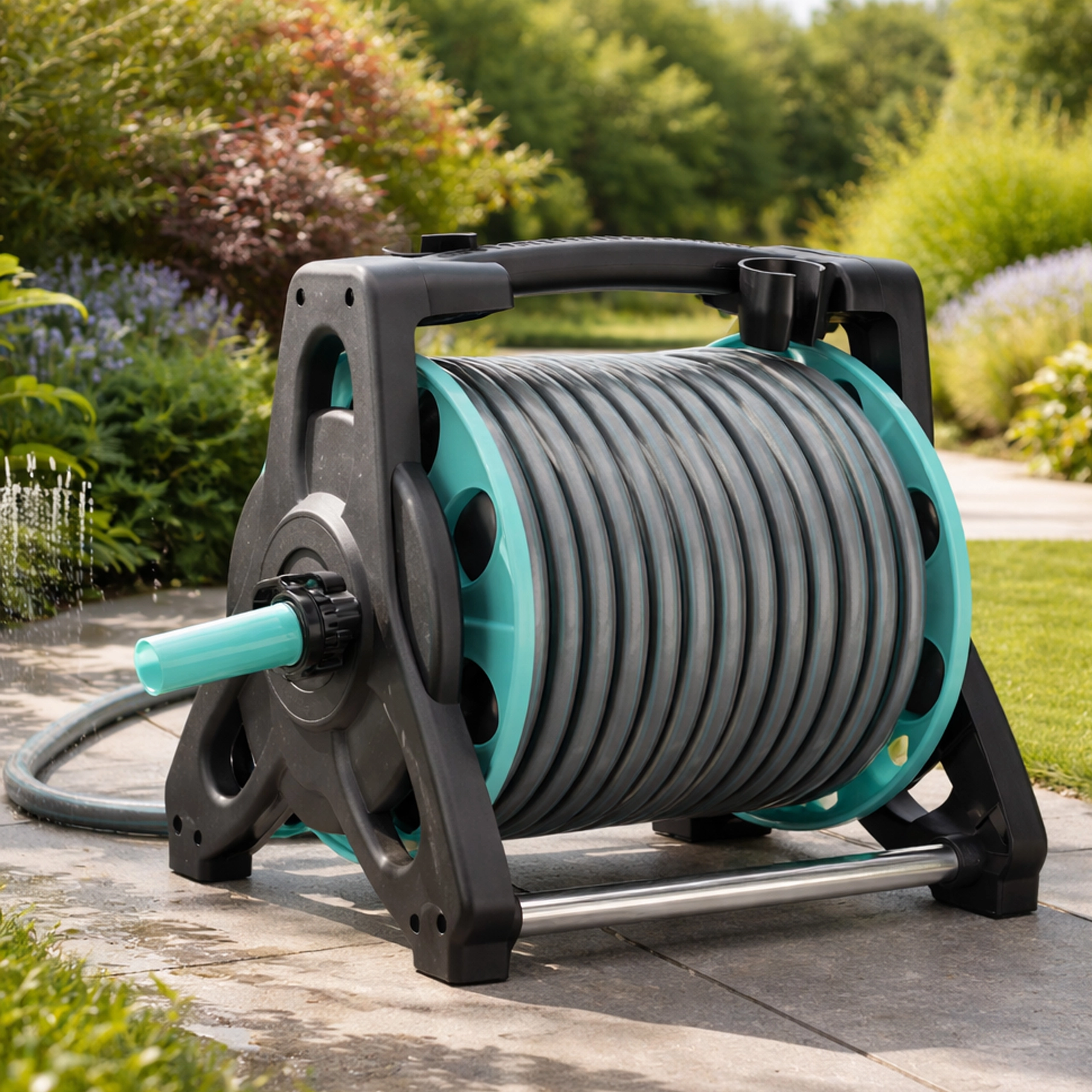 Stabilen okvir s kolutom in ročico zagotavlja hitro navijanje in kompaktno shranjevanje cevi. Zložljiv ročaj prihrani prostor pri shranjevanju in prenašanju.