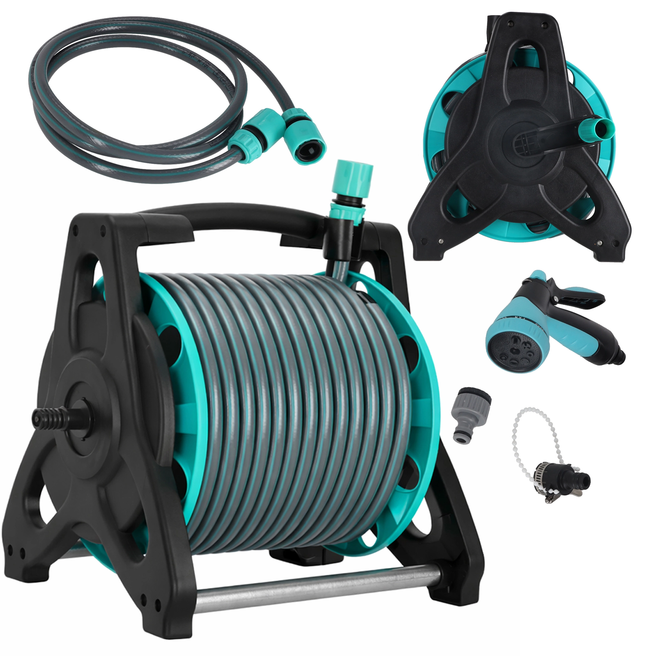 V kompletu je vse, kar potrebujete za takojšnjo uporabo: 2 m dovodna cev, hitre spojke, adapterji in pipa priključek. Kolut ohranja cev brez zvijanja in lomljenja, zato je zalivanje hitrejše, čistejše in učinkovitejše.