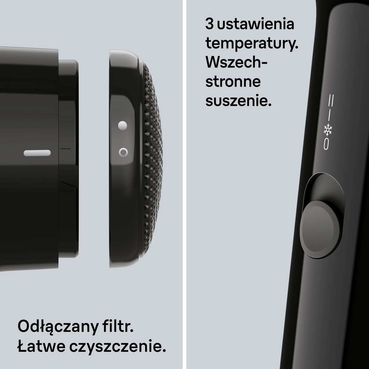 Ergonomski ročaj in pregledno upravljanje olajšata uporabo, več stopenj zračnega pretoka in temperature pa omogoča prilagoditev sušenja vašemu tipu las. Funkcija hladnega zraka pomaga fiksirati končno pričesko in ji doda lesk.