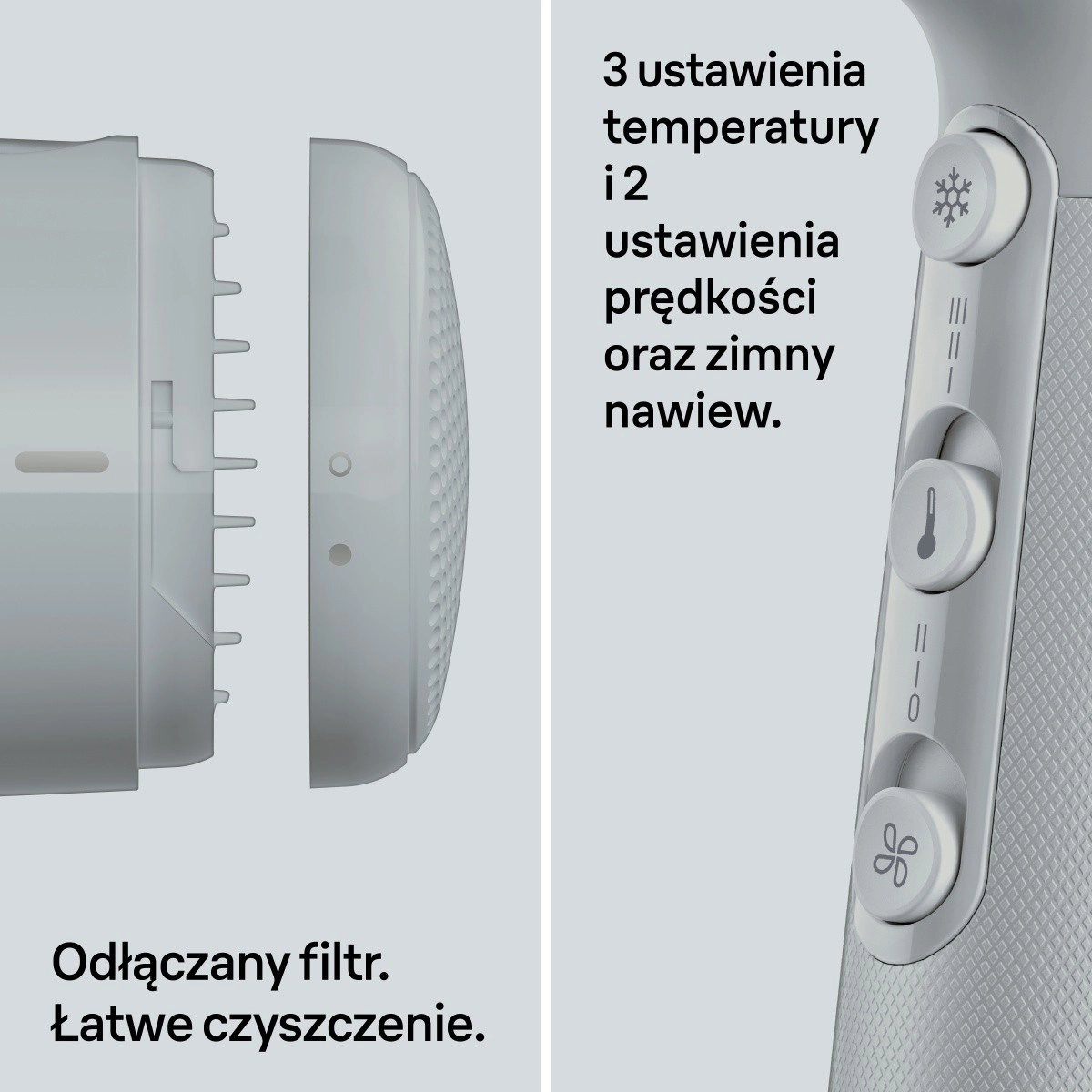 Kompaktna ergonomična zasnova, več stopenj temperature in hitrosti ter gumb za hladen zrak za popolno nastavitev sušenja.