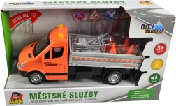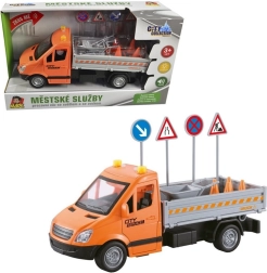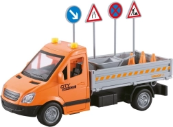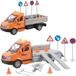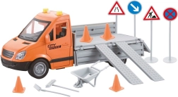 Del pakiranja so prometni stožci, znaki, pregrade in drobno orodje, s katerimi otroci zlahka ustvarijo svoje gradbišče ali zaporo ceste. Robustna plastična izdelava je varna in primerna za vsakodnevno igro.