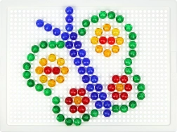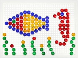 V kompletu najdete trdno plastično mrežo velikosti 21 × 16 cm ter 140 klobučkov premera 10 mm – ravno prav za otroško ročico. Mozaika ne vsebuje predlog, zato naravno spodbuja prosto kreativnost in samostojno izmišljanje motivov.