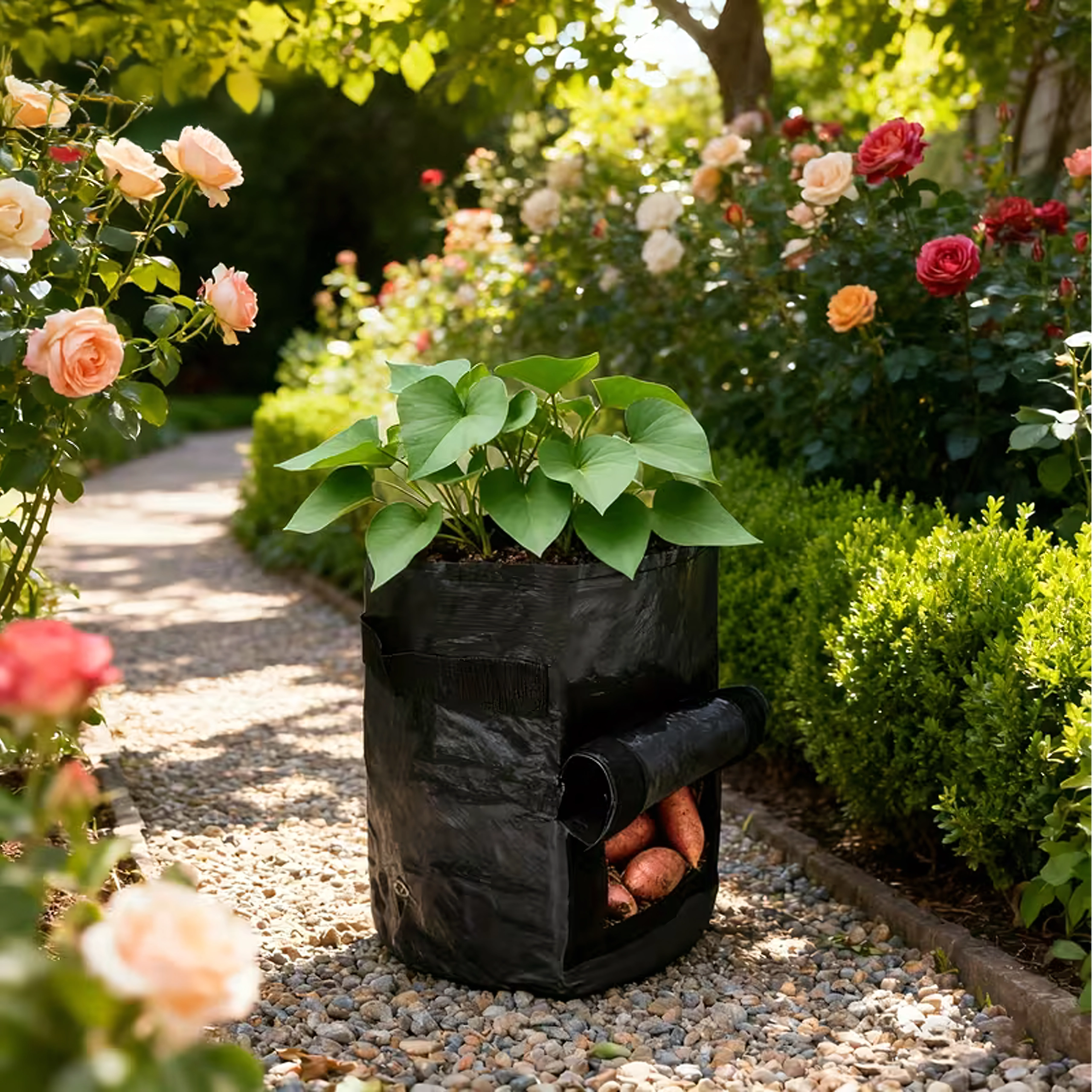 Robustna, zračna netkana tekstilija podpira kroženje zraka, preprečuje prekomerno zamočenost in pregrevanje korenin. Praktični ročaji za prenašanje poenostavijo rokovanje na vrtu, balkonu in v rastlinjaku. Vrečo preprosto zložite in izven sezone ne zavzame veliko prostora.
