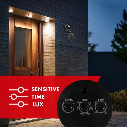 Zanesljiv senzor gibanja in somraka omogoča udobno in varčno upravljanje luči na hodnikih, v vežah, garaži ali na pokriti terasi. Zahvaljujoč širokemu kotu zaznavanja 180° in nastavljivemu dosegu 5–12 m natančno prilagodite pokritost konkretnim razmeram. Vrtljiva glava omogoča fino nastavitev smeri zaznavanja, s čimer zmanjšate neželeno preklapljanje.