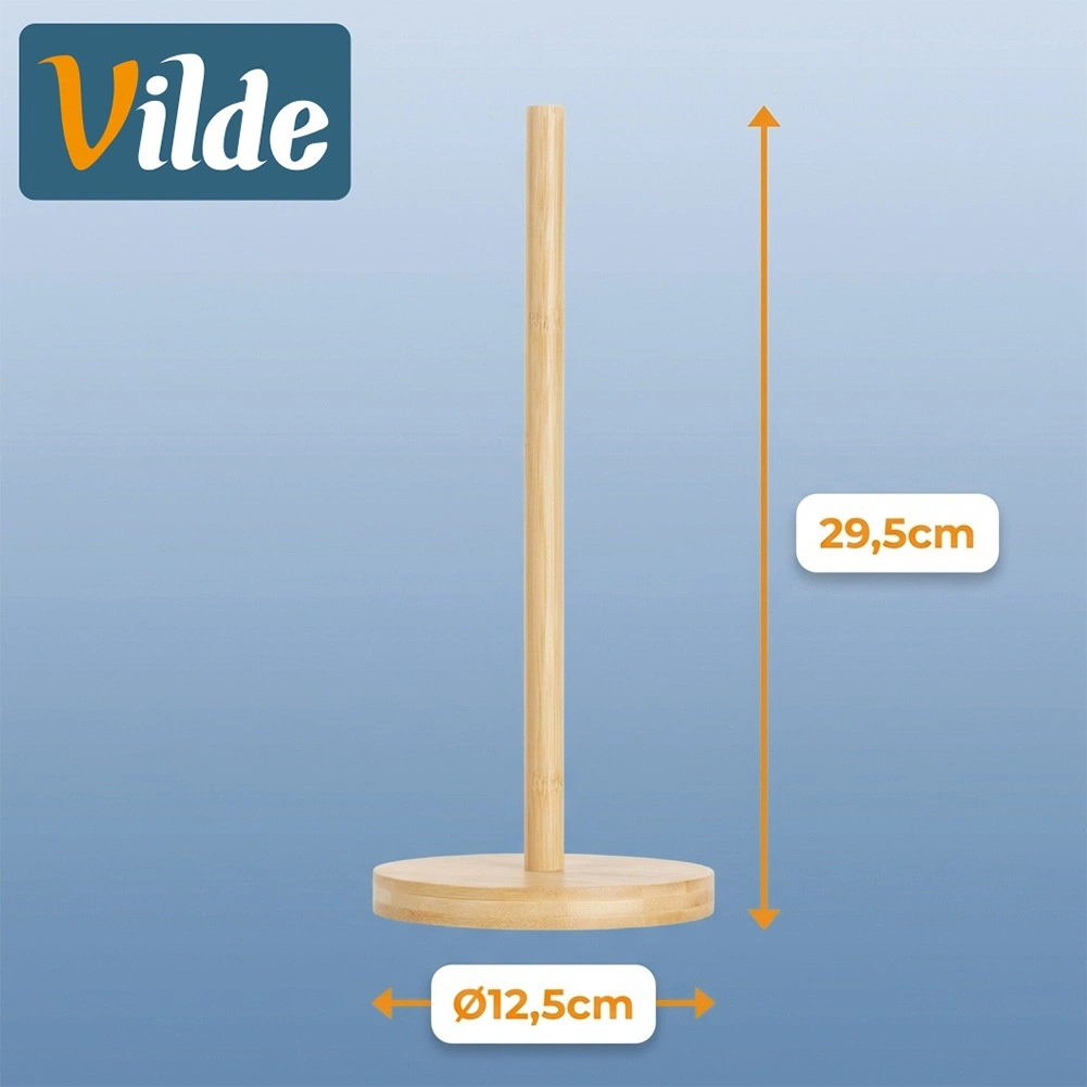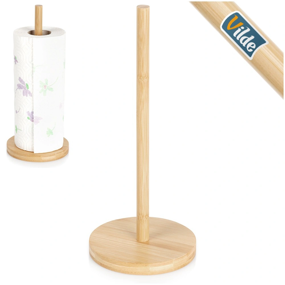 Elegantno in trpežno stojalo iz naravnega bambusa je odličen pomočnik za vsako kuhinjo, pisarno ali kopalnico. Zahvaljujoč univerzalni velikosti sprejme kratke in daljše rolice, zavzame malo prostora in zaradi stabilnega podnožja čvrsto stoji na delovni površini.