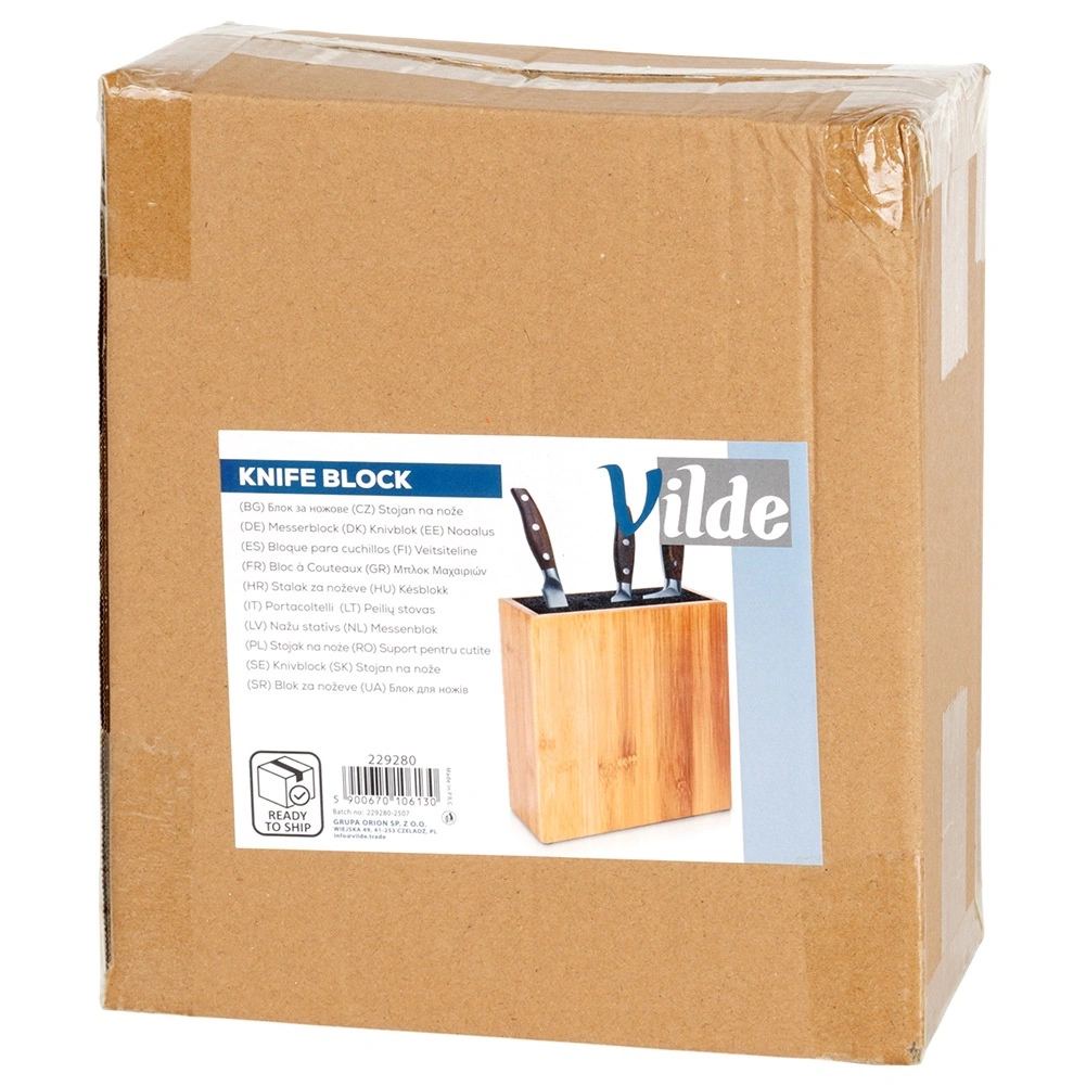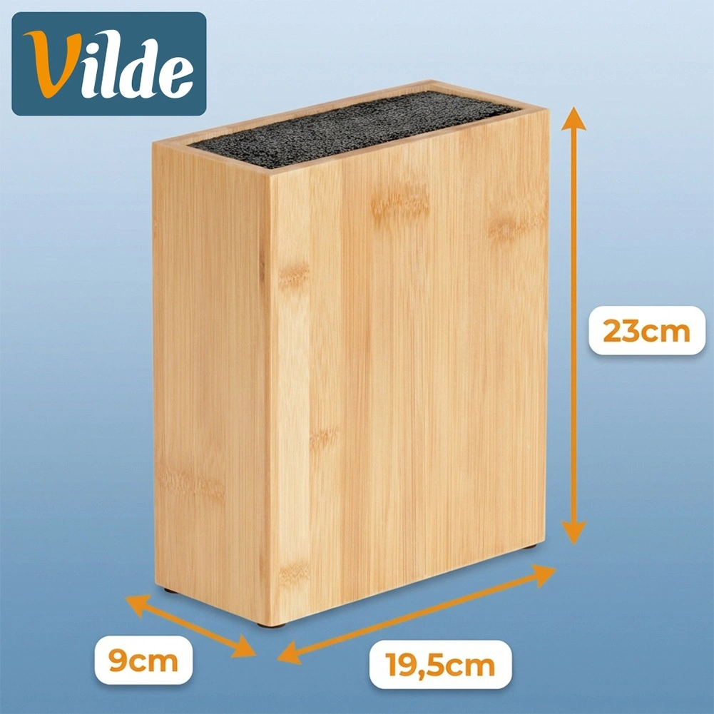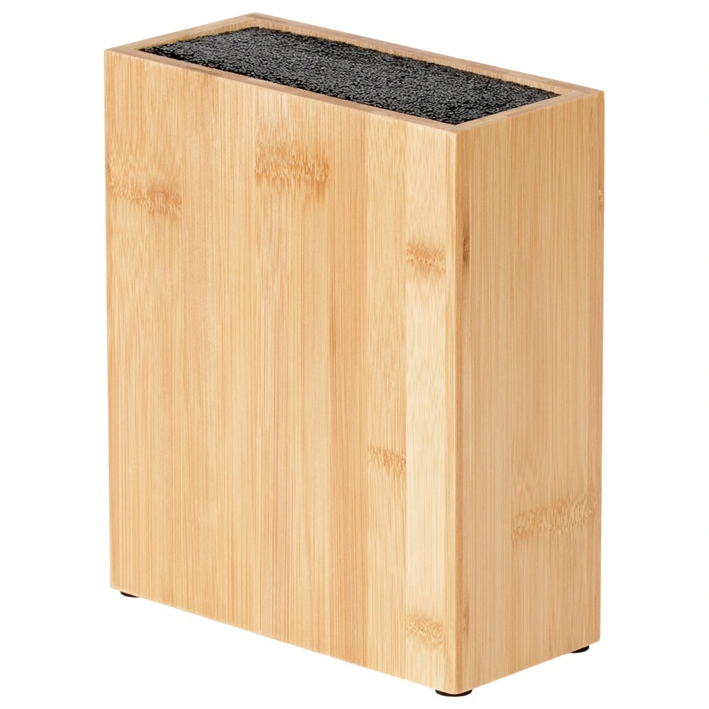 Univerzalen bambusov blok za nože z merami 19,5 × 9 × 23 cm za varno in pregledno shranjevanje kuhinjskih nožev in pripomočkov. Zahvaljujoč odstranljivi plastični ščetinasti vložki sprejme nože različnih velikosti in oblik brez poškodovanja rezila. Vzdržljiv bambus doda kuhinji naravno eleganco, protizdrsne filc podloge pa zagotavljajo stabilnost na delovni površini.